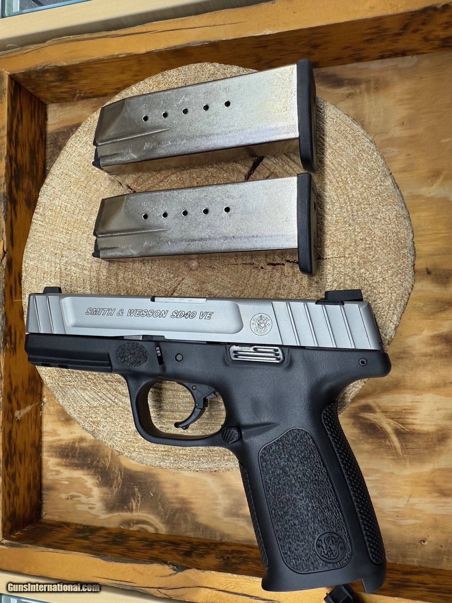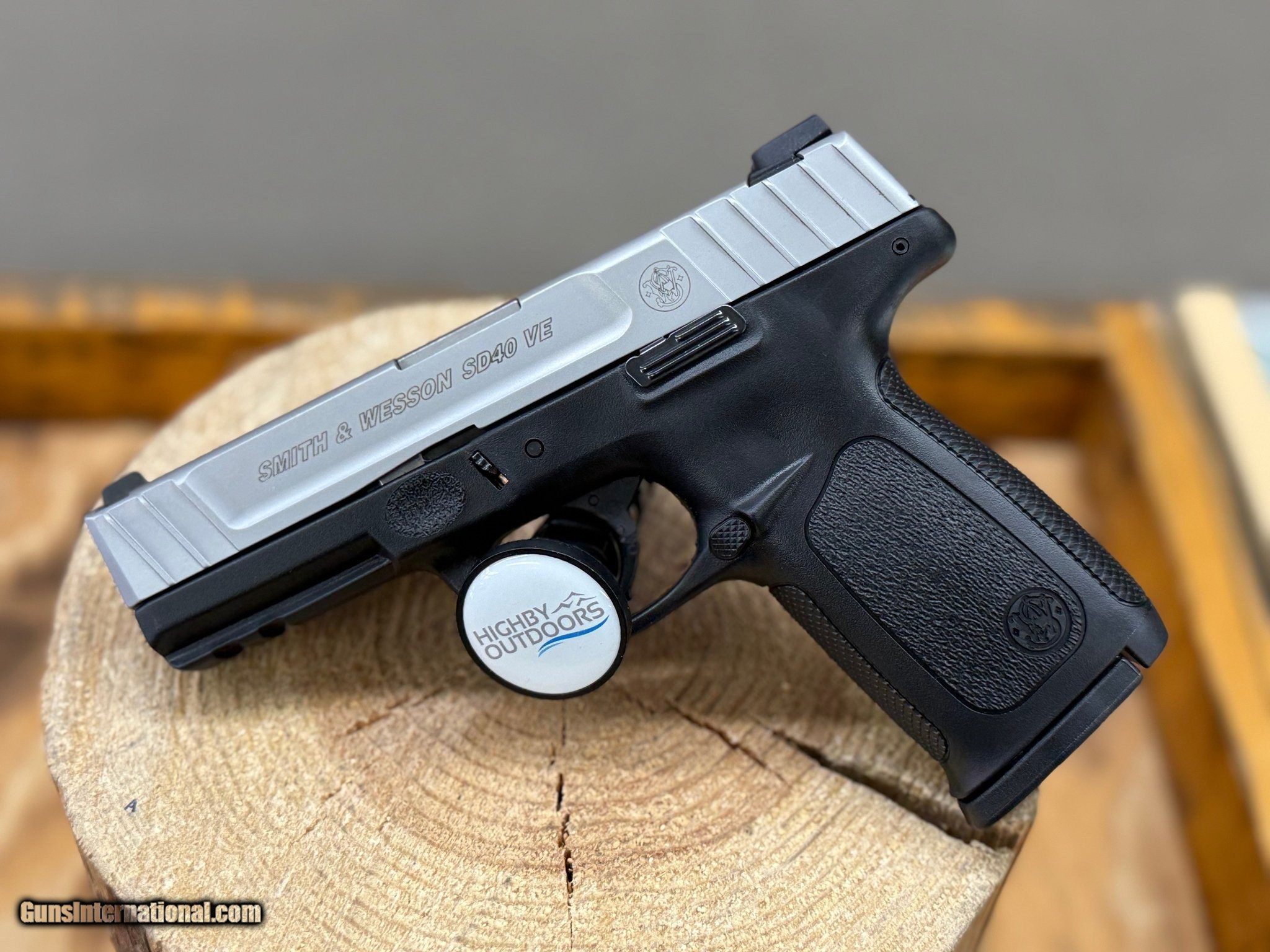 Description: Guns Listing ID: 571217 Pre-Owned Smith & Wesson SD40 VE Semi-Auto Pistol - Absolutely No Rust, Pitting or Scratches - Gun is in VERY GOOD Condition - Gun Has Seen Very Limited Use This S&W SD40 VE chambered in 40 S&W is in VERY GOOD. There is NO rust or pitting. NO scratches or rubs on barrel, frame or grips. Bore is smooth and clean. Only visible marks are a couple very minor scuffs. Stainless Steel Slide and Barrel. Three dot sights. This pistol comes with two 14-Round magazines, and original S&W factory box. SPECIFICATIONS: Handgun Caliber: .40 S&W Manufacturer: Smith & Wesson Model: SD40 VE Serial Number: HEF2148 Condition: VERY GOOD Metal Condition: VERY GOOD Grip Condition: VERY GOOD Bore Condition: EXCELLENT Action: Semi-Auto DAO Barrel Length: 4\" Barrel Description: Stainless Twist: 1:8.75" Trigger: Flat Face Frame Material: Polymer Finish: Satin Stainless/Black Polymer Sights: Three Dot/Rear Windage Adjustable Safety: No Magazine Capacity: 14 Rounds (2 included) Grip : Textured Black Polymer Weight: 22.7 OZ. SOLD Manufacturer: SMITH & WESSON Model: SD40 Caliber Info: .40 S&W Condition: Used - Non-Certified Barrels: 4" BARREL Action: SEMI AUTOMATIC Finish: satin stainless |
