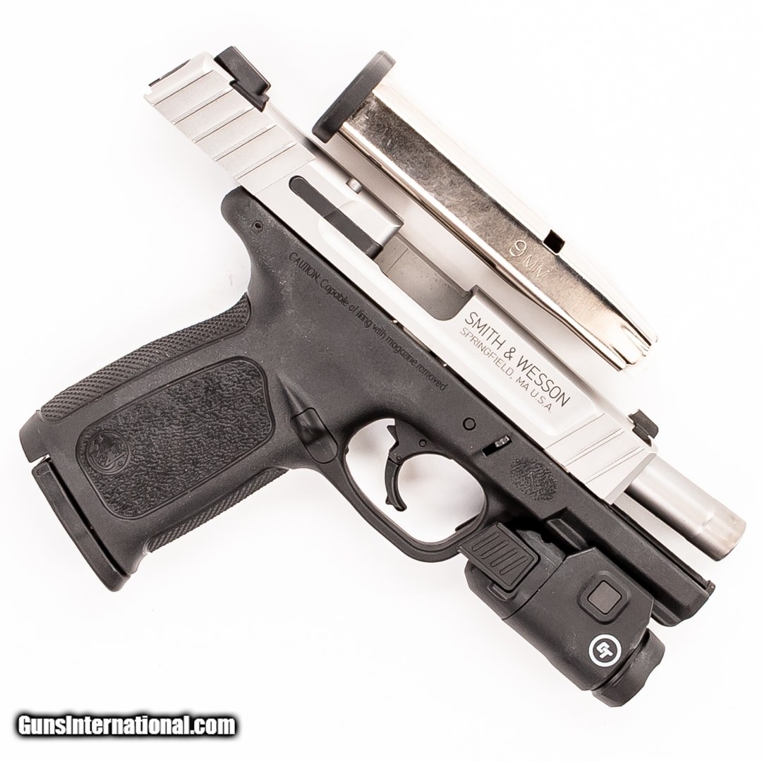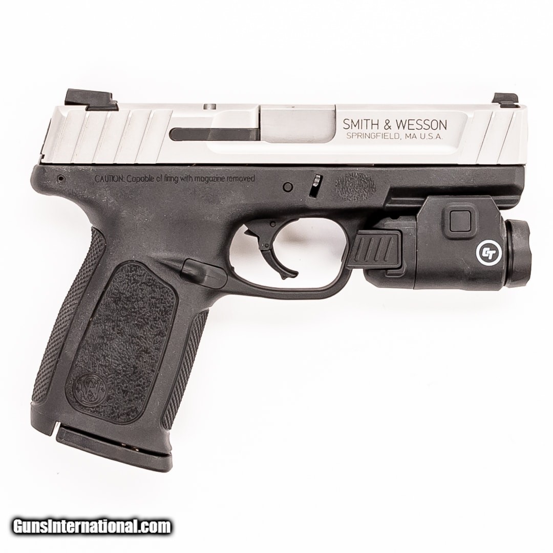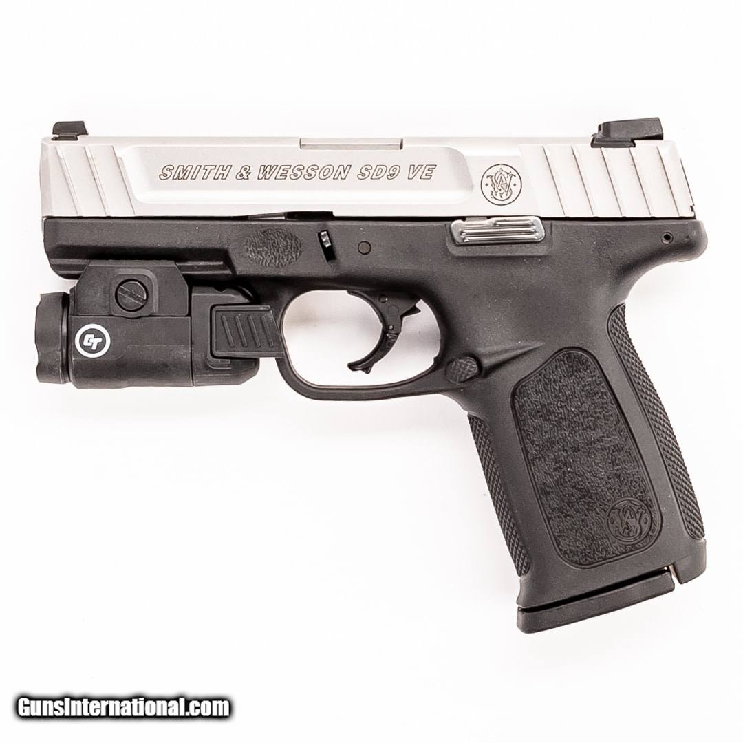 Description: Guns Listing ID: 394404 The Smith & Wesson SD9 VE (Self-Defense 9mm Value Enhanced) was designed to be an affordable yet dependable handgun that's well within the price range of just about anybody. Included with this purchase are 2-16 round magazines and a Crimson Trace tactical light. SOLD Manufacturer: SMITH & WESSON Model: SD9 VE Caliber Info: 9MM LUGER Condition: Used - Certified Barrels: 4 BARREL Finish: TWO-TONE STAINLESS |