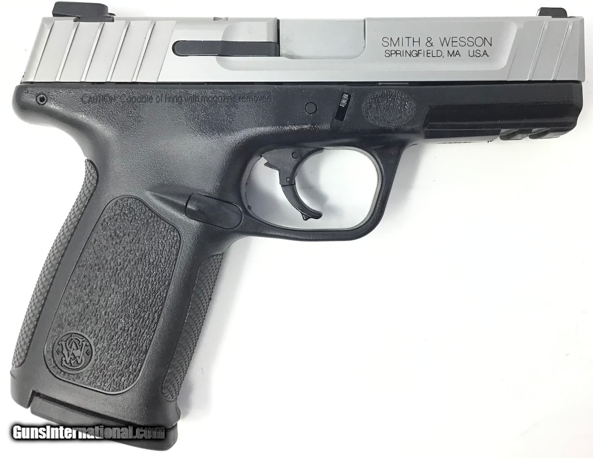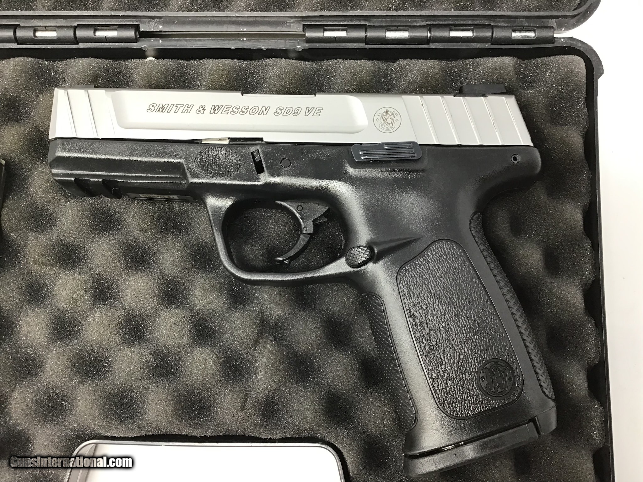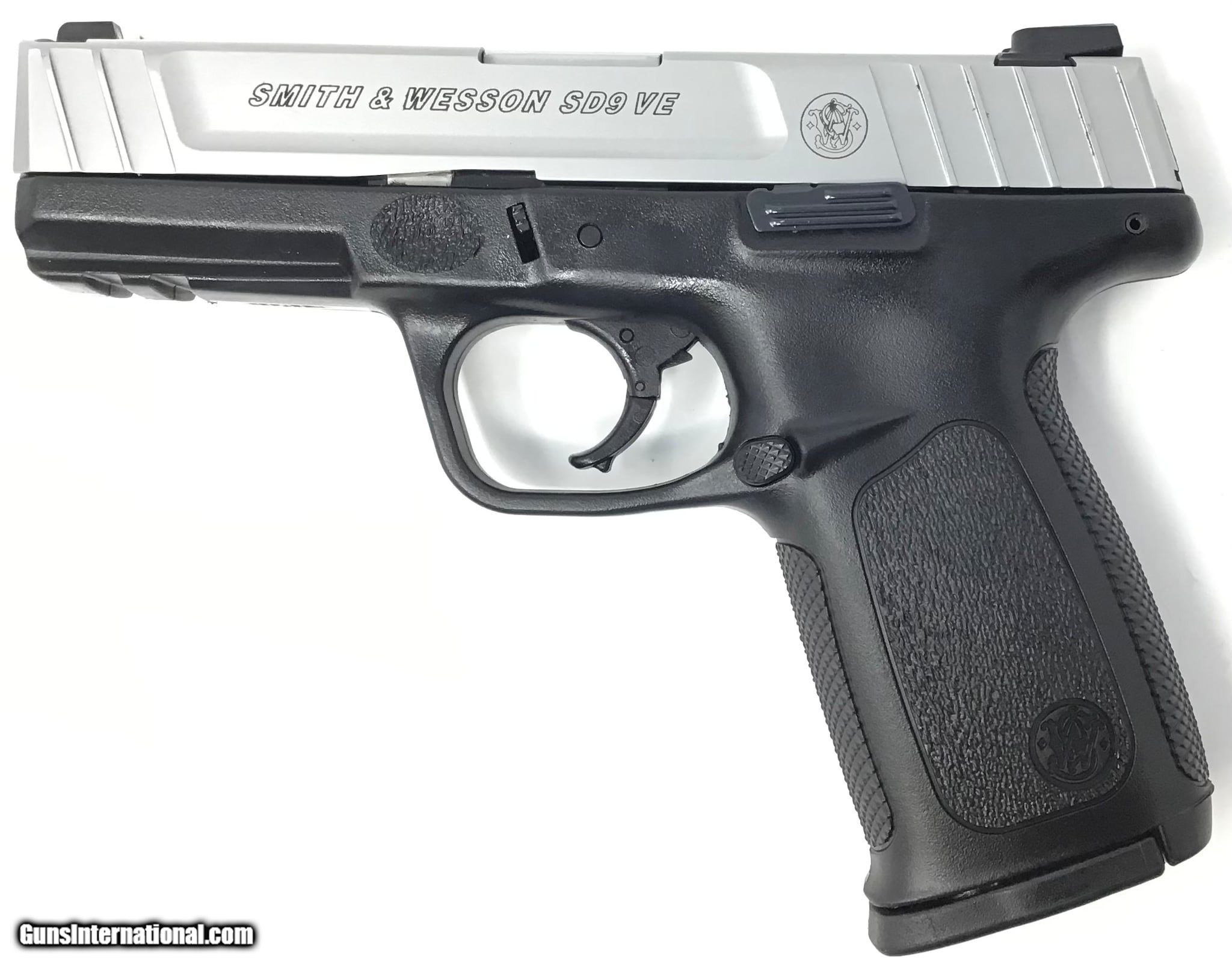 Description: Guns Listing ID: 569792 The Smith & Wesson SD9 VE 9mm Full-Sized 16-Round Pistol weighs a lightweight 22.7 oz. and features a polymer frame with a stainless-steel slide and barrel. The semiautomatic double-action pistol has a Picatinny rail and comes with two 16-round magazines. White-dot dovetail front and rear sights. SOLD Manufacturer: SMITH & WESSON Model: SD9 VE Caliber Info: 9 MM Condition: Used - Non-Certified Barrels: 4 BARREL Finish: TWO TONE BLACK AND S |