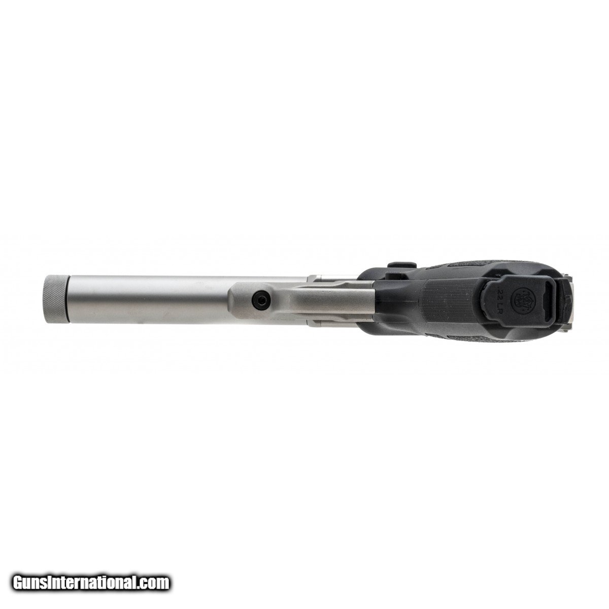 SN: UEN0488. Stainless rimfire pistol with 5.5 threaded barrel. Has adjustable rear sight, front fiber optic sight, manual thumb safety and 10rd magazine. Overall excellent condition. Comes with box and extra magazine.