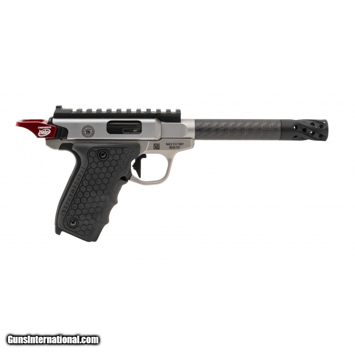SN: UEH5797. Modern production. .22 caliber target pistol made by Smith and Wesson. Features a low-weight, threaded carbon-fiber barrel ideal for mounting a muzzle device of your choice. Also comes fitted with an extended mag release, bolt pull and an optics rail.
