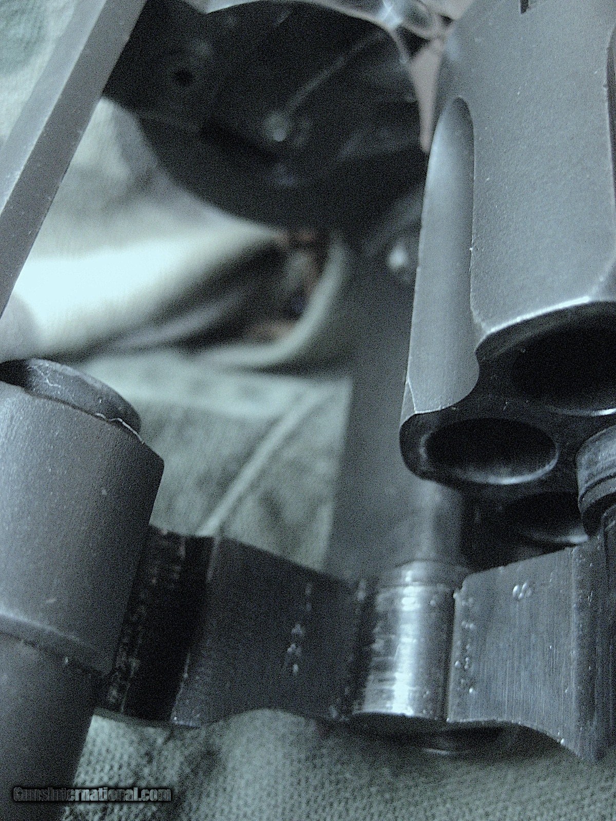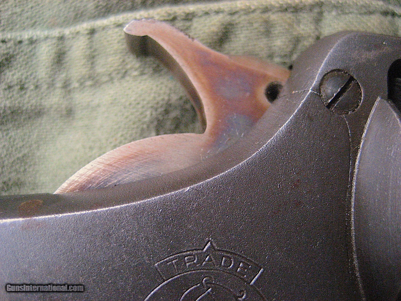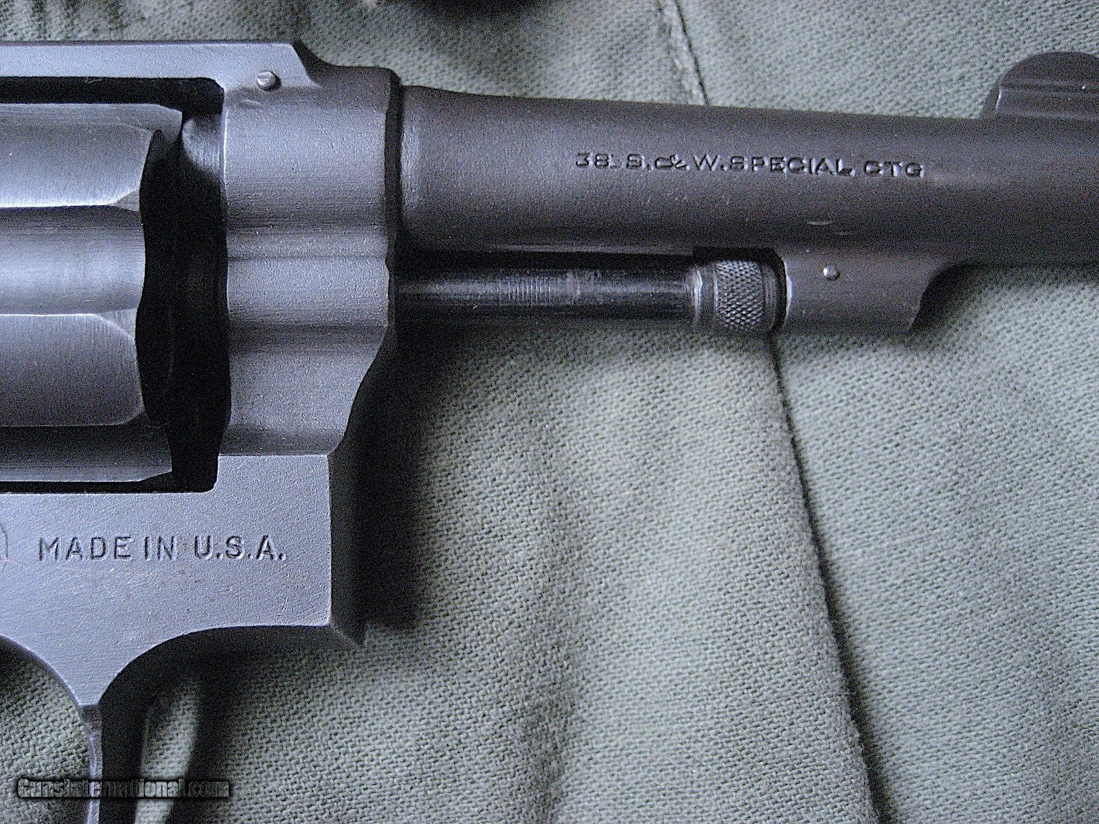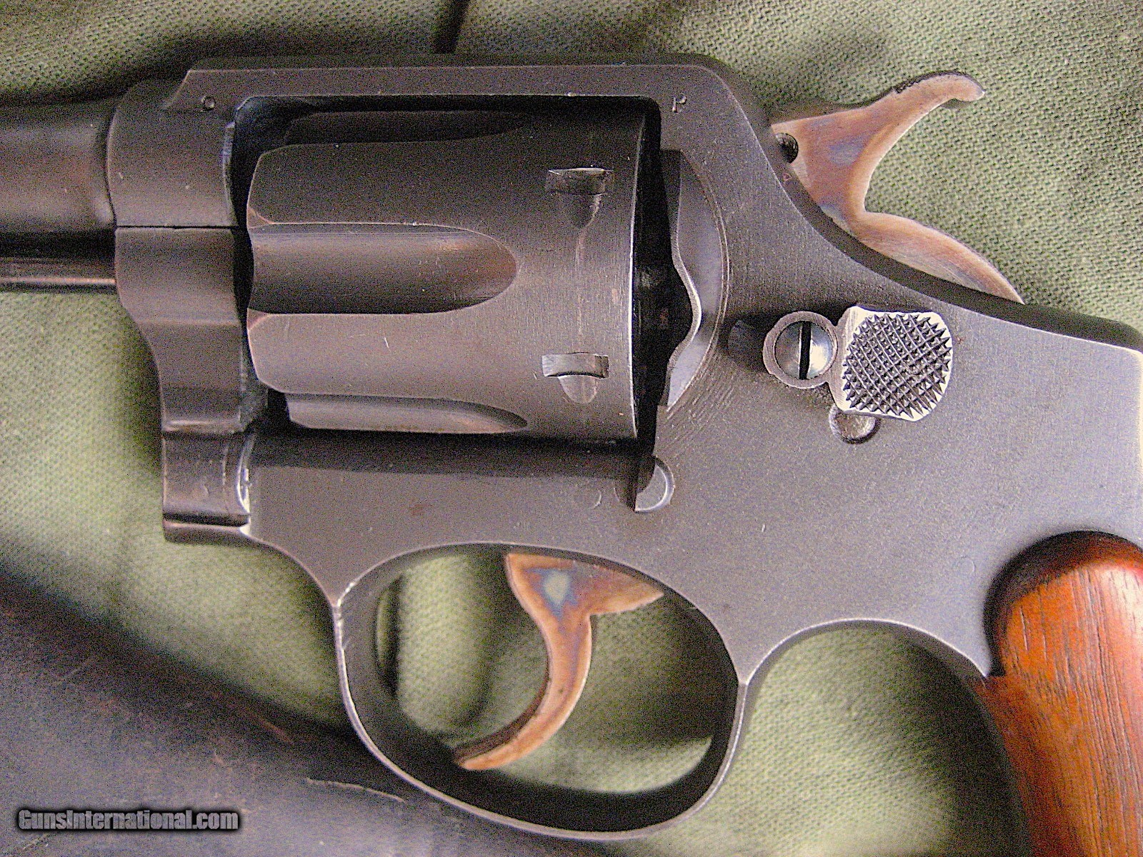 Description: Gently used Smith & Wesson Victory 38 S&W Revolver. The revolver shows little wear and tear. No cracks or chips. The finish is clean, the rifling deep and bore bright. The cylinder spins smoothly and locks up tight! This revolver is matching serial numbers of under Barrel, Cylinder and Grip. Crane and frame 32284. Hammer and trigger retain case hardening colors. Flaming bomb on grip butt toward front. Small wear spot on right frame above grip. Comes with original leather holster having WW II Style flap and brass snap. Marked US on front. R.I. A. amd W. S. stamped on back. All stitching and rivets intact and functional. SOLD Curio/Relic: Yes Manufacturer: Smith and Wesson Model: Victory Serial Number: V594782 Barrel Length: 4 inch Caliber Info: .38 S&W Special Bore: Bright Chambers: Excellent Ejectors: Fully functional Condition: Excellent Metal Condition: Very Good Wood Condition: Excellent Bore Condition: Excellent Plus Action: Revolver Triggers: Case hardened-Ribbed |