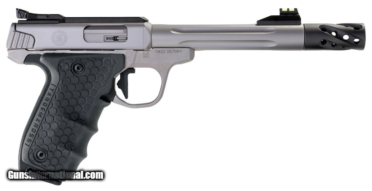 Description: Guns Listing ID: 41276 The Performance Center SW22 Victory Target pistols designed specifically for target shooting competitions. It features a stainless steel frame with target barrel with muzzle brake and flat face target trigger with an adjustable trigger stop. It utilizes adjustable fiber optic rear and fiber optic front sights extended magazine release button beveled magazine well and steel reinforced polymer thumb safety. The SW22 Victory Target also has Tandemkross hiveGrips\" with Target Thumbrest grip and includes a Picatinnystyle rail and two 2 10round magazines.This model has a 6\" fluted barrel stainless steel metal finish and black grip.\ SOLD Manufacturer: SMITH & WESSON Model: Performance Center Victory Target Caliber Info: .22 LR Condition: new Barrels: 6" barrel Finish: STAINLESS |