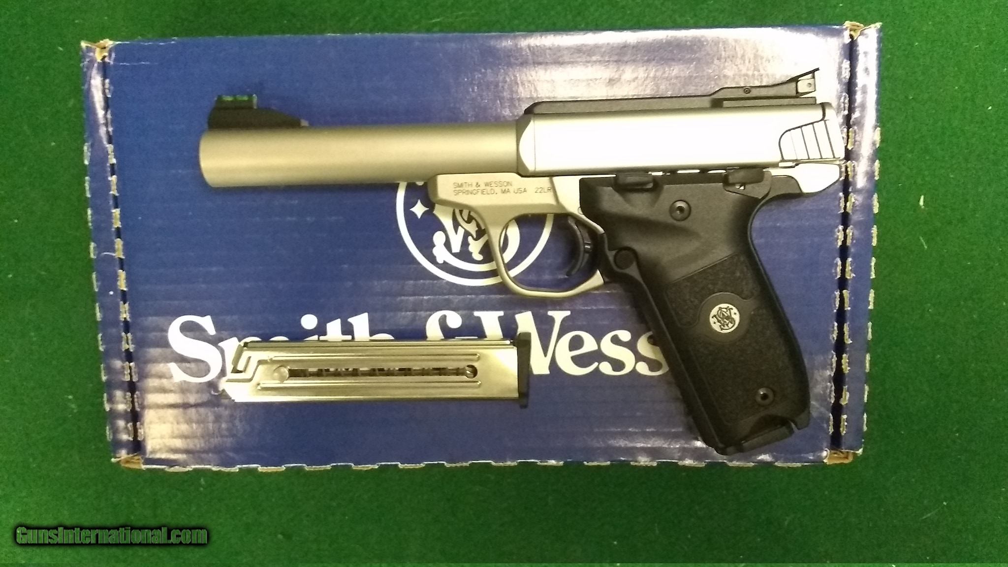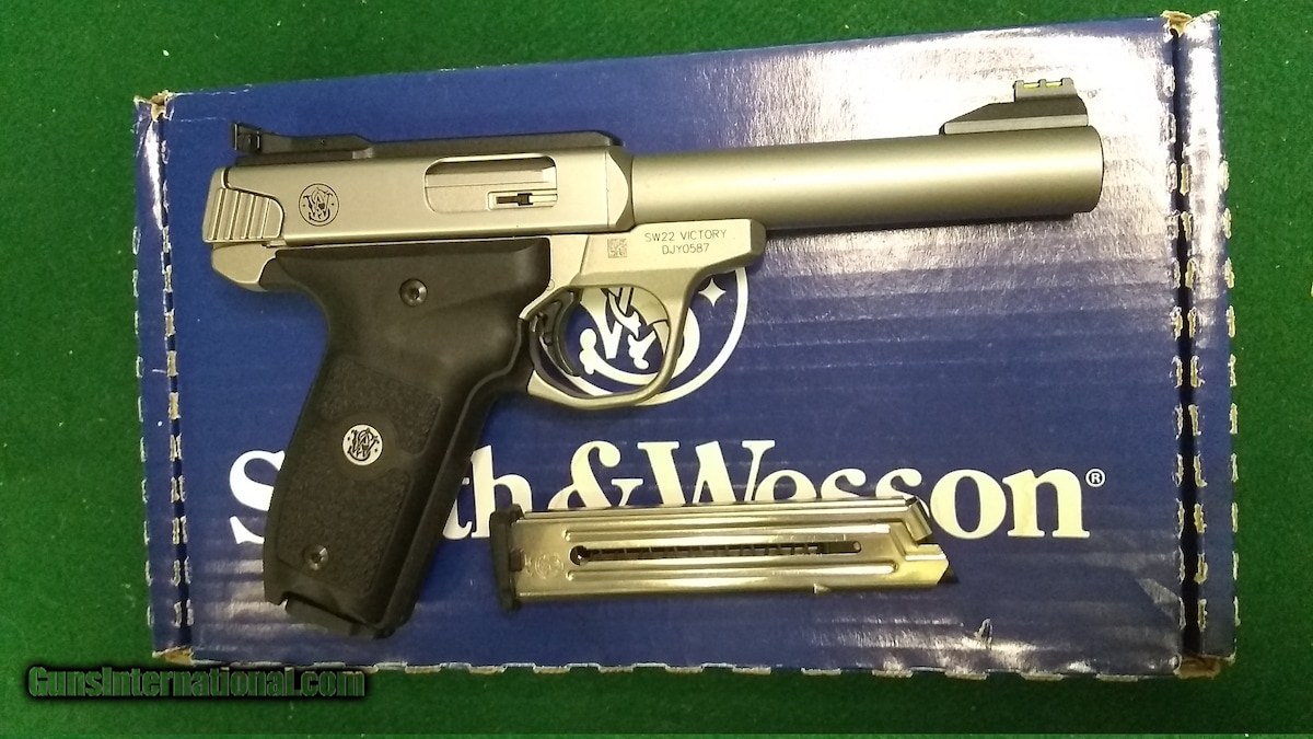 Description: Guns Listing ID: 495042 Smith & Wesson, SW22 Victory, Single Action Only, Semi-Automatic, Metal Frame Pistol, Full Size, 22LR, 5.5\" Barrel, Stainless Steel, Satin Finish, Adjustable Fiber Optic Front and Green Fiber Optic Rear Sights, Manual Thumb Safety, 10 Rounds, 2 Magazines - Condition is excellent. SOLD Manufacturer: SMITH & WESSON Model: SW22 VICTORY Caliber Info: .22 LR Condition: Used - Non-Certified Barrels: 5.5" barrel |