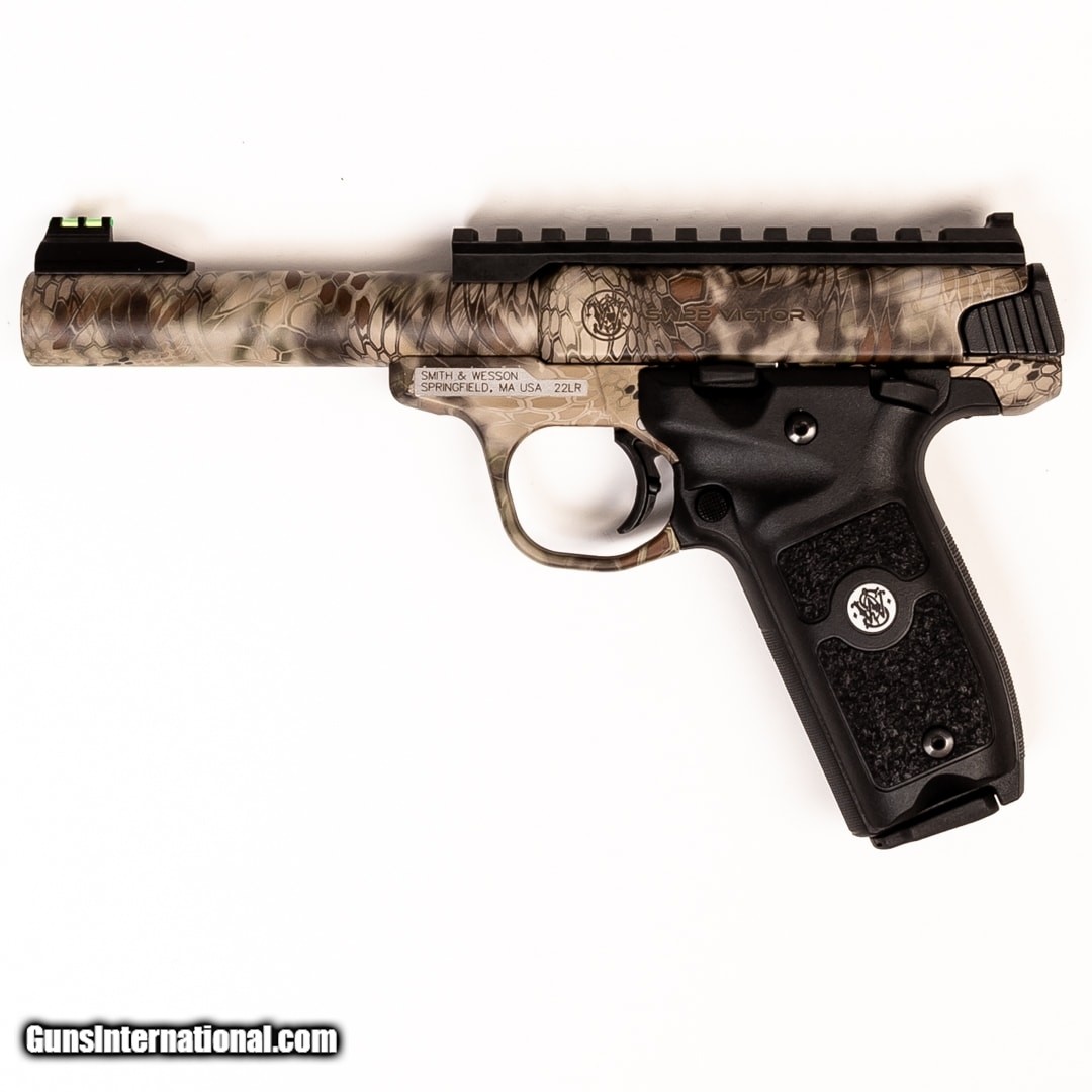 Description: Guns Listing ID: 537827 Smith & Wesson forged a path into the bull-barrel, blowback rimfire pistol market with the SW22 Victory. It offers a steel frame, slide, and barrel alongside exceptional controls and ergonomics. Take-down is quick and easy with the loosening of a single screw. Perfectly suited for range days, competition, hunting, or plinking, the SW22 Victory is a quality rimfire pistol wrapped up with an attractive price. This SW22 includes the original box and five 10-round magazines. SOLD Manufacturer: SMITH & WESSON Model: SW22 VICTORY Caliber Info: .22 LR Condition: Used - Certified Barrels: 5.5 BARREL Finish: CAMO |