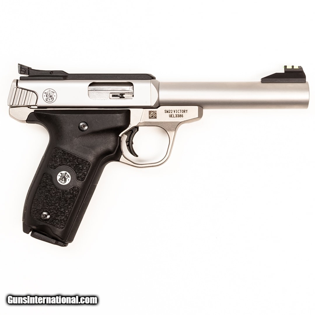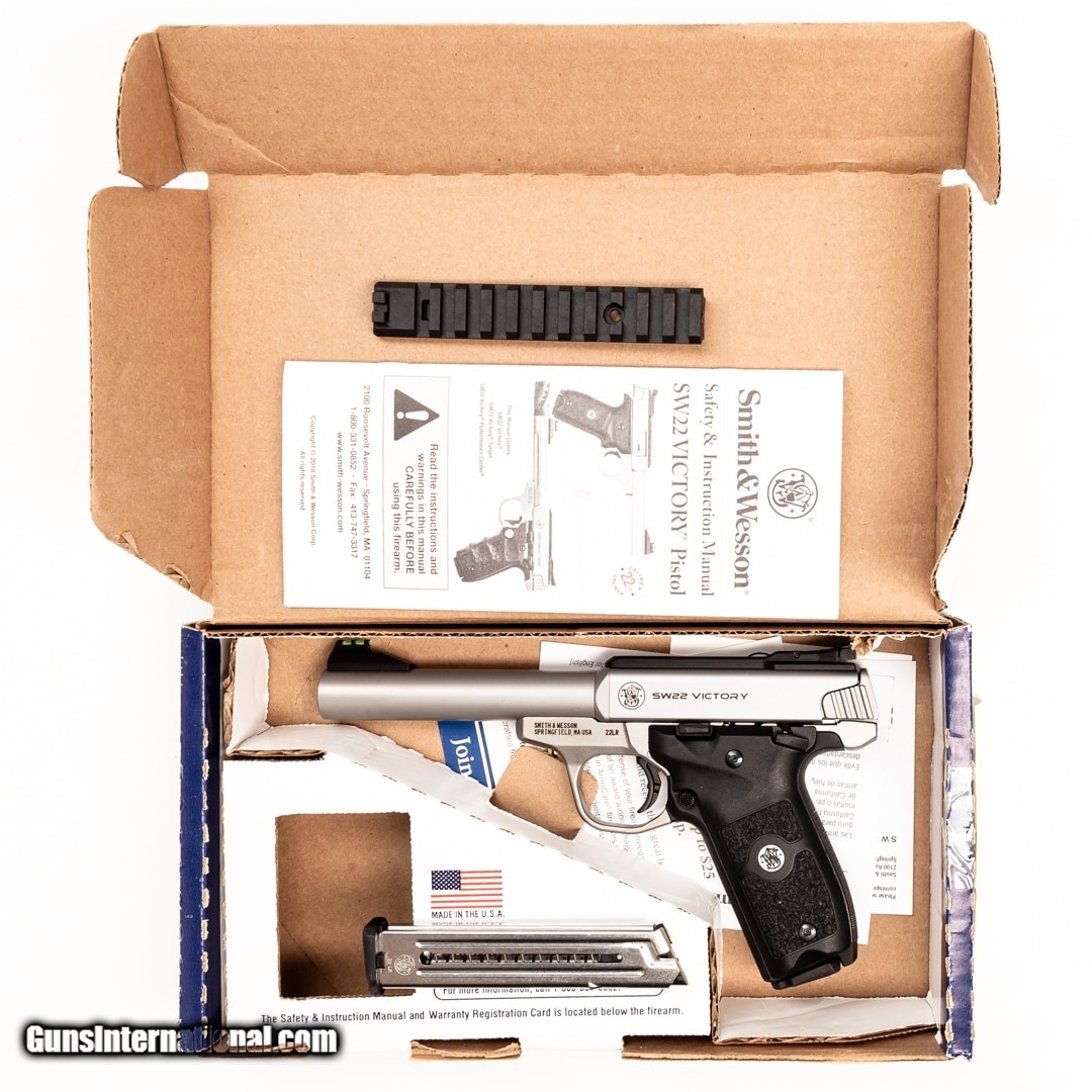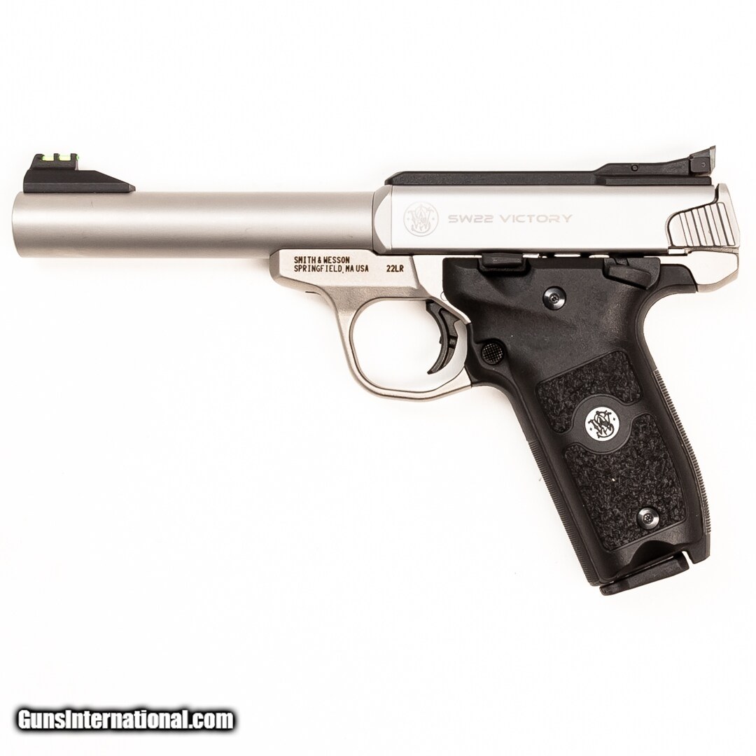 Description: Guns Listing ID: 909213 Smith & Wesson forged a path into the bull-barrel, blowback rimfire pistol market with the SW22 Victory. It offers a steel frame, slide, and barrel alongside exceptional controls and ergonomics. Take-down is quick and easy with the loosening of a single screw. Perfectly suited for range days, competition, hunting, or plinking, the SW22 Victory is a quality rimfire pistol wrapped up with an attractive price. This SW22 Victory features a safety and a magazine disconnect. Purchase includes the original box, owner‚‚s manual, and two 10-round magazines. Get the best bang for your buck when you get a Certified Used Firearm . When you see the Certified Used stamp on any of our firearms, you can be confident that you’re getting exactly what you want – a gun only in very good to excellent condition and held to the highest quality standard. All Certified Used Guns come with a ‘no questions asked’ return policy . PLUS, ALL CERTIFIED USED GUNS SHIP FREE SOLD Manufacturer: SMITH & WESSON Model: SW22 VICTORY Caliber Info: .22 LR Condition: Used - Certified Barrels: 5.4 BARREL Finish: STAINLESS |