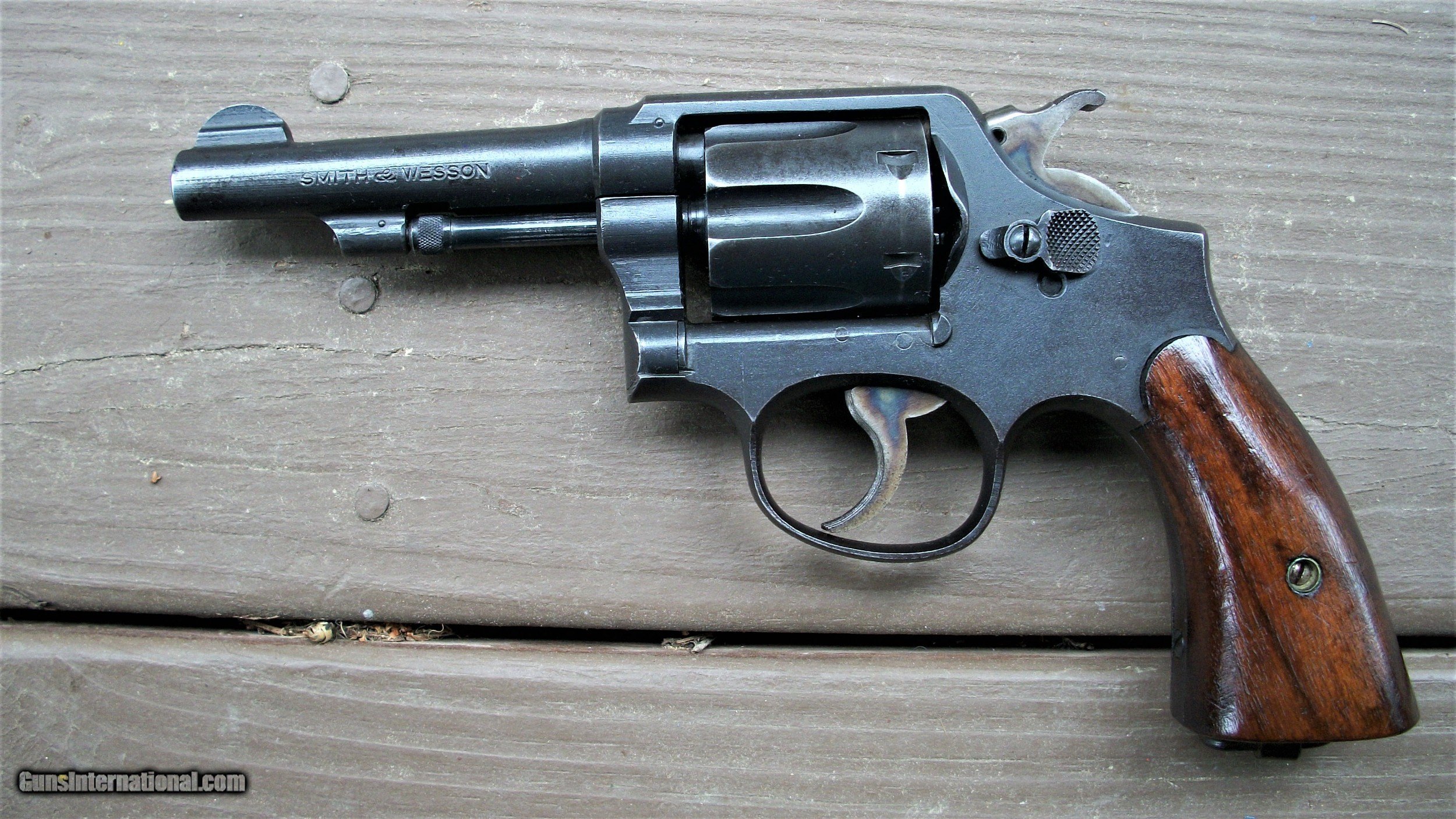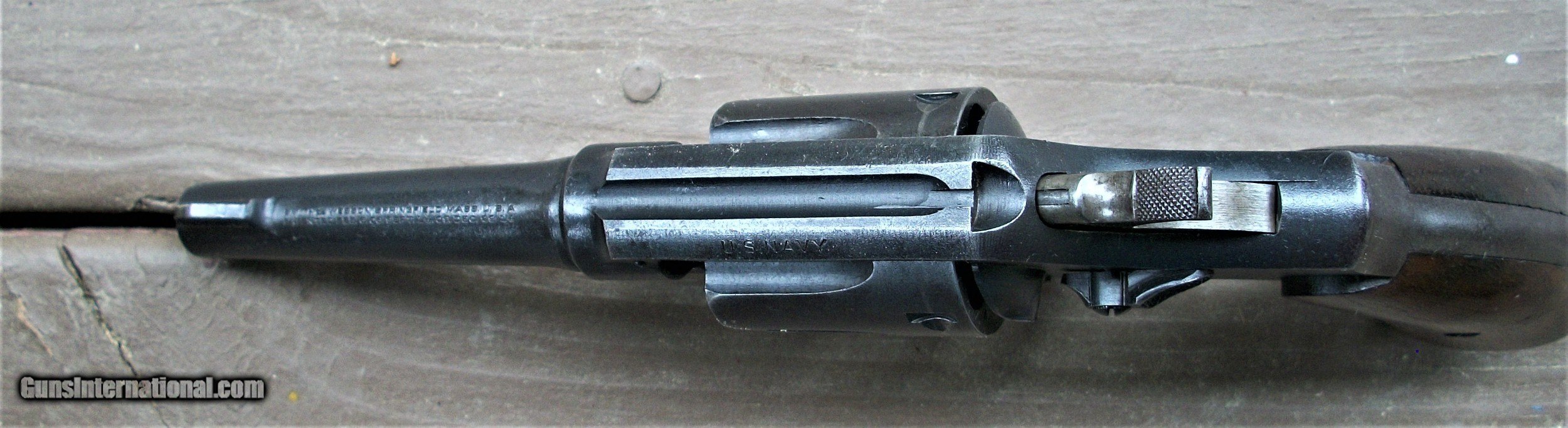 Description: This is a nice Victory model U.S. Navy stamped on the top of the frame backstrap. The gun is in very good/excellent condition with 90% finish remaining. The most wear is holster wear at the muszzle end of the barrel.. Chambers and bore are excellent.There is a D etched in the bottom of the grip panel. A very nice example of a WW2 Navy revolver. SOLD Handgun Caliber: .38 Special |