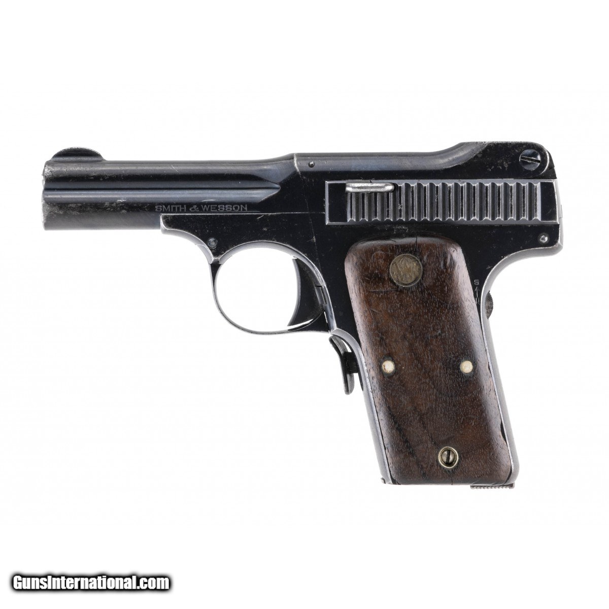 Description: " Early Smith & Wesson auto. Metal has approximately 92% original finish with some holster wear. Bore is excellent. Left grip has a minor crack by S&W logo and bottom grip screw. Very good overall condition. SOLD Curio/Relic: Yes |