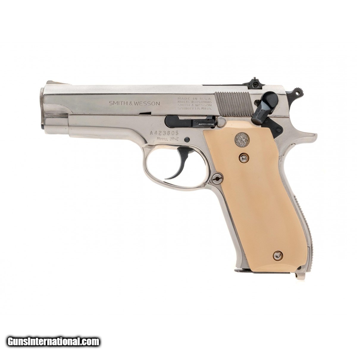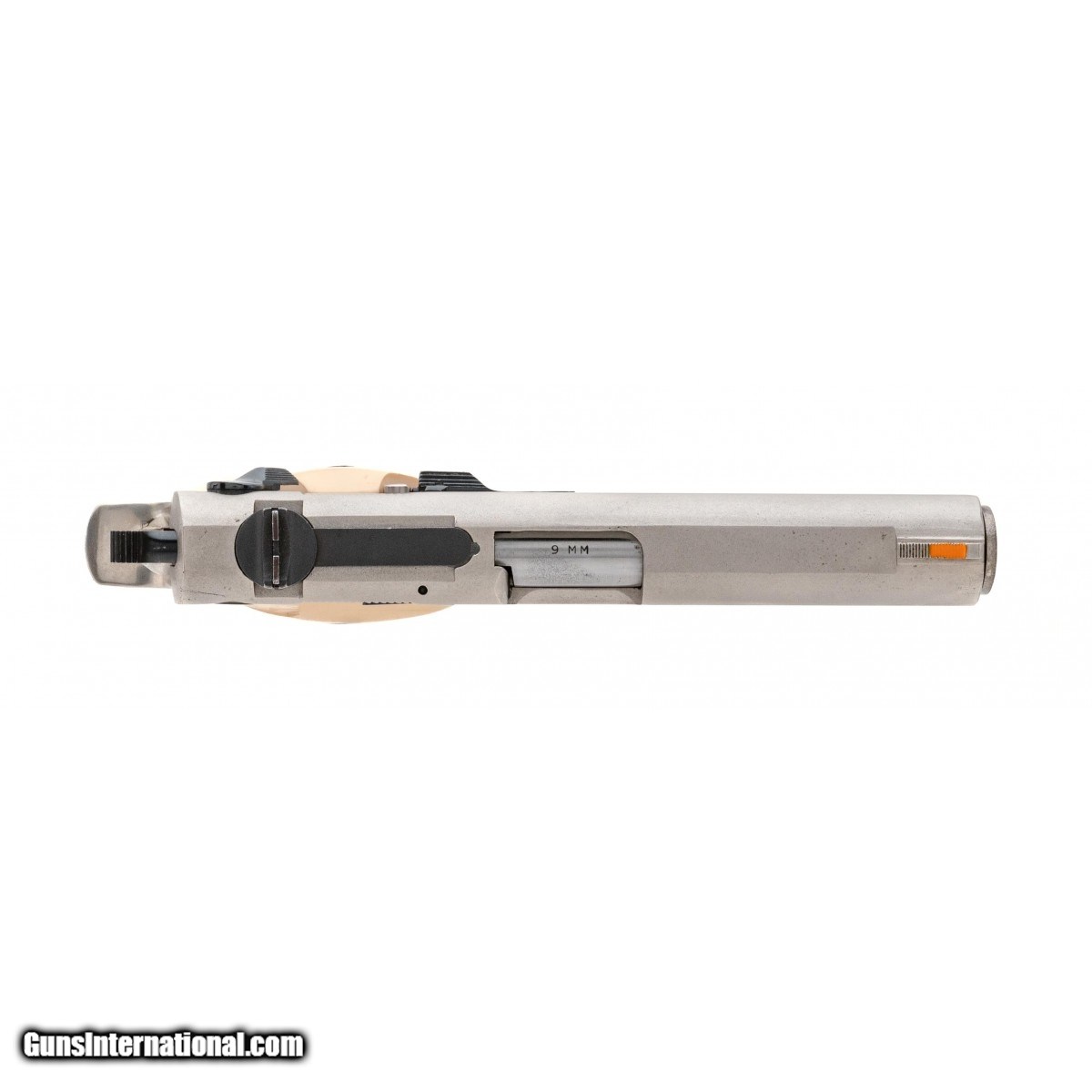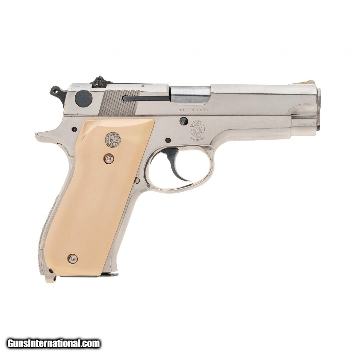 SN: A423805.1970's production 9mm with a 4"" barrel. Bore is excellent. 1st Gen auto with nickel finish. Has fancy faux ivory grips. Very good condition overall.