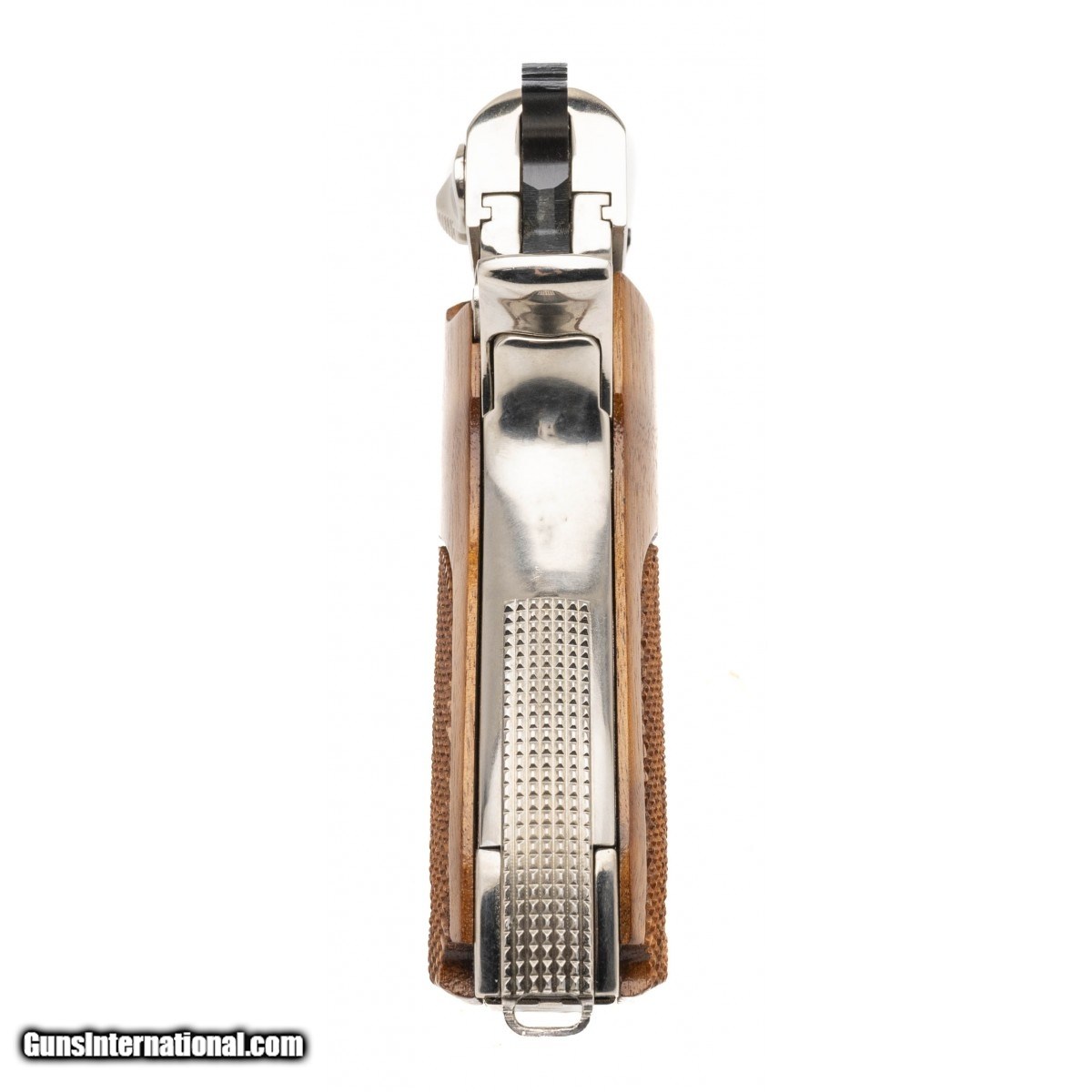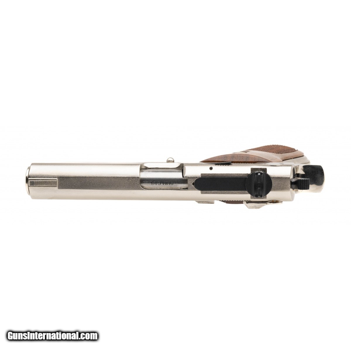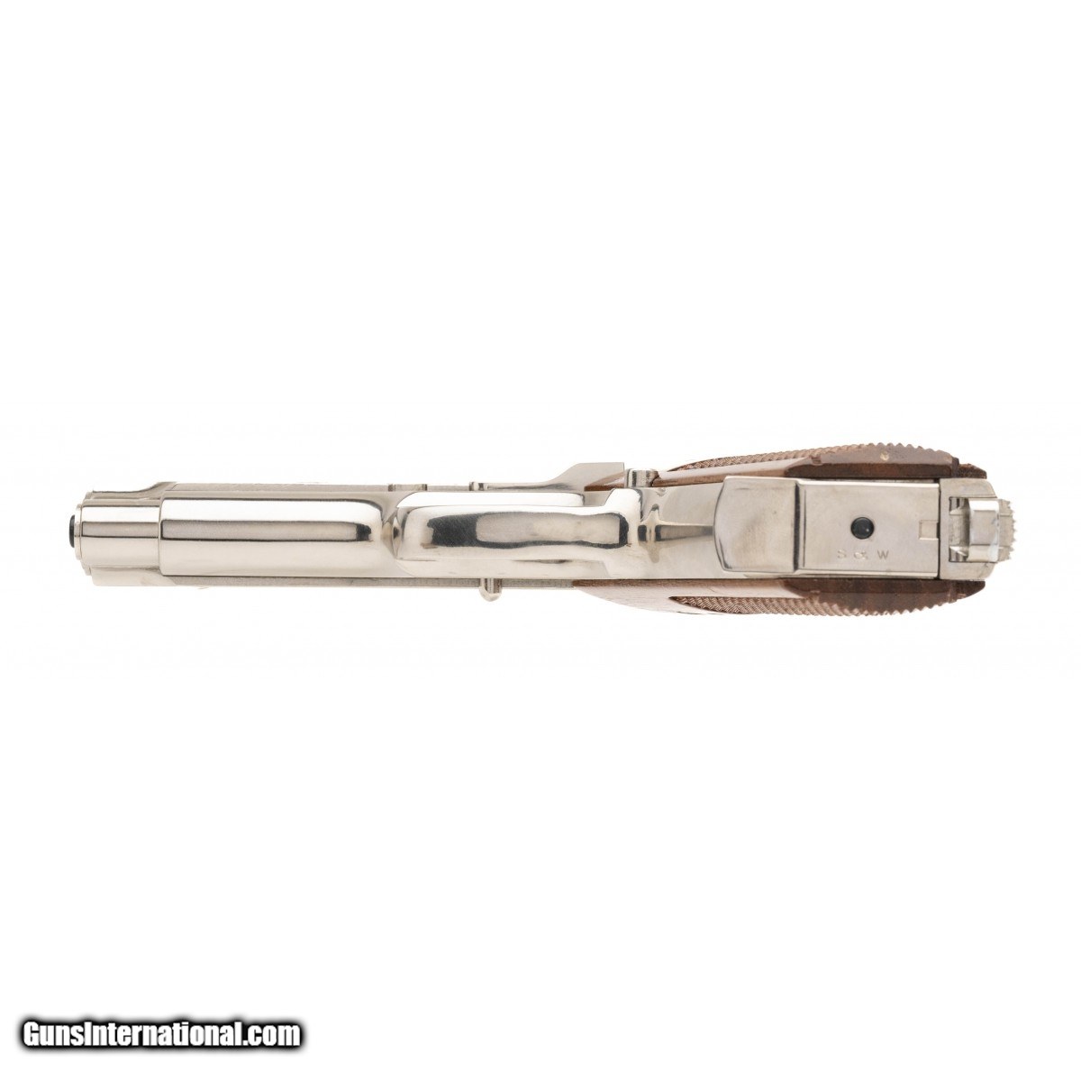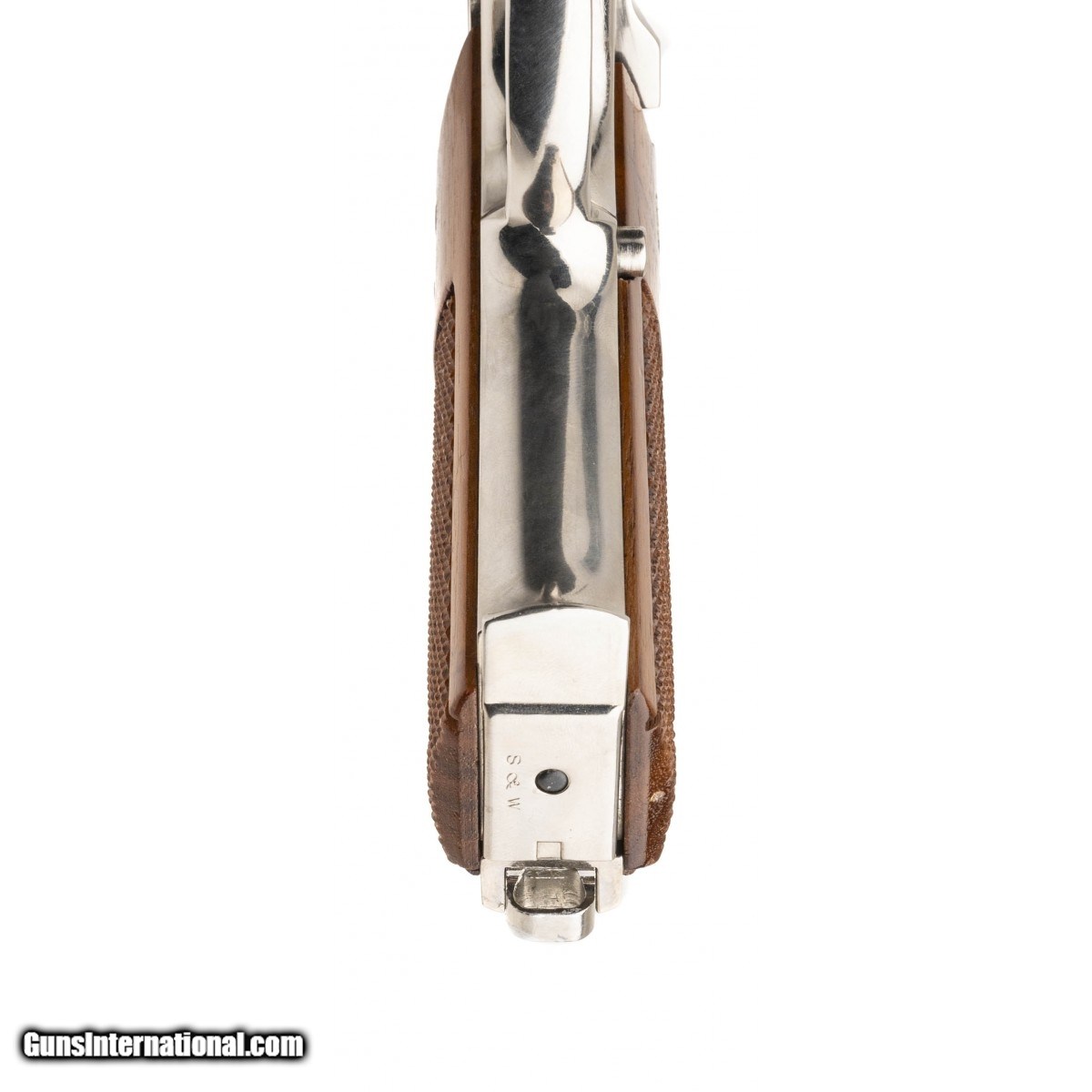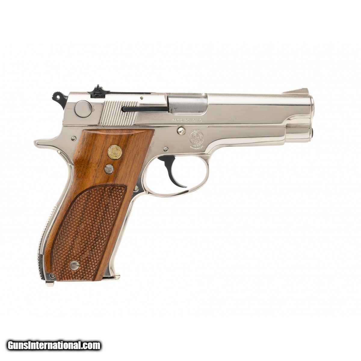 SN: A158709. Semi-automatic double-action/single-action pistol made by Smith & Wesson in the 1970s. 4"" barrel chambered for 9x19mm. Great condition overall with light handling marks in the polished nickel finish. Wood grips and bore are excellent. Comes with an extra magazine.