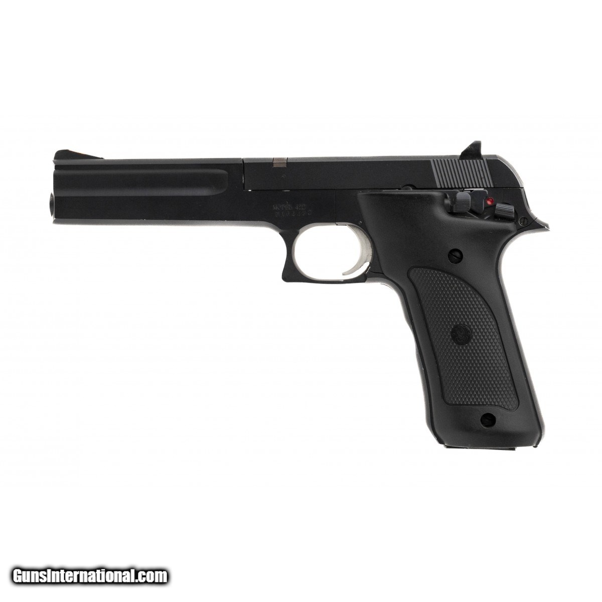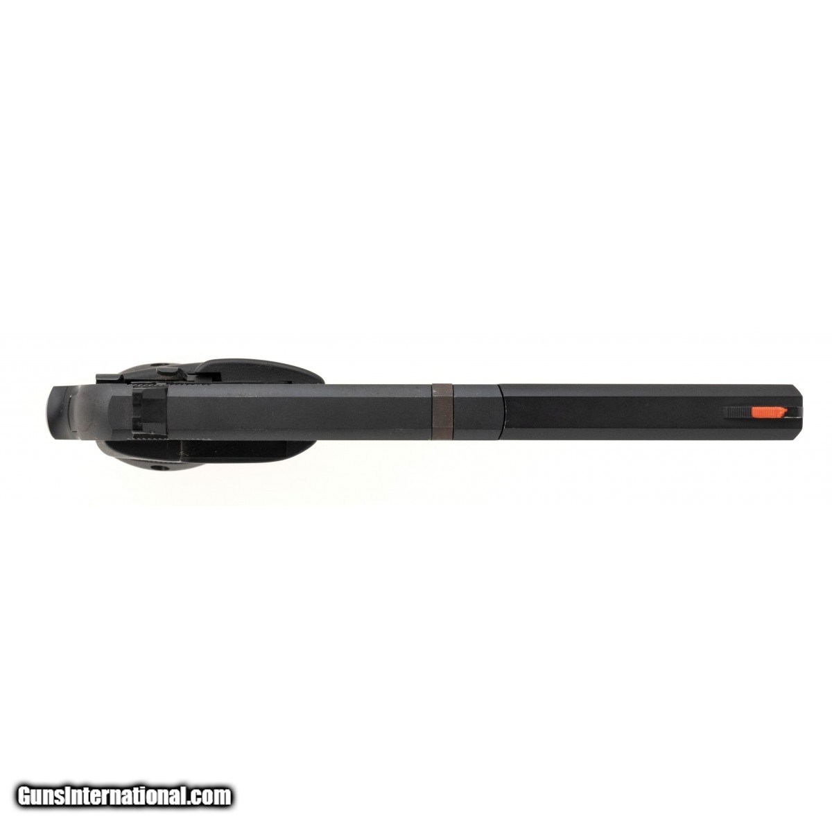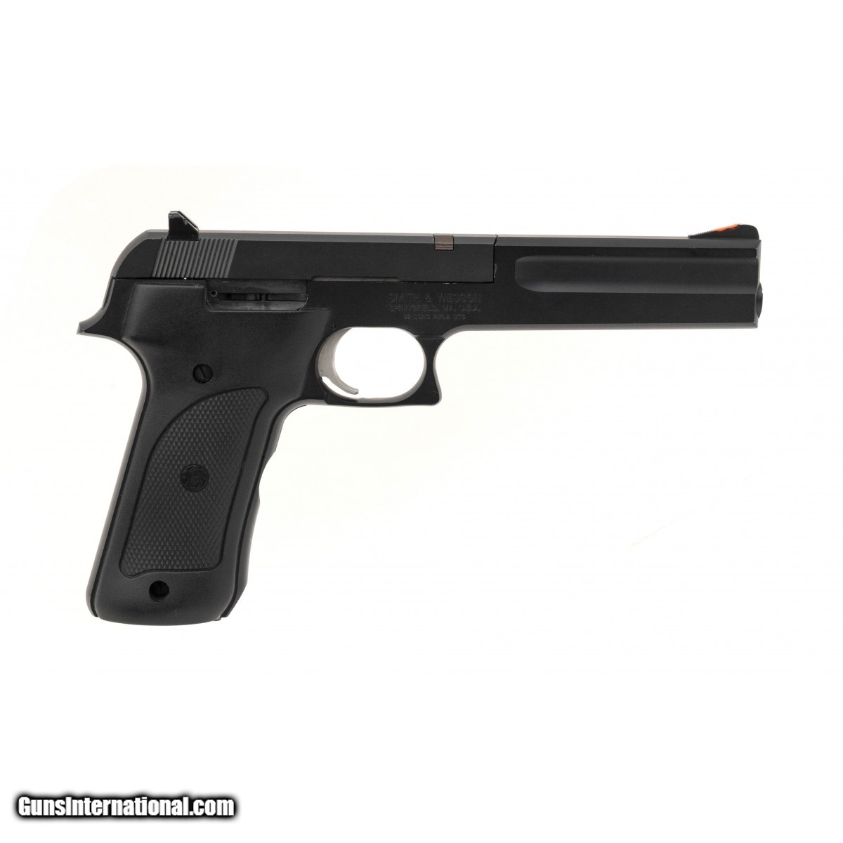 SN: UAC4432. Semi-automatic .22 pistol made by Smith & Wesson in the 1990s. 6.5"" fixed barrel in unique under-barrel configuration. Chambered for .22 LR. Features 7-3/4"" sight radius and threaded barrel (adapter required to mount muzzle devices, but adapters are readily available.) Great condition with only small handling marks on the underside of the frame and front strap, plus typical firing wear. Action functions correctly including safety. Front sight ramp has been painted blaze orange to improve contrast. Comes with magazine.
