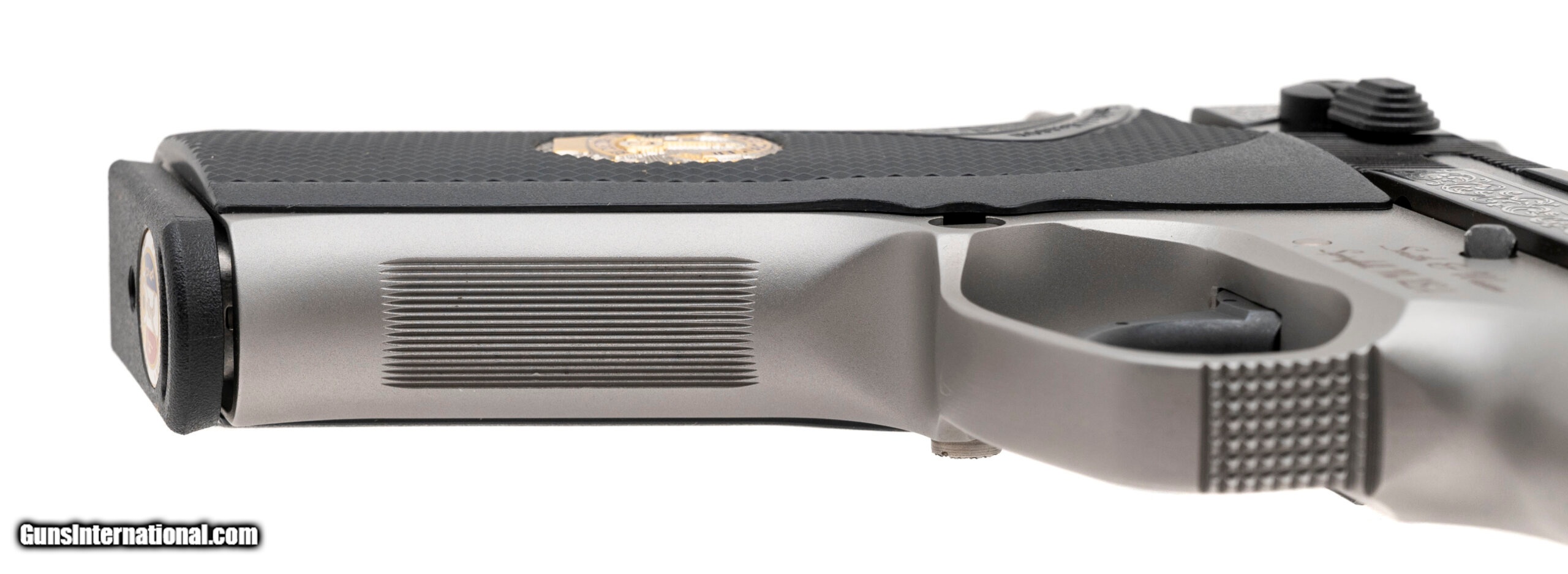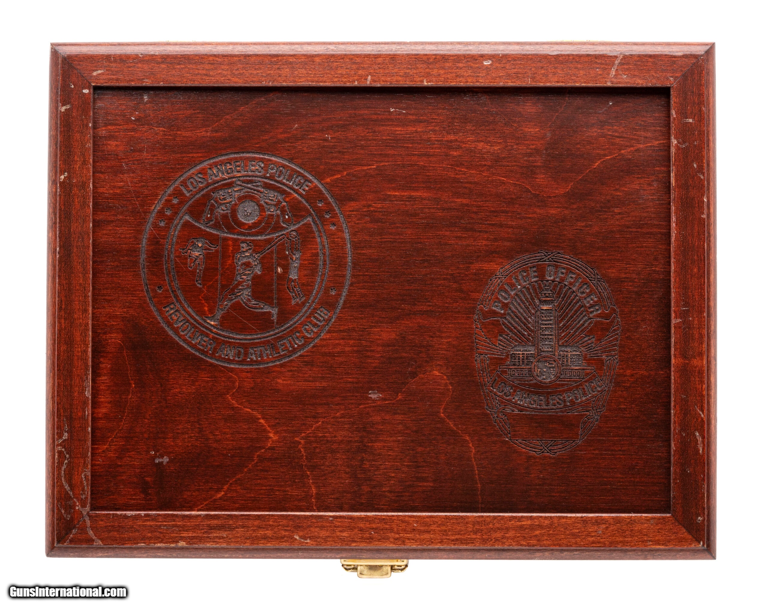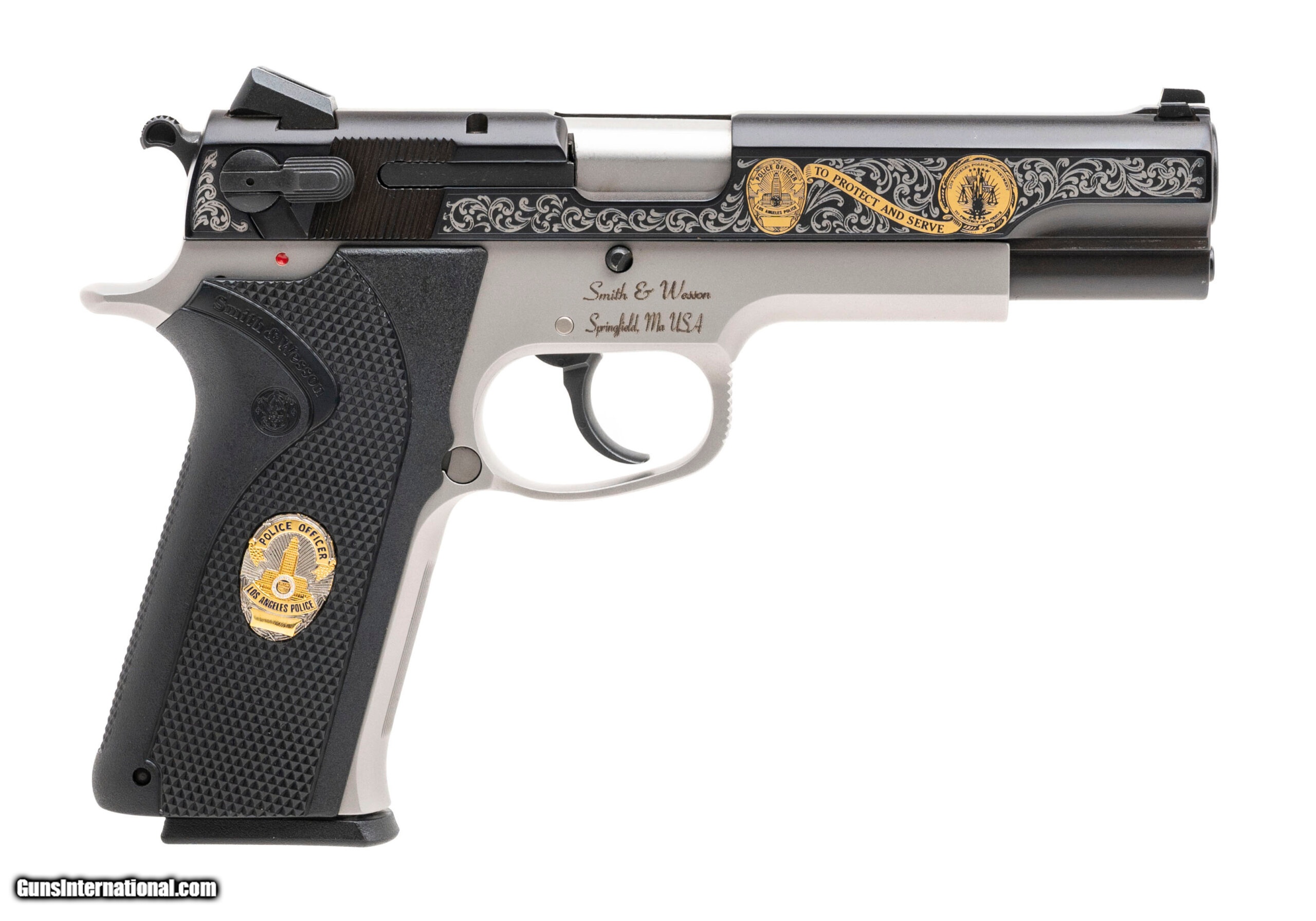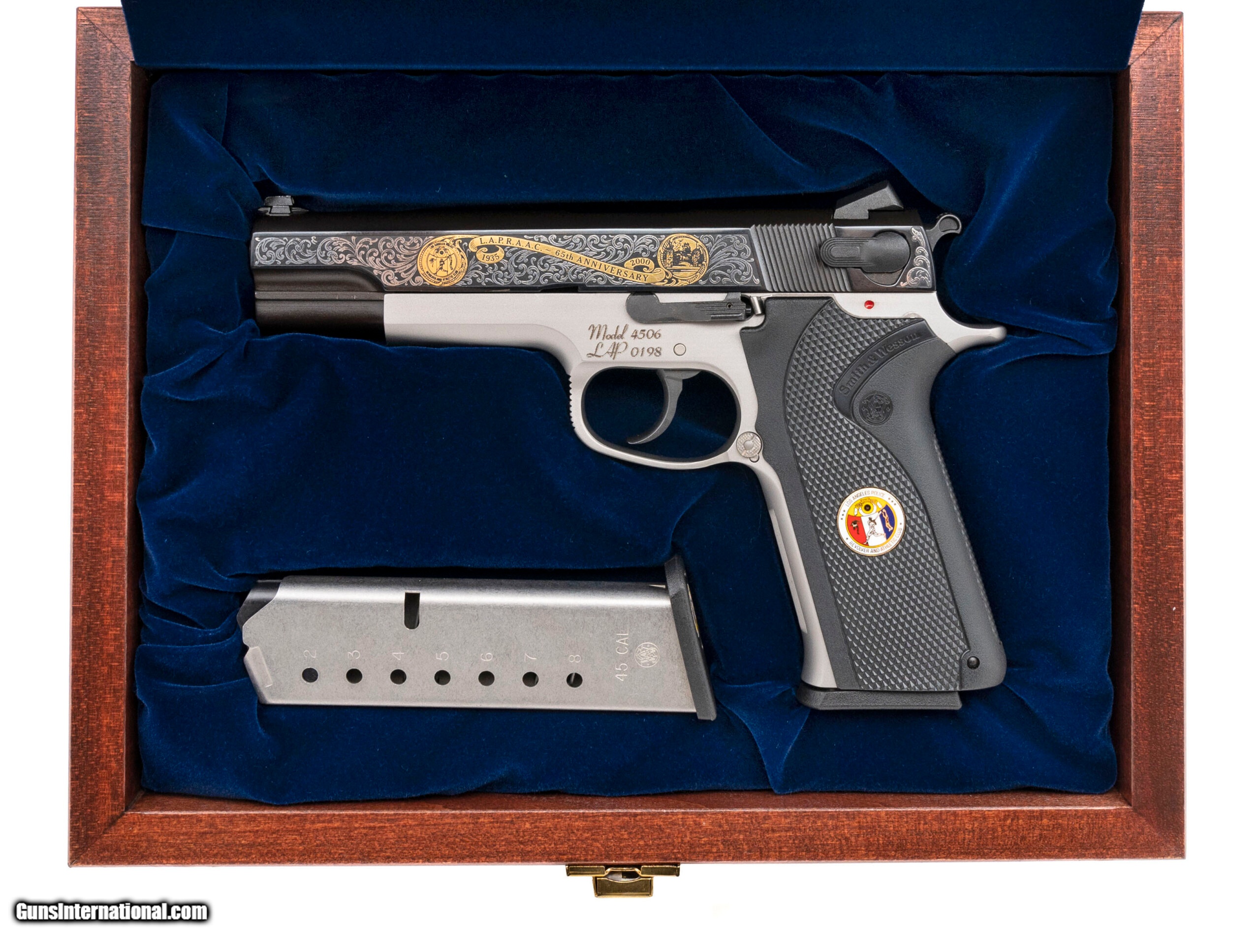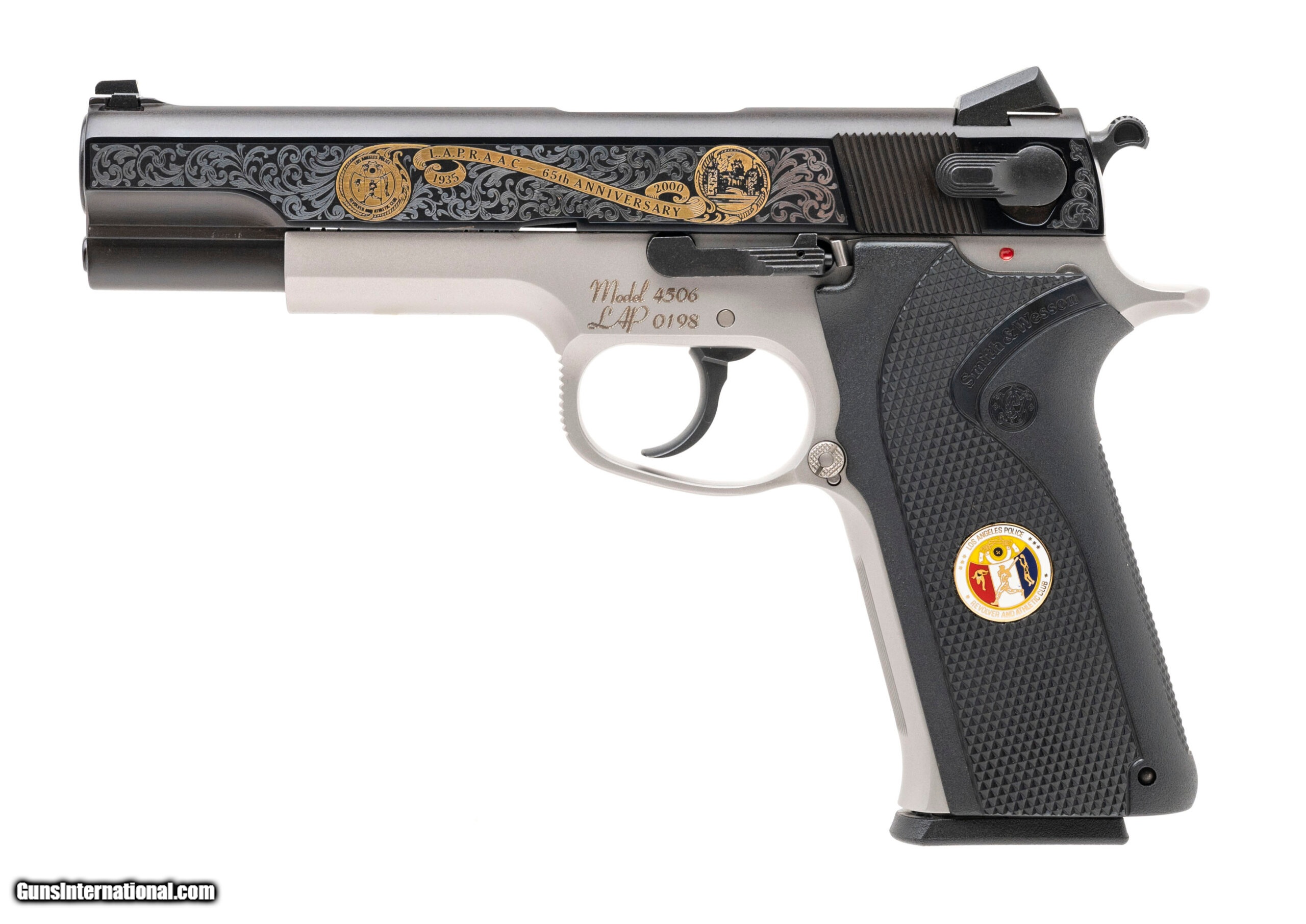 Description: "SN: LAP0198. Made in 2000, .45 ACP with a 5"" barrel. LA Police commemorative pistol with 2-tone finish and special gold decorations. Comes in a wooden presentation case. Excellent condition. SOLD |