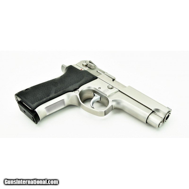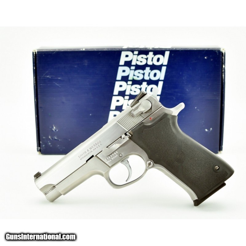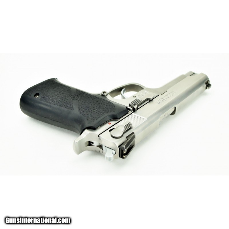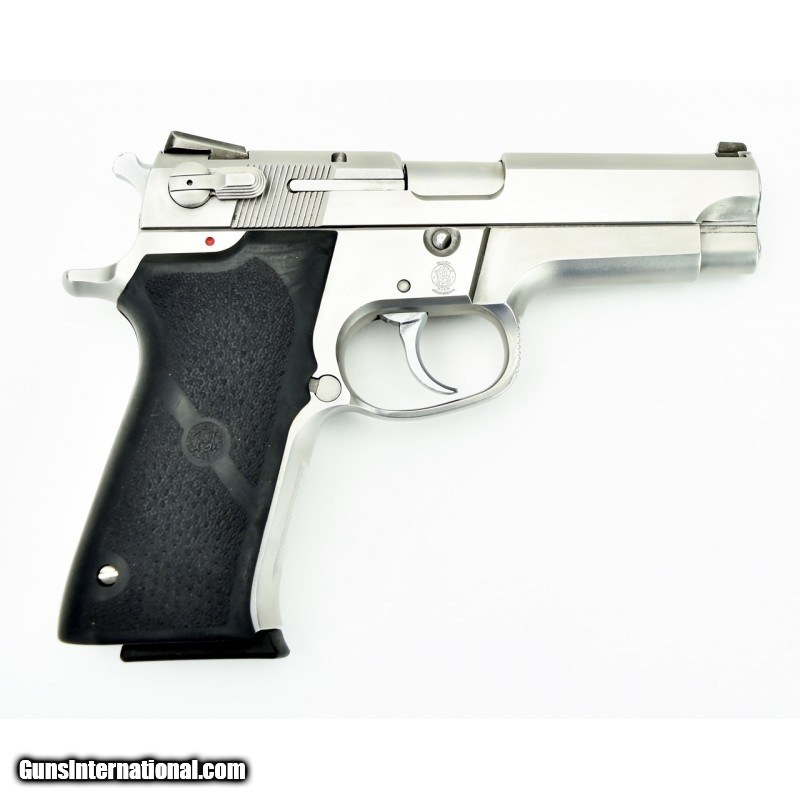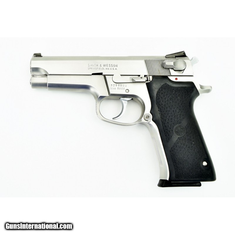 Description: "Smith & Wesson 5906 9mm caliber pistol. All stainless steel model with rubber grips in excellent condition with box. SOLD |