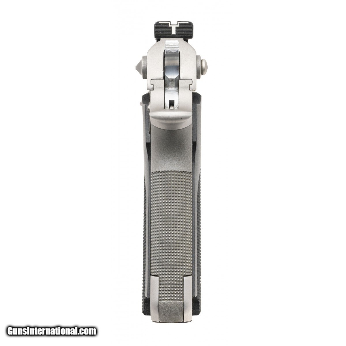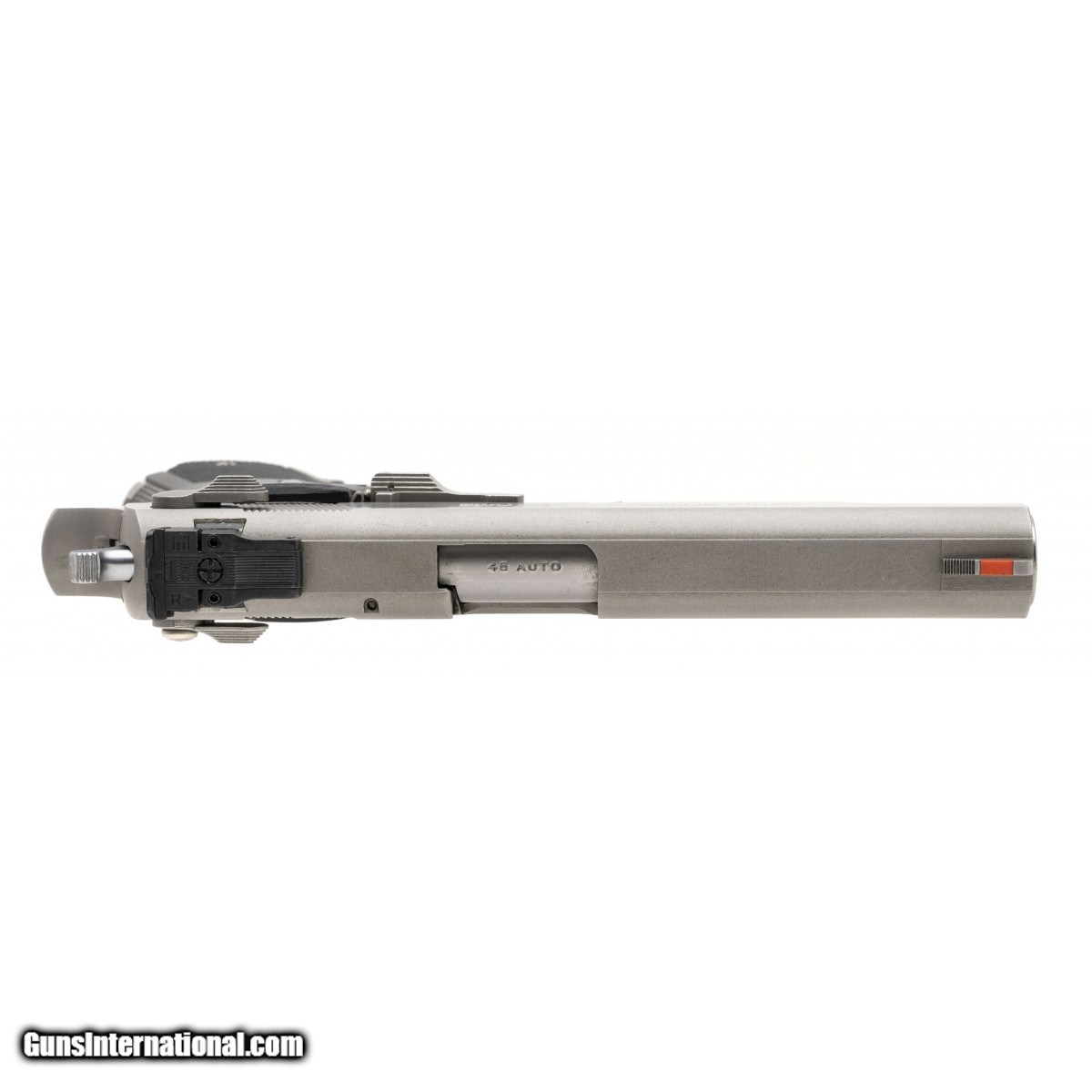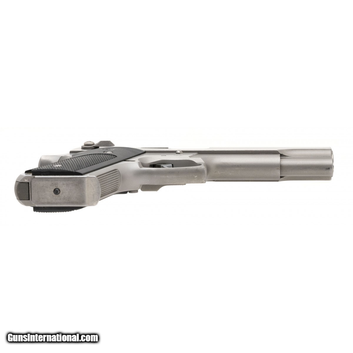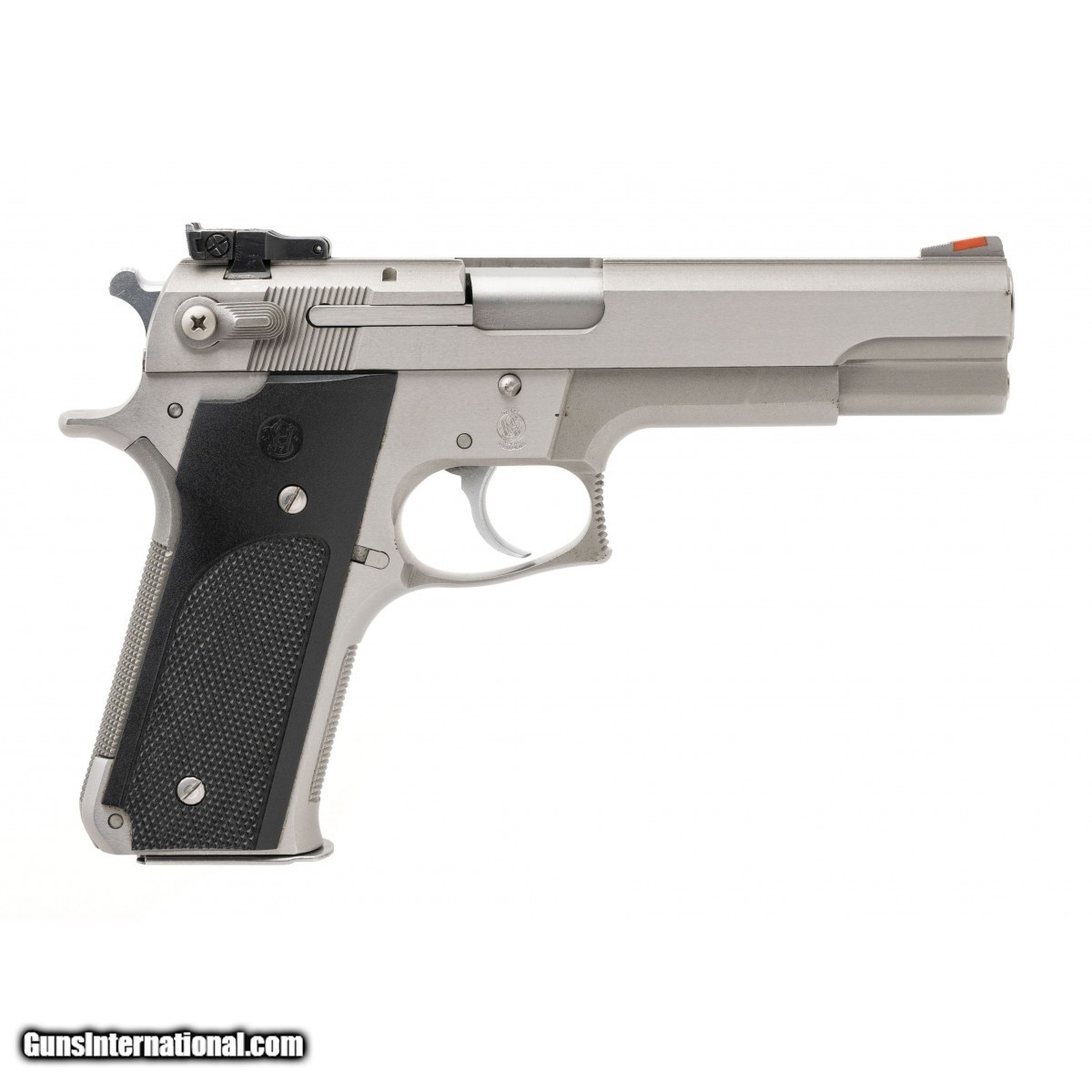 SN: TBT3414. Made circa mid 1980's. .45 ACP with a 5"" barrel. Bore is in very good condition. Stainless steel double action S&W pistol with Millet target sight added. Metal is in near excellent condition. Grips show minor handling wear with strong checkering. Overall near excellent condition.