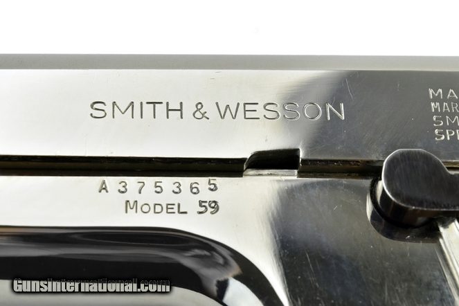 Smith & Wesson 59 9mm caliber pistol. 1st Generation automatic with nickel finish. Near excellent condition with very light use.
