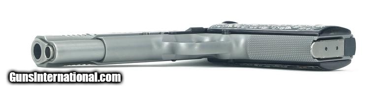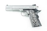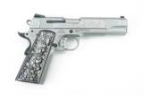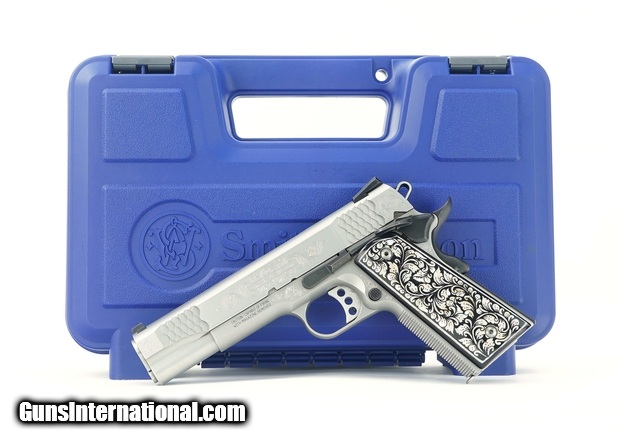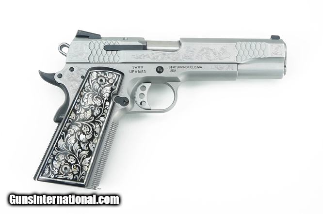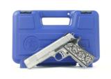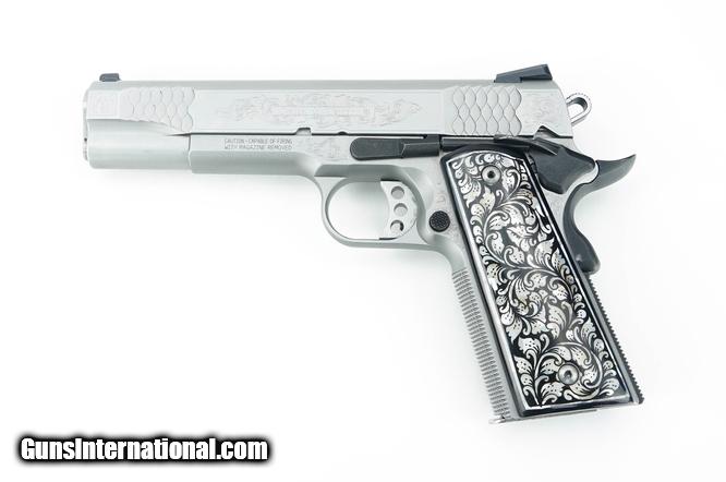 Smith & Wesson SW1911 .45ACP caliber pistol. Engraved special edition with scroll engraving, fancy serrations, and beautiful custom grips. Excellent condition with box.