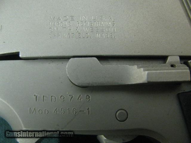 Description: 7200 Smith Wesson 4516-1 45 cal staninless steel frame. 3.75 barrel, 34 ounces, fixed 3 dot sites, 1988-1997 mfg. DA/SA ambi safety/decocker, 7 round, like new 99 %. SOLD Handgun Caliber: .45 ACP (.45 Auto) |
