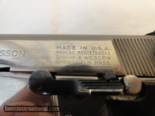 Description: Nice early 1970's automatic nine that retains all the factory original nickel finish, perfect bore and action, excellent grips. Considered the grandfather of the modern 9mm often referred to as the wonder nine with 14 round capacity and double action. Hard to find nice early examples in factory nickel finish. This example was made in 1977-78 and has been out of production for over 30 years. Quite striking with small fire blued parts contrasting the nickel finish. It has been fired but shows as new in and out. Perfect collector quality or shooting. SALE HOLD SOLD Manufacturer: S&W Model: 59 Serial Number: A401663 Caliber Info: 9mm Condition: near new Bore Condition: exc Finish: nickel Manufacture Date: 1970's |