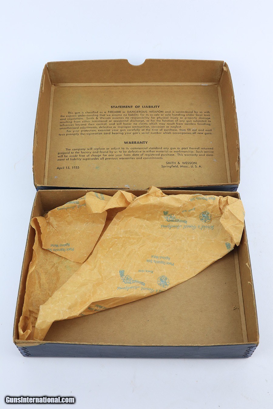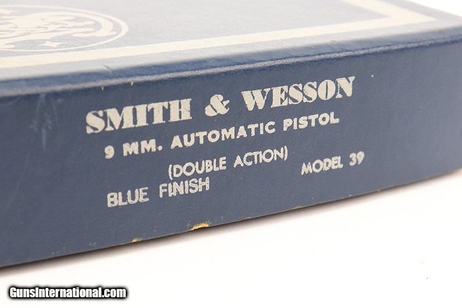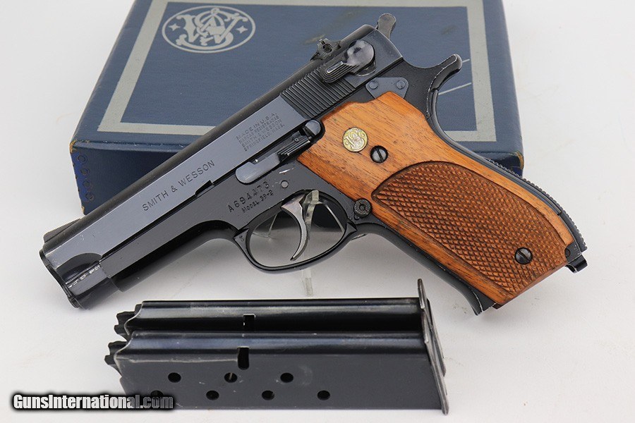Description: This is an excellent Smith & Wesson 39-2 in the original box. It has just minor hints of high edge wear and a few speckled dots of wear on the front strap. Minty bore and grips. This is a later example with alloy frame, and was made in 1981. While the box is not serialized, it is marked for a blued 39-2 so likely is original to the gun. Comes with a spare mag and some of the S&W extras. SOLD Handgun Caliber: 9x19mm Parabellum (9mm Luger, 9x19mm NATO) |