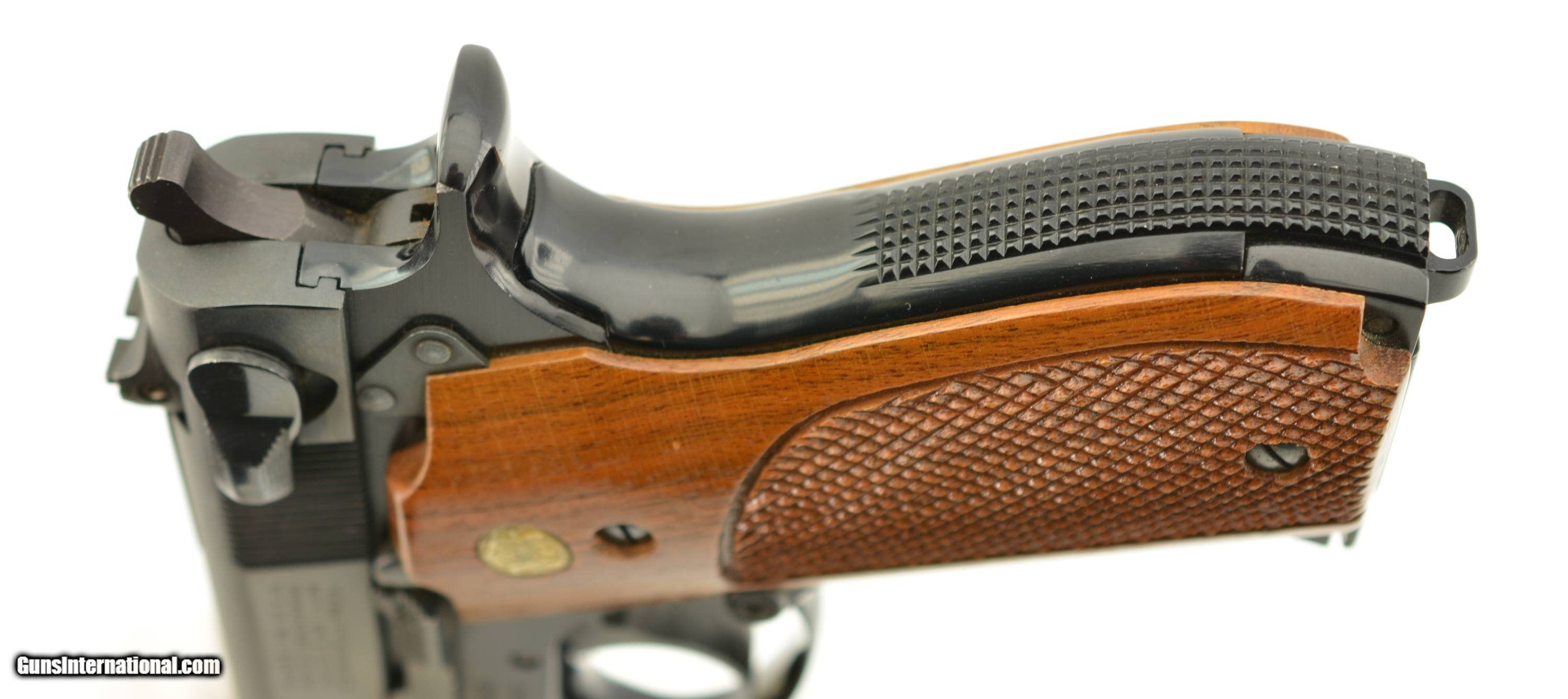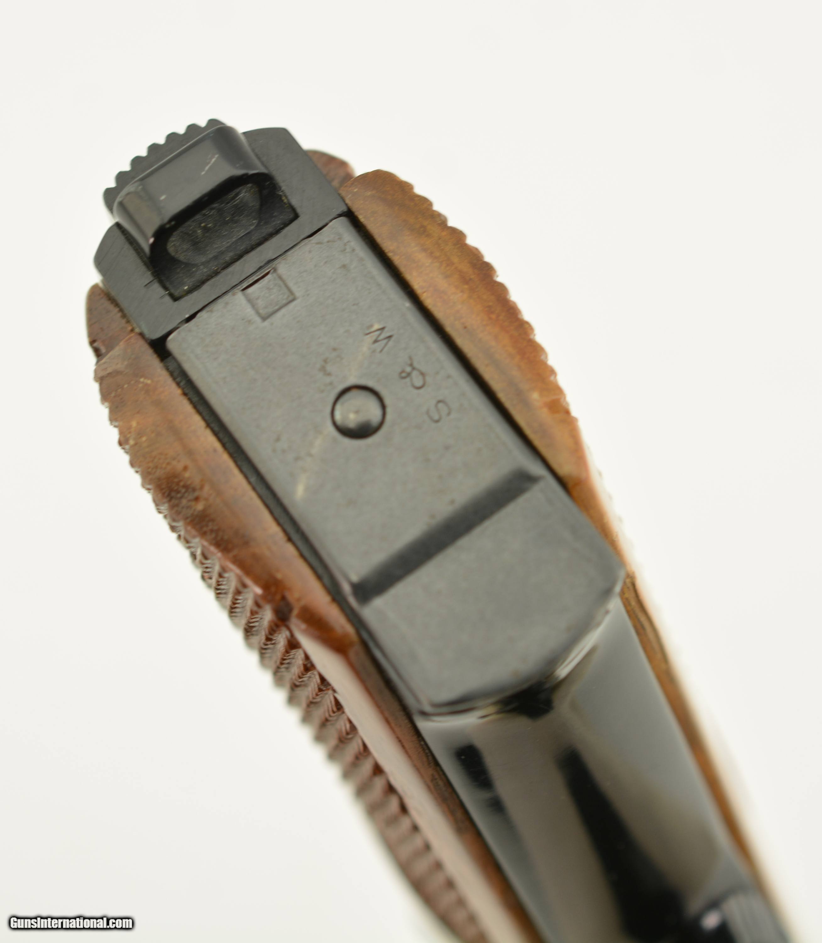 Description: Serial #535500, 9mm, 4 inch barrel with a bright, excellent bore. This is the Smith & Wesson Model 39-2 pistol with an alloy frame and steel slide. The classic semi-auto pistol is in excellent condition retaining virtually all, 96-98% of the original blue finish on the steel slide and alloy frame with some silvering on the high edges of each. The original checkered walnut grips rate excellent with some age marks in the varnish. Mechanically it functions properly and comes with one original 8 round steel S&W magazine. FFL SOLD |