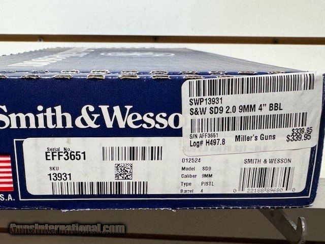 Description: new Smith & Wesson SD9 2.0 2-Tone 9mm 4" bbl 13931 2 in stock UPC 022188896800 MPN 13931 Brand Smith & Wesson Model SD9 2.0 2-Tone Caliber 9mm Capacity 16+1 round Features 1:18.75? twist, Sight Radius: 6.19 ?, flat-face Self Defense Trigger, slide serration, Compatible with existing SD Accessories Type Semi-Auto Pistol Action Striker-Fired Finish 2 Tone, Stainless Steel w/Satin Finish Slide Sight Front Sight: White Dot, Rear Sight: 2 White Dots drift adjustable Barrel Length 4" Overall Length 7.2" Weight 22.7 oz. Number Of Mags 1 Buyer pays shipping Millers Gun Center Located in New Castle, Delaware "Home of TAX-Free shopping" No Credit Card Fees Send Gun international inquiry and then call 302-328-9747 to complete your purchase SOLD Serial Number: EFC7659 + 1 more |