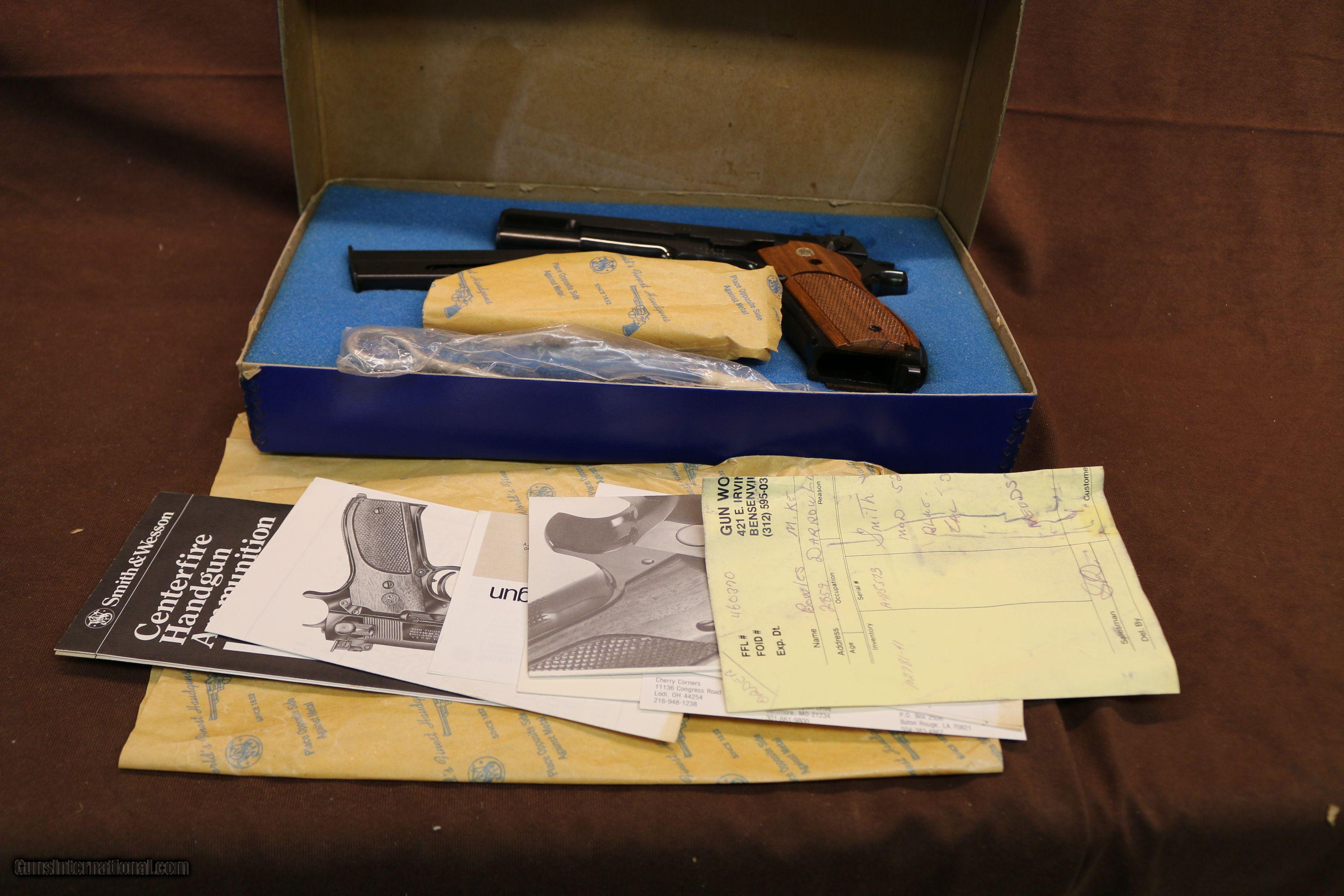 Description: New in it's original two piece bow with all the paperwork including original sales receipt ($552.00 in 1980). Two piece Bangor Punta box in very good condition. 2 original mags, tool kit and wrench are still sealed in the plastic bag. The gun remains unfired since leaving Smith & Wesson. Adjustable rear sight, original grips. One of the finest examples of the highly regarded Model 52 New in it's original two piece bow with all the paperwork including original sales receipt ($552.00 in 1980). Two piece Bangor Punta box in very good condition. 2 original mags, tool kit and wrench are still sealed in the plastic bag. The gun remains unfired since leaving Smith & Wesson. Adjustable rear sight, original grips. One of the finest examples of the highly regarded Model 52 SOLD |