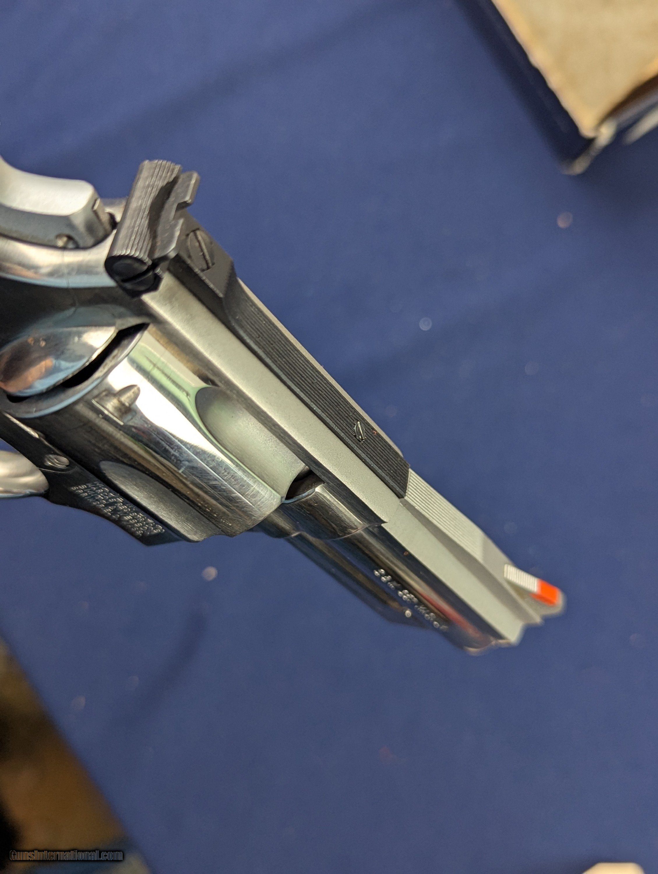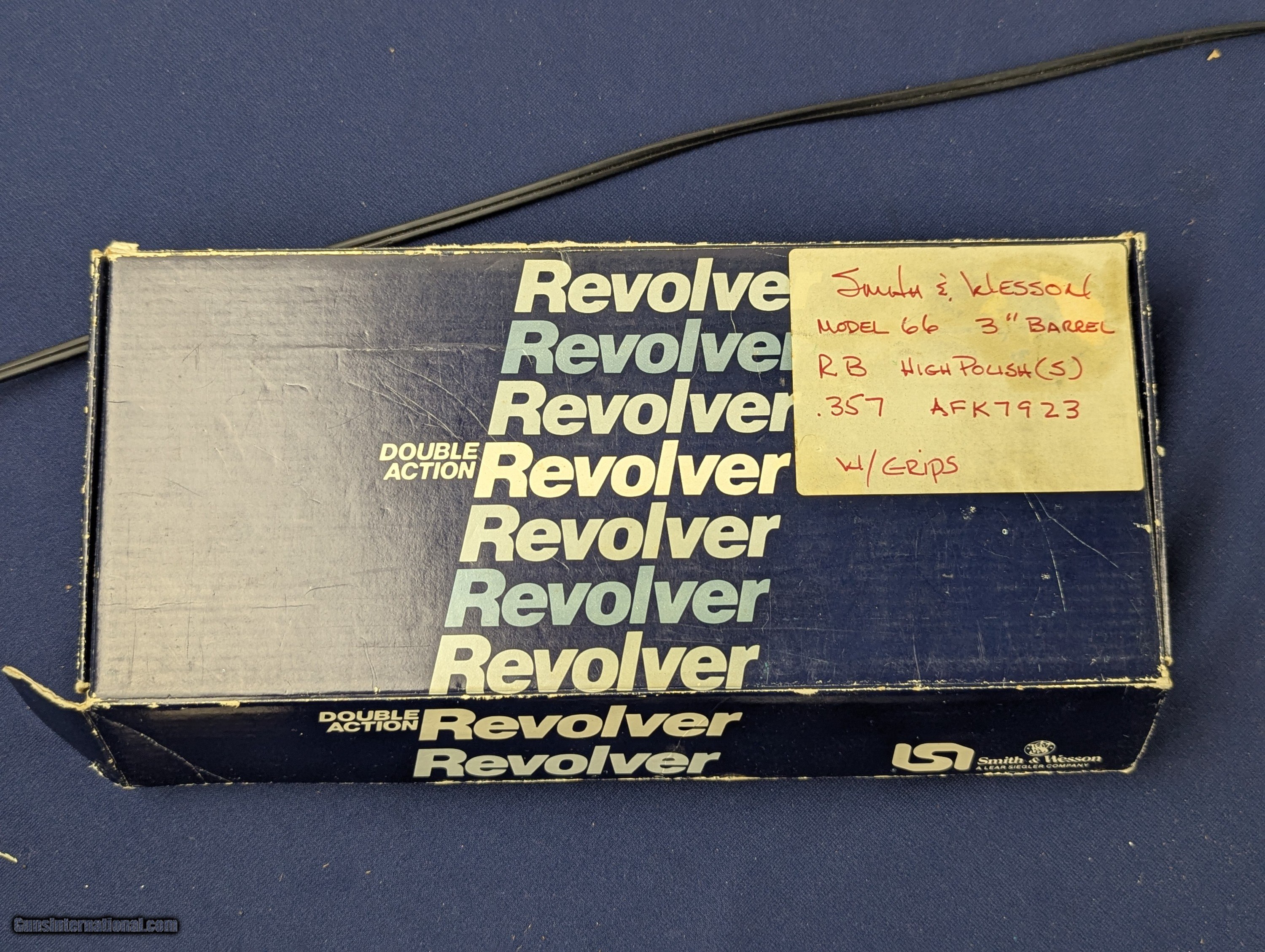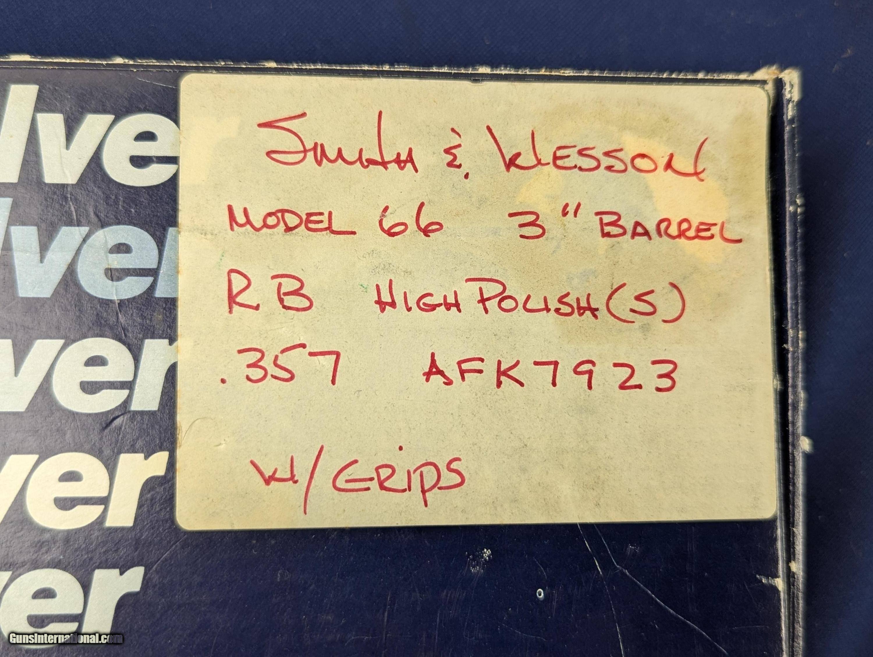 Description: Powerful S&W Model 66-2 .357 Revolver Special Factory Hi-Polish Finish Offered here for sale and just acquired is another highly collectible classic revolver from our galleries in Southport, Ct. The Smith & Wesson Model 66-2 is a stainless steel, double-action revolver chambered in .357 Magnum, with the ability to also fire .38 Special rounds. It's a variant of the classic Model 66, which itself is a stainless version of the famous S&W Model 19—a K-frame revolver designed for law enforcement and personal defense. This specimen, serial number AFK7923 is a K-frame (medium-sized) revolver chambered for the powerful .357 Magnum cartridge but also can fire .38 Special. Capacity: 6 rounds. This barrel length a compact 2.5”. Usually standard stainless steel finish this specimen was especially given a high polish “employee special” treatment at the Ruger factory and fitted with deluxe hard wood grips. We have shown in one image that there are telltale light use marks however since it is a high polished finish it can easily be smoothed out if desired. It has a an adjustable rear sight, red ramp front sight and is in double-action/single-action (DA/SA). The 66-2 revision was introduced in 1982 and ran until 1986. Notable Changes in the Model 66-2: