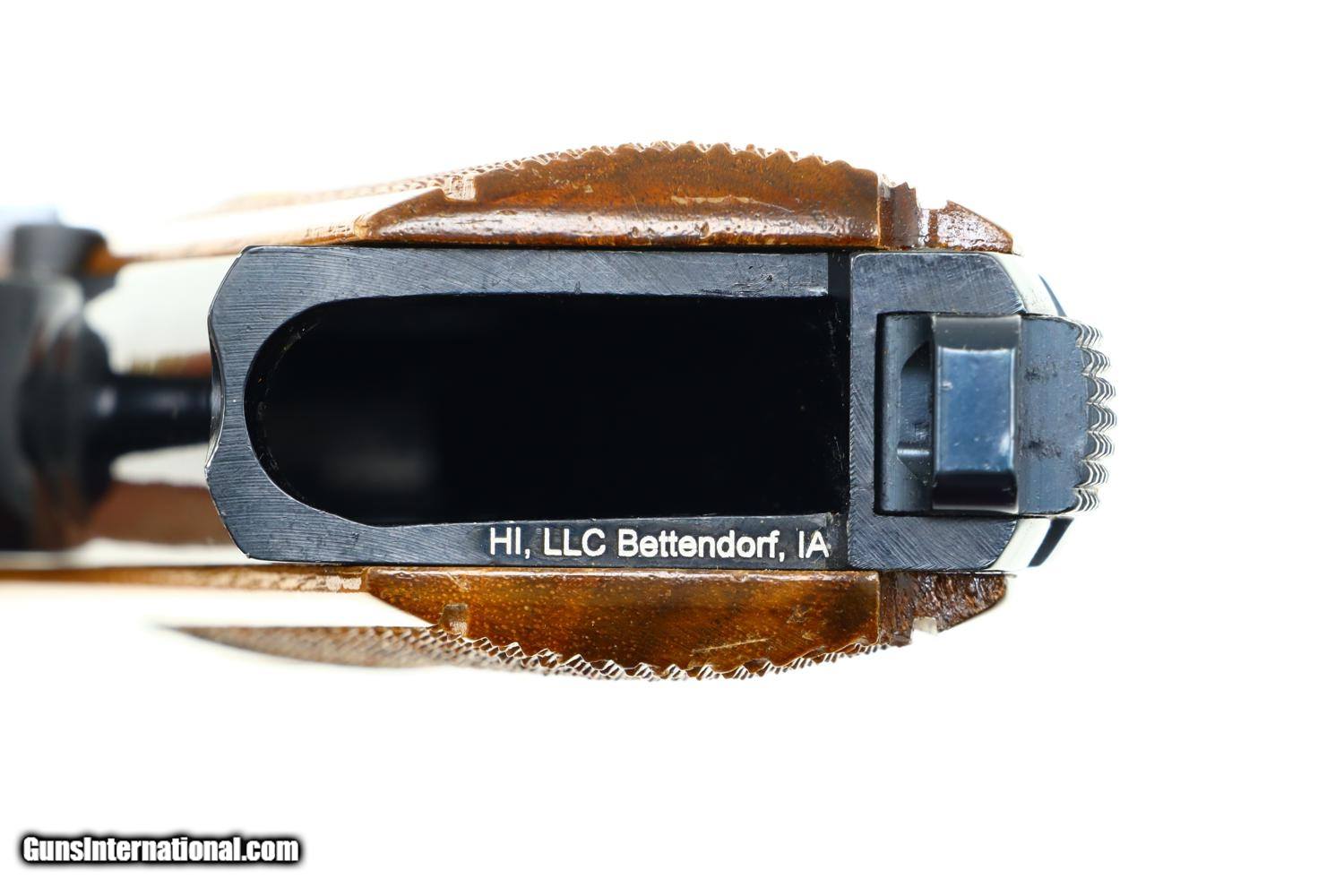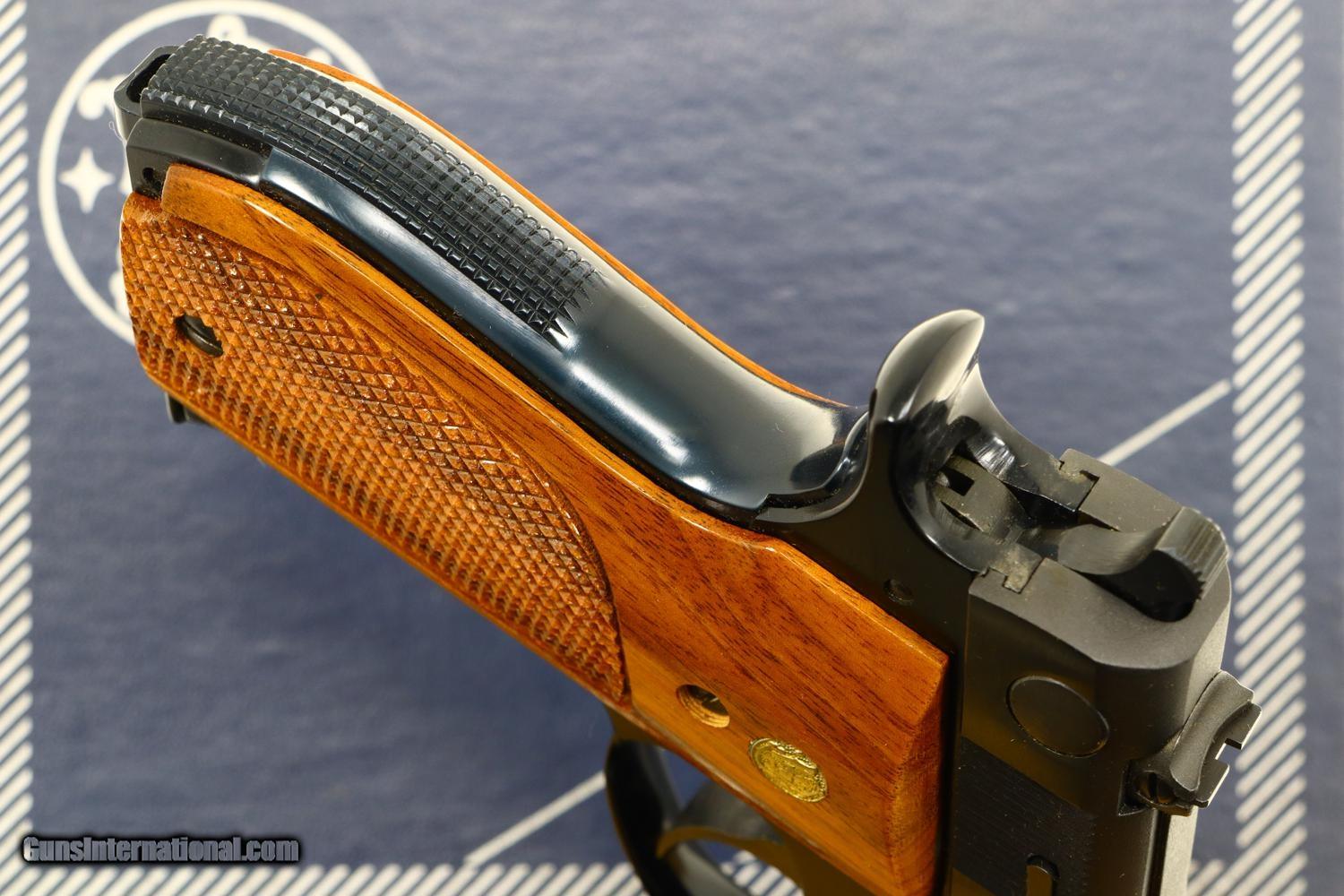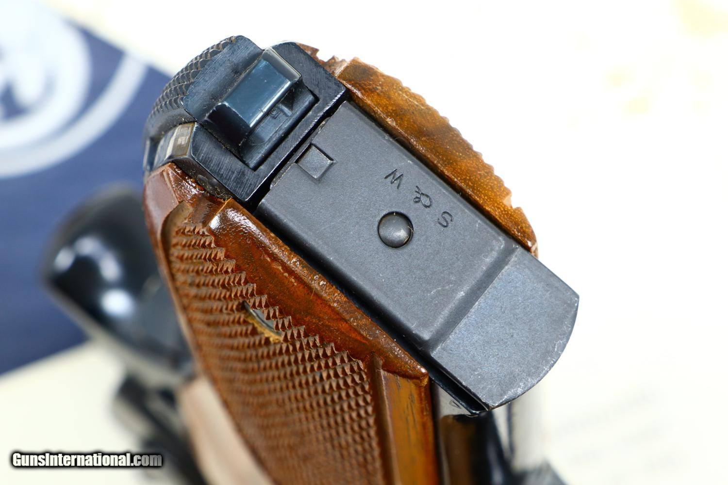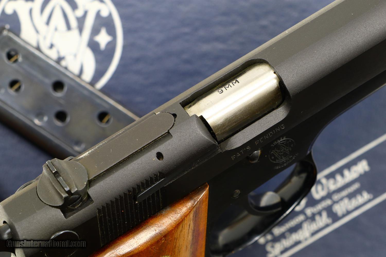 Description: Standard configuration S&W Model 39-2 with fixed front sight and windage adjustable rear sight. Usual markings on slide with serial number and model on left side of frame; S&W logo on right side of frame. Factory logo checkered panels. Checkered palm swell. Fixed lanyard loop. Original S&W magazines with manufacturer marked floorplate. Complete with rust inhibiting paper, spare magazine, cleaning implements, and literature in factory original matching shipping box. Synopsis: S&W, 39-2 pistol, Near NIB. Spare Magazine, Literature, A307624, I-1030 Condition: Near new with a rub mark to the left of the rear sight, seen on top view, and two microscopic dings on the lower surface of frame. Comparable condition grips and magazines. Bright bore with sharp rifling. Perfect manual mechanics. Crisp literature and shipping box. A wonderful S&W M39-2 that could only upgraded by finding an example that was NIB. ~~Insured shipping fee of $55; most packages shipped using FedEx 2nd Day.~~ SOLD Manufacturer: Smith and Wesson Serial Number: A307624 Caliber Info: 9mmP |