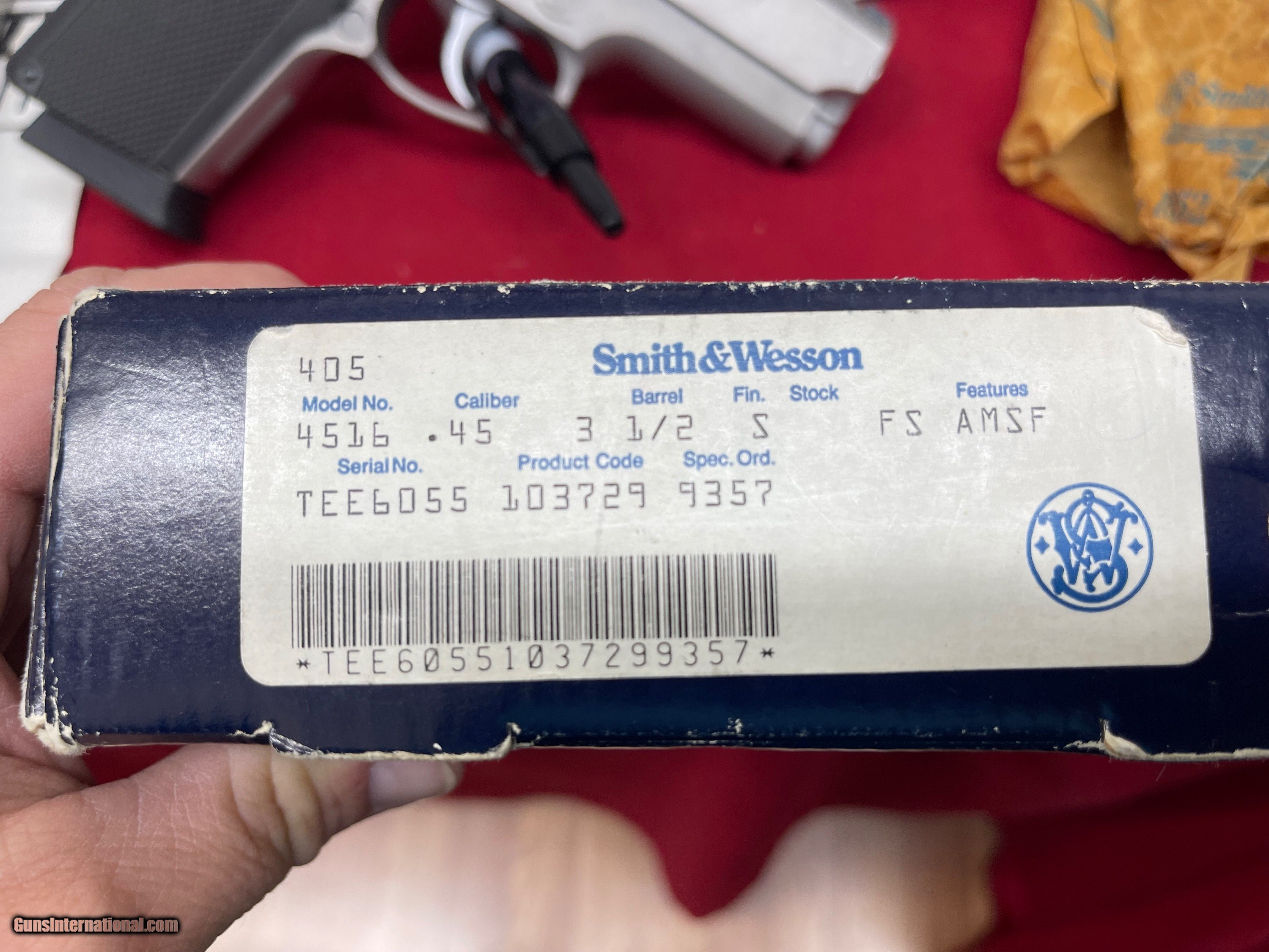 Description: Another great item from Gainesville Pawn! Up for sale is a S & W 4516-1. This gun is like new in its factory box with paperwork. 45 Acp caliber. The box has a little damage but is serial numbered to the gun. Comes with 2 factory magazines please see attached photos. *Please be aware that all items are sold “AS IS”. Ask questions BEFORE placing a bid. Feel free to call us at our store (352) 240-6452 or email us at Gainesvillepawn(at)gmail(dot)com with ANY questions. We do not accept trades or offers through Guns International We only entertain trades and offers through our store. $35 shipping and handling. Insurance extra. We only accept USPS money orders and major credit cards for payment. 3% convenience fee for credit cards. WE collect Florida state sales tax for in state sales. Please be aware that this item is for sale in our store as well as the occasional gun show so it may be sold there at any time. We will not ship the item until you have your dealer/receiving store email us a signed copy of their FFL to gainesvillepawn(at)gmail(dot) SOLD Handgun Caliber: .45 ACP (.45 Auto) Manufacturer: S & W Model: 4516-1 Serial Number: Tee6055 Condition: Like new Metal Condition: Like new Wood Condition: Like new Bore Condition: Like new |