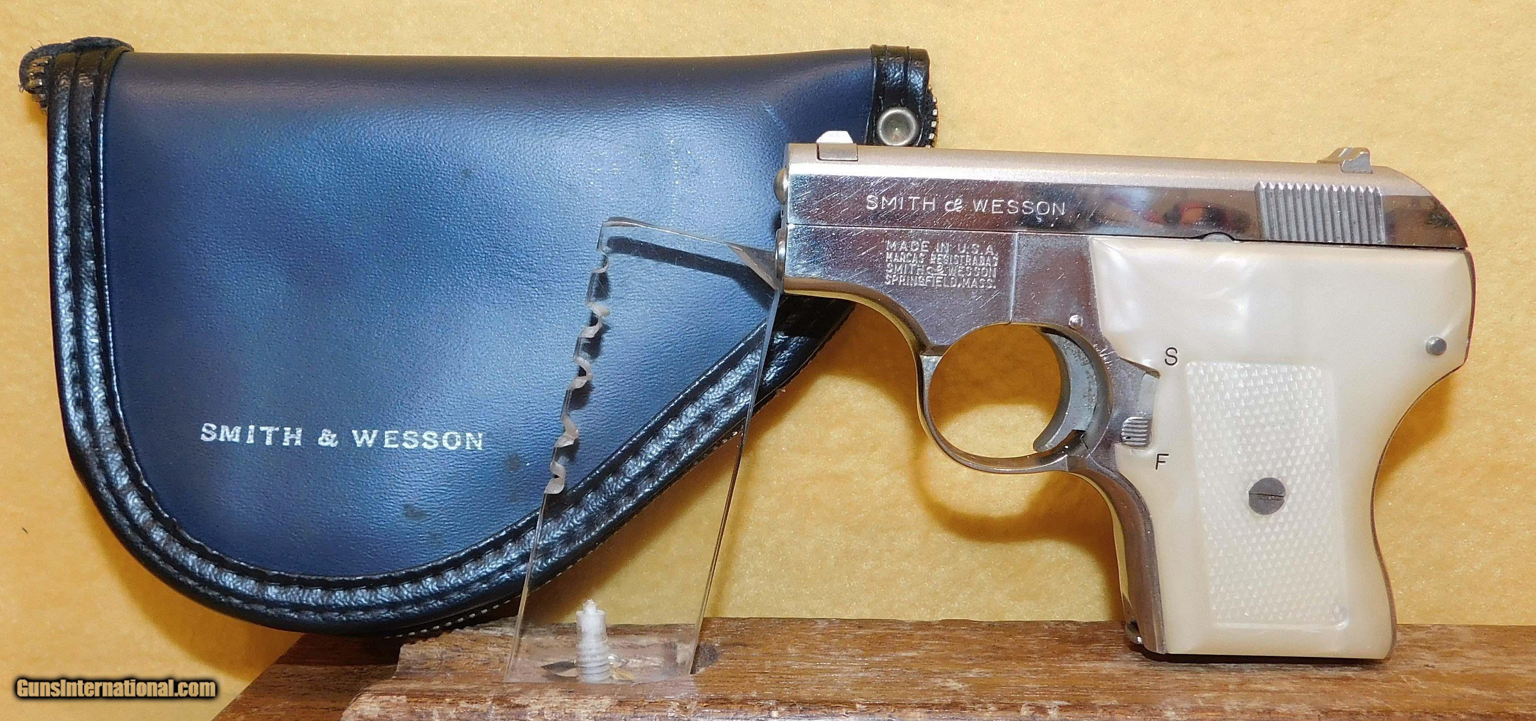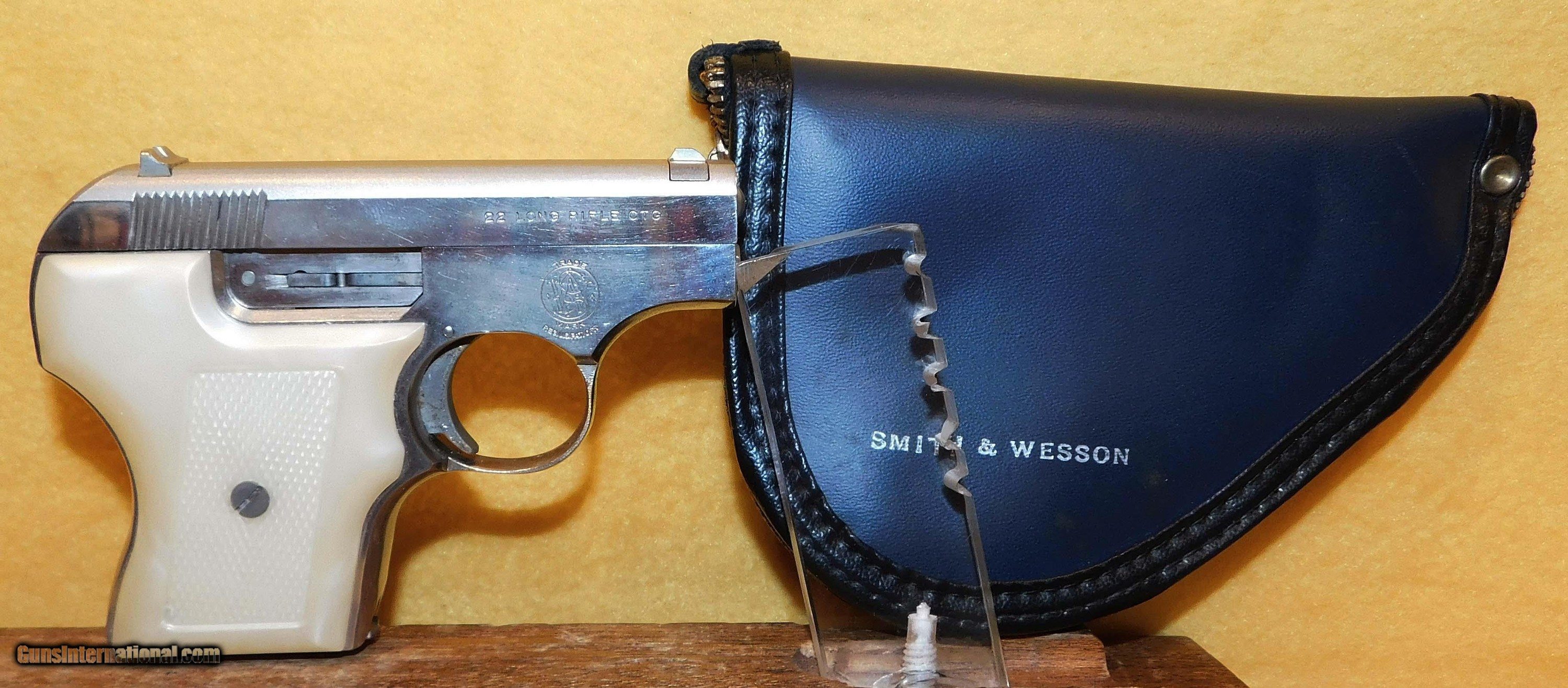 Description: S&W 61 IN .22 CAL., WITH 3 .38" BARREL. COLOR NICKEL. CONDITION 95%+. SERIAL NUMBER B8636. S&W MODEL 61 IN .22 CALIBER, MIRROR BORE, NO FLACKING ON THE NICKEL FINISH, GRIPS EXCELLENT, COMES WITH ONE FACTORY MAGAZINE, POUCH, BLUE HINGED BOX NOT MATCHING TO THE gun, 95%+ OVERALL CONDITION, OUR STOCK # D4027 SOLD |