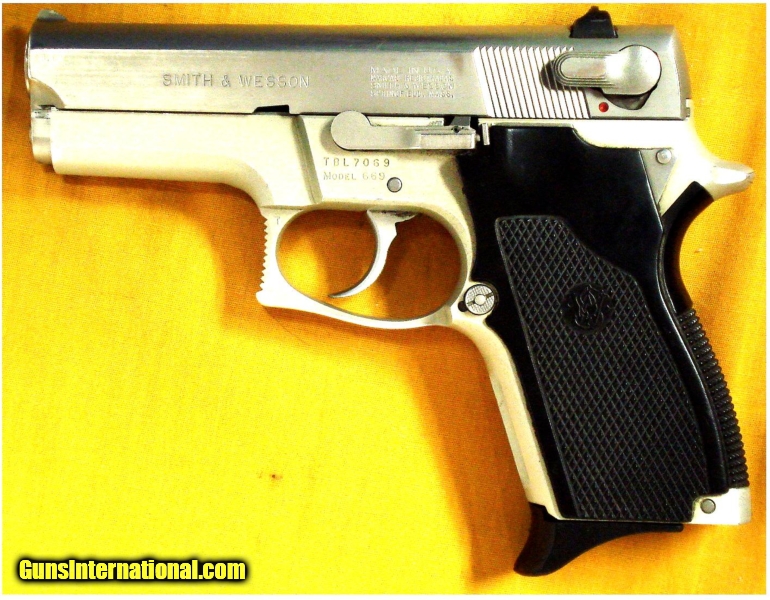 Description: S&W model 669 in 9MM CAL., with 3 1/2" barrel. Color SILVER. THIS 669 IS IN EXC. OVERALL CONDITION GRADING APPROX 95% SHOWING LIGHT WEAR FROM CARYING. ONE 12 ROUND MAGAZINE IS INCLUDED. Condition 95%. SOLD |