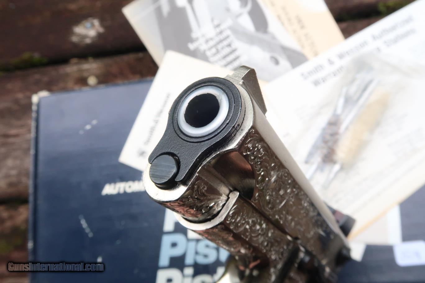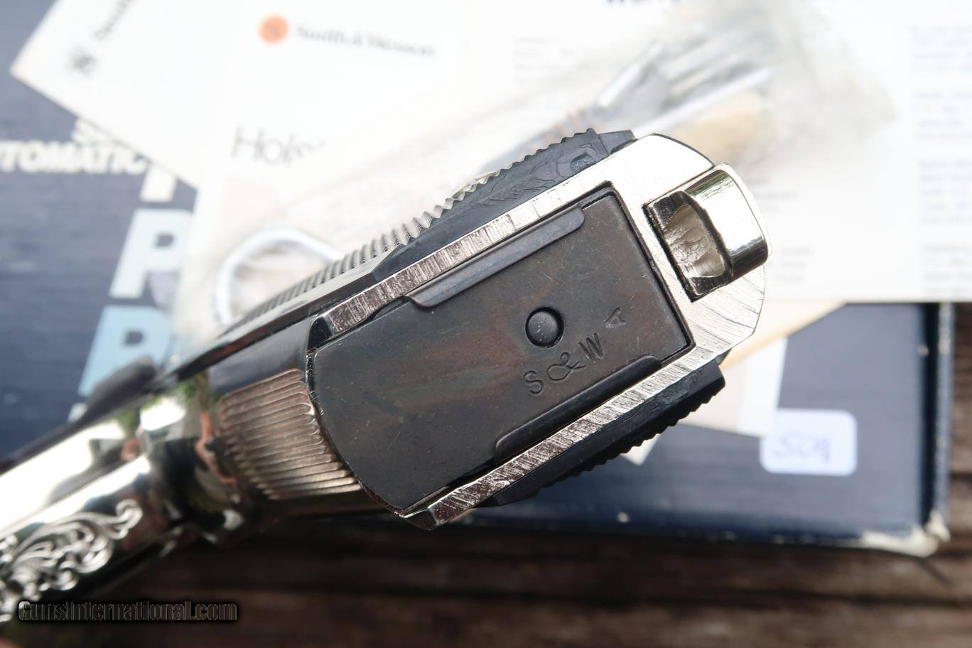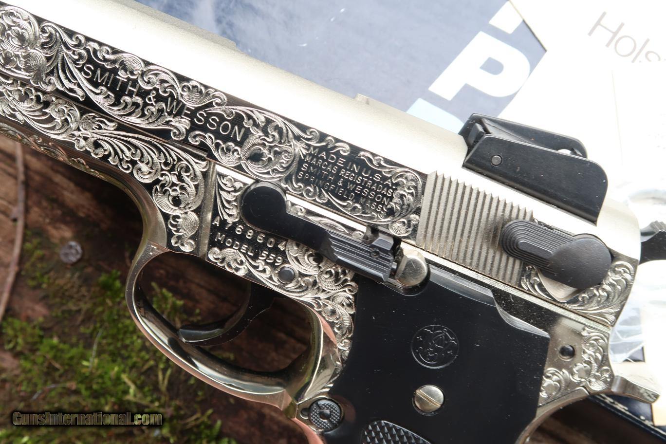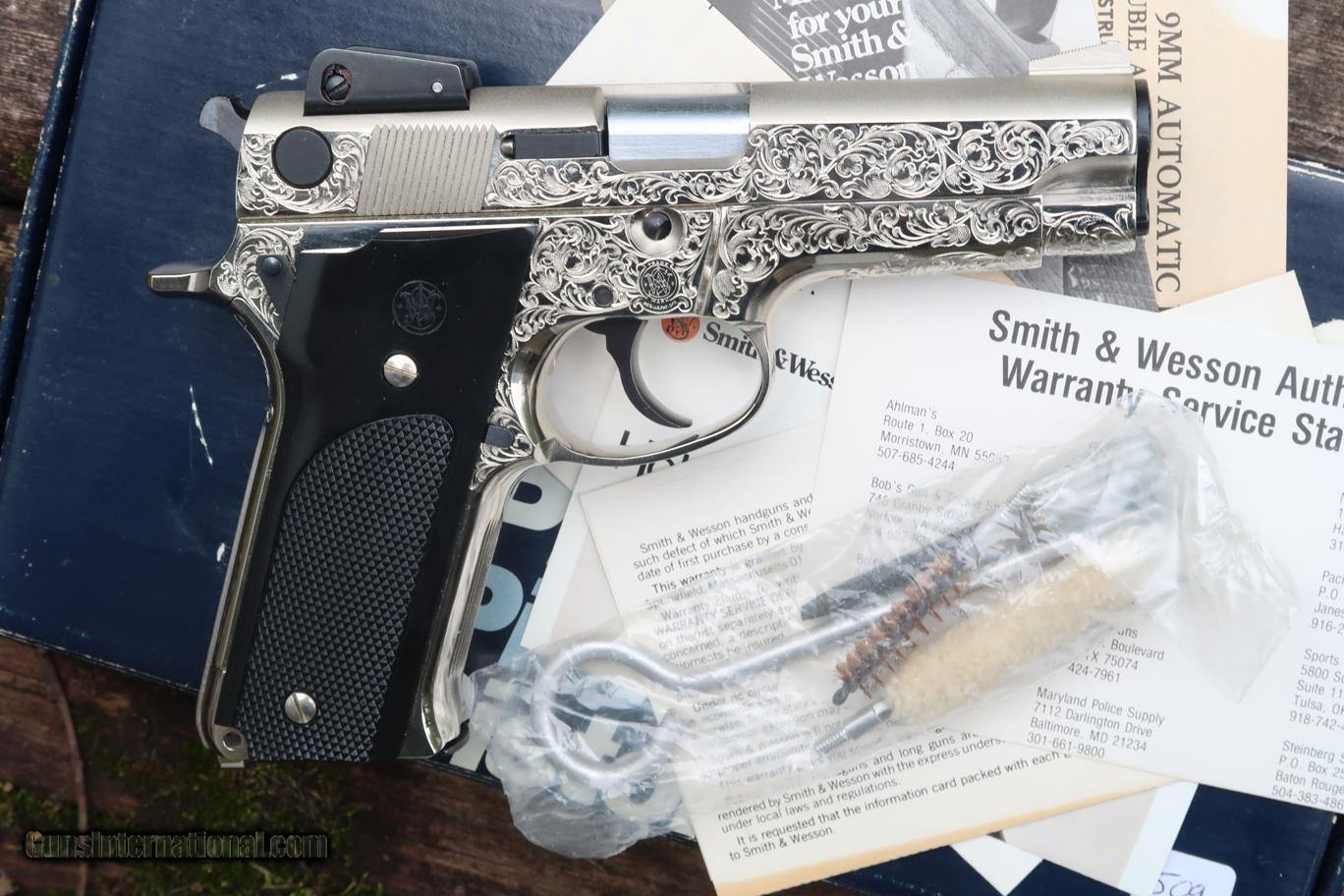 Description: Stunning S&W 559 factory engraved, Nickle Plated, with paperwork, accessories, in factory matching box, with factory letter. Standard configuration 559, a traditional double action in 9mmP, as manufactured from 1980-1983, total number was 10,609. Factory letter cites only 50 pistols were Class A engraved & nickel plated, this one completed on November 15, 1983. Features include a 4” barrel, slide with fixed, serrated front sight and fully adjustable rear sight. Serrated hammer spur, safety/decocker, extended slide release and serrated front & rear grip straps. Checkered mag. release. Lanyard loop at base of frame. Checkered black plastic grips w/ S&W logo. The pistol has been engraved and nickled except for most of the small parts and both 14 shot magazines, still blued, that provide a nice contrast. Complete with factory literature, cleaning accessories, factory matching box, and factory letter dated 1985 which underscores its factory engraving. Synopsis: Smith & Wesson, Model 559, Class A Factory Engraved, as NIB, A768604, A1654 Condition: The pistol presents as BRAND NEW in original matching box which has scuffs as carefully photographed. ~~Insured shipping fee of $75; most packages shipped using FedEx 2nd Day.~~ SOLD Manufacturer: Smith & Wesson Serial Number: A768604 Caliber Info: 9mmP |