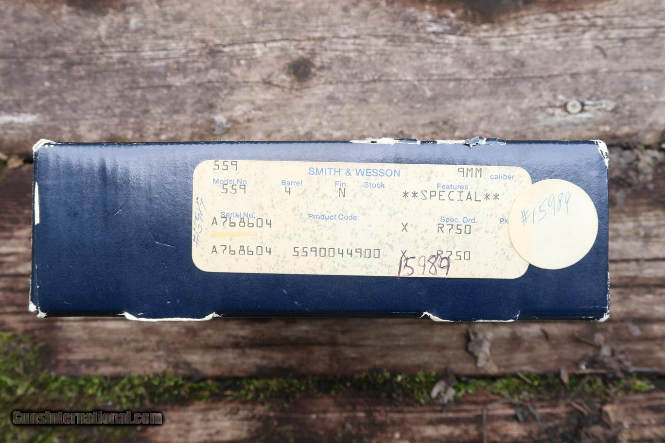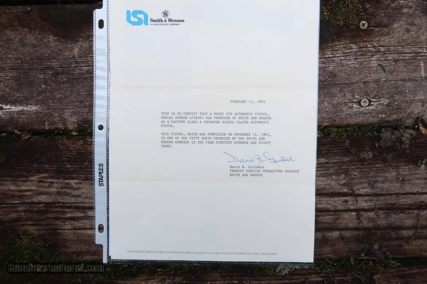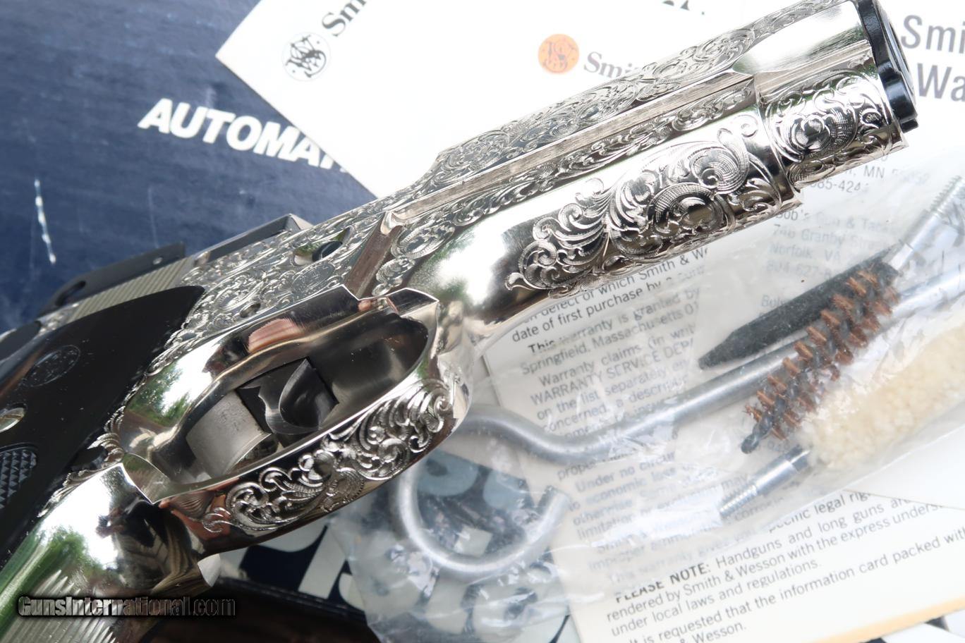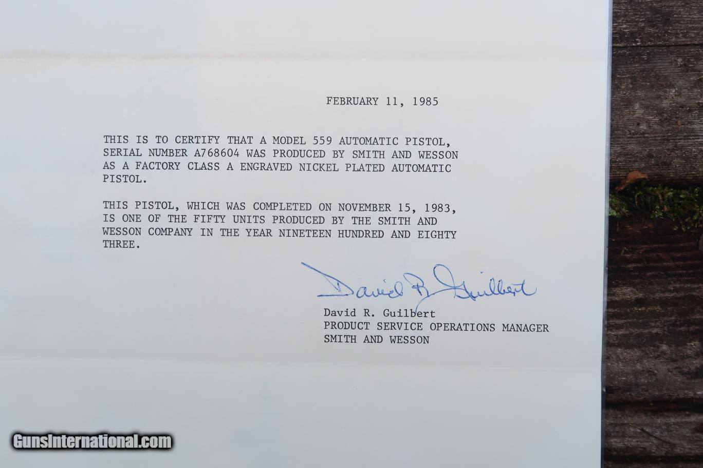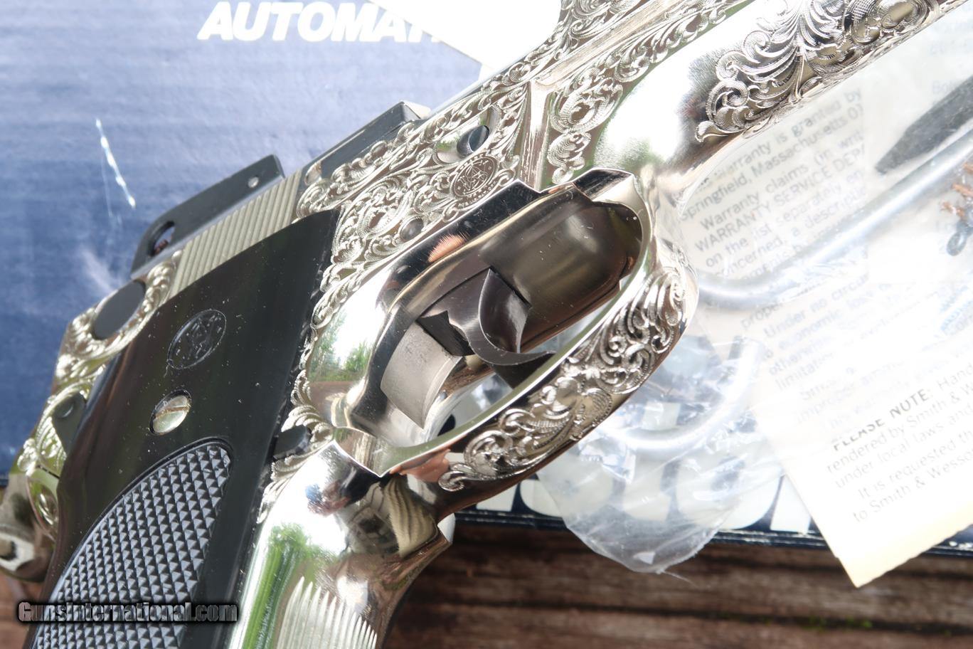 Description: Stunning S&W 559 factory engraved, Nickle Plated, with paperwork, accessories, in factory matching box, with factory letter. Standard configuration 559, a traditional double action in 9mmP, as manufactured from 1980-1983, total number was 10,609. Factory letter cites only 50 pistols were Class A engraved & nickel plated, this one completed on November 15, 1983. Features include a 4” barrel, slide with fixed, serrated front sight and fully adjustable rear sight. Serrated hammer spur, safety/decocker, extended slide release and serrated front & rear grip straps. Checkered mag. release. Lanyard loop at base of frame. Checkered black plastic grips w/ S&W logo. The pistol has been engraved and nickled except for most of the small parts and both 14 shot magazines, still blued, that provide a nice contrast. Complete with factory literature, cleaning accessories, factory matching box, and factory letter dated 1985 which underscores its factory engraving. Synopsis: Smith & Wesson, Model 559, Class A Factory Engraved, as NIB, A768604, A1654 Condition: The pistol presents as BRAND NEW in original matching box which has scuffs as carefully photographed. ~~Insured shipping fee of $75; most packages shipped using FedEx 2nd Day.~~ SOLD Manufacturer: Smith & Wesson Serial Number: A768604 Caliber Info: 9mmP |