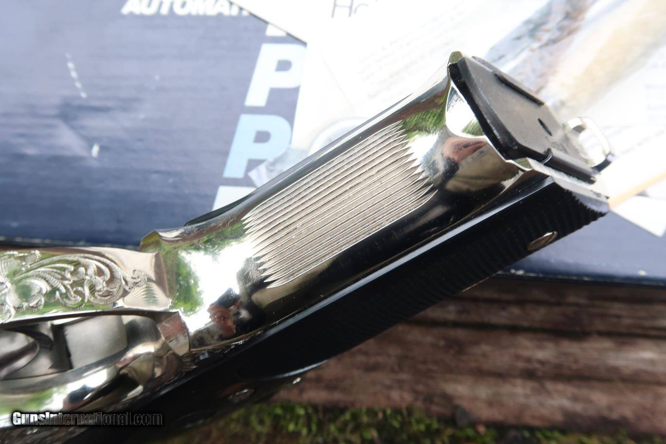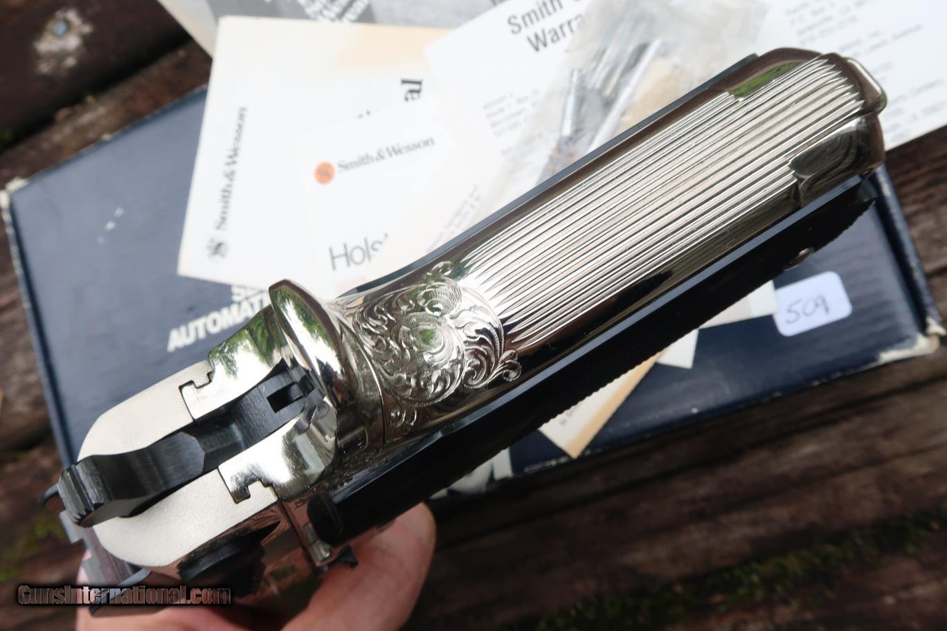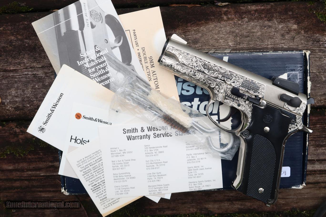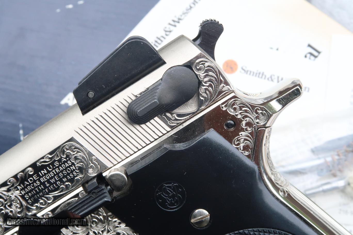 Description: Stunning S&W 559 factory engraved, Nickle Plated, with paperwork, accessories, in factory matching box, with factory letter. Standard configuration 559, a traditional double action in 9mmP, as manufactured from 1980-1983, total number was 10,609. Factory letter cites only 50 pistols were Class A engraved & nickel plated, this one completed on November 15, 1983. Features include a 4” barrel, slide with fixed, serrated front sight and fully adjustable rear sight. Serrated hammer spur, safety/decocker, extended slide release and serrated front & rear grip straps. Checkered mag. release. Lanyard loop at base of frame. Checkered black plastic grips w/ S&W logo. The pistol has been engraved and nickled except for most of the small parts and both 14 shot magazines, still blued, that provide a nice contrast. Complete with factory literature, cleaning accessories, factory matching box, and factory letter dated 1985 which underscores its factory engraving. Synopsis: Smith & Wesson, Model 559, Class A Factory Engraved, as NIB, A768604, A1654 Condition: The pistol presents as BRAND NEW in original matching box which has scuffs as carefully photographed. ~~Insured shipping fee of $75; most packages shipped using FedEx 2nd Day.~~ SOLD Manufacturer: Smith & Wesson Serial Number: A768604 Caliber Info: 9mmP |