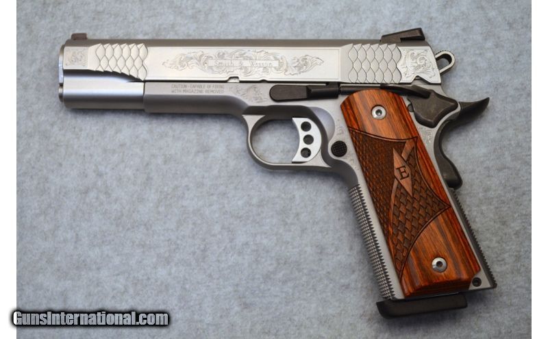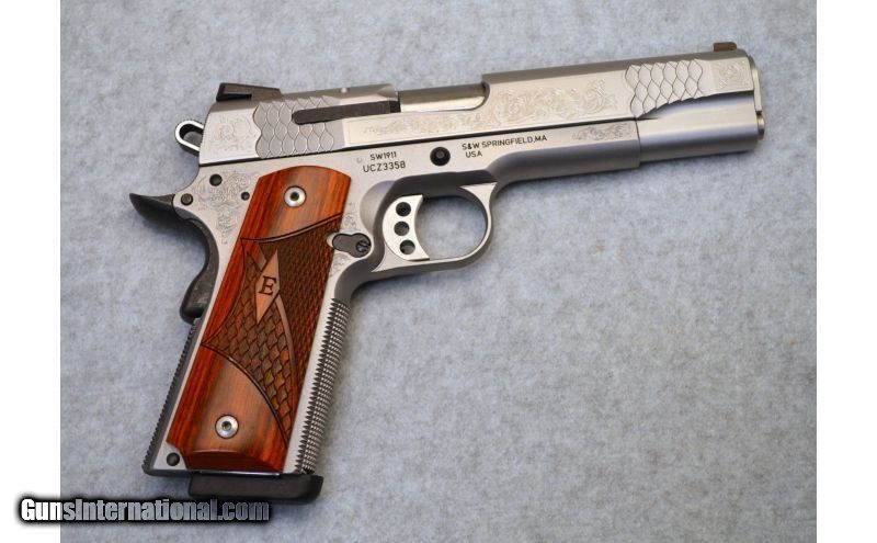 Description: This is a brand new firearm. Box and papers included.Smith & Wesson's Engraved 1911 Centerfire Pistol features scrollwork designed by Smith & Wesson's Master Engraver, transforming the 1911 platform into a timeless piece of art. Detailed artwork is made possible with a diamond-tipped tool for precise engraving on both sides of the stainless steel slide and frame. Glass bead finish and rosewood colored grips further enhance the visual appeal. Excellent balance and fits naturally in your hand. Single-action design. White-dot front sight with a white two-dot rear sight.Firearms are subject to pending sales. • Replies to emails may take 24-72 hours to respond to (excluding weekends). • Although we strive for accuracy, we are not responsible for pictorial, editorial or typographical errors. The pictures provided are the actual pictures of the gun that is for sale, not a stock photo!**DON'T FORGET TO PUT THE FIREARM ON YOUR CABELA'S CLUB VISA AND EARN POINTS TOWARDS YOUR NEXT PURCHASE! ** SOLD Manufacturer: S/N UCZ3XXX Caliber Info: .45 ACP Metal Condition: New Wood Condition: New Bore Condition: New Barrels: 5 Triggers: Factory Stock: Rosewood Grips Weight: 40 oz Sights: White Dot Front / White 2-Dot Rear Item Location: Avon, OH |