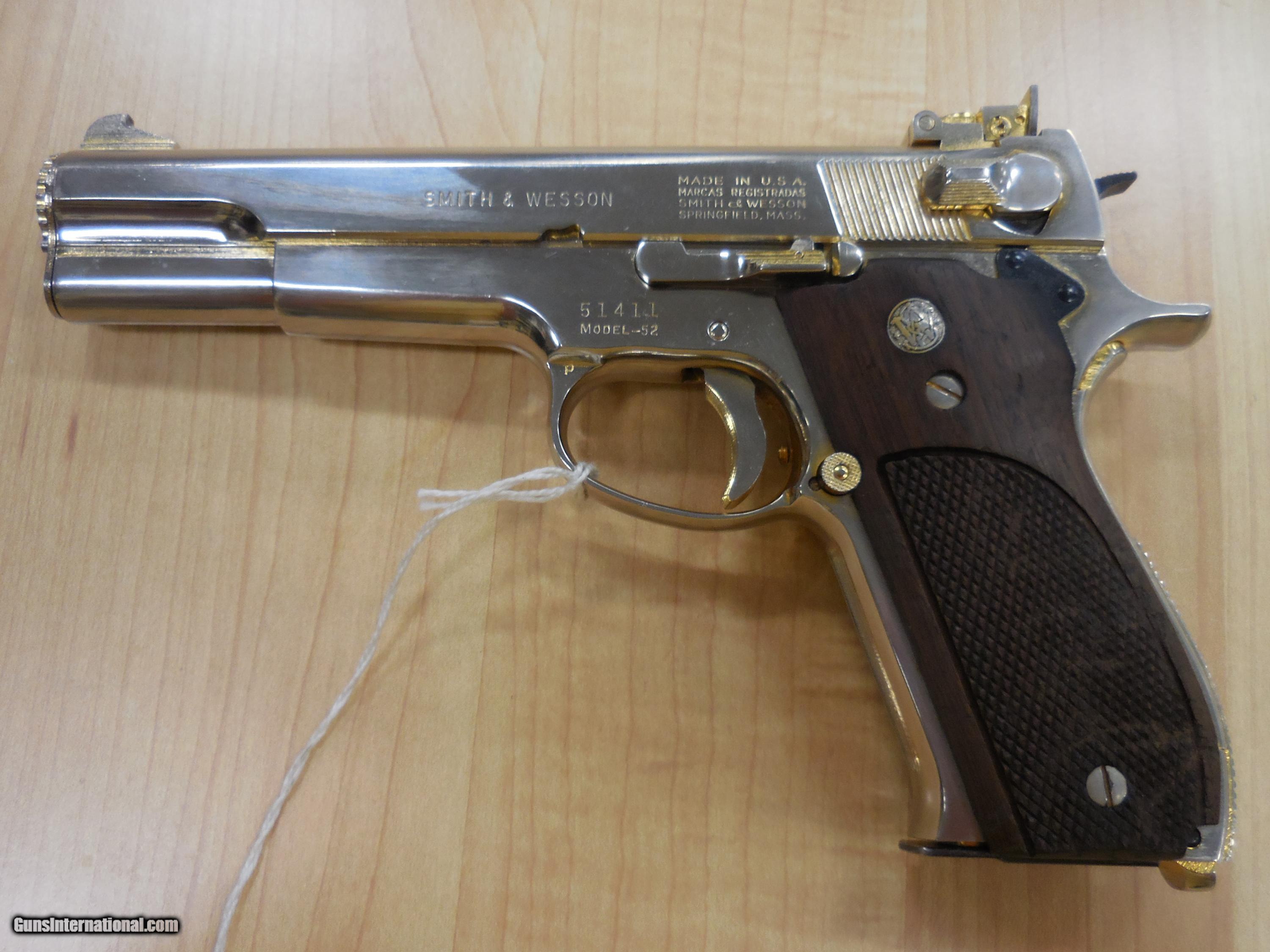Description: HAVE A S&W MOD 52 38 SPL WAD PISTOL EARLY NON DASH VERSION GUN HAS BEEN NICKEL PLATED WITH GOLD APPOINTMENTS 1 MAG NO BOX OVERALL LOOKS GREAT CALL TO ORDER AT 401 738 1889 SOLD |