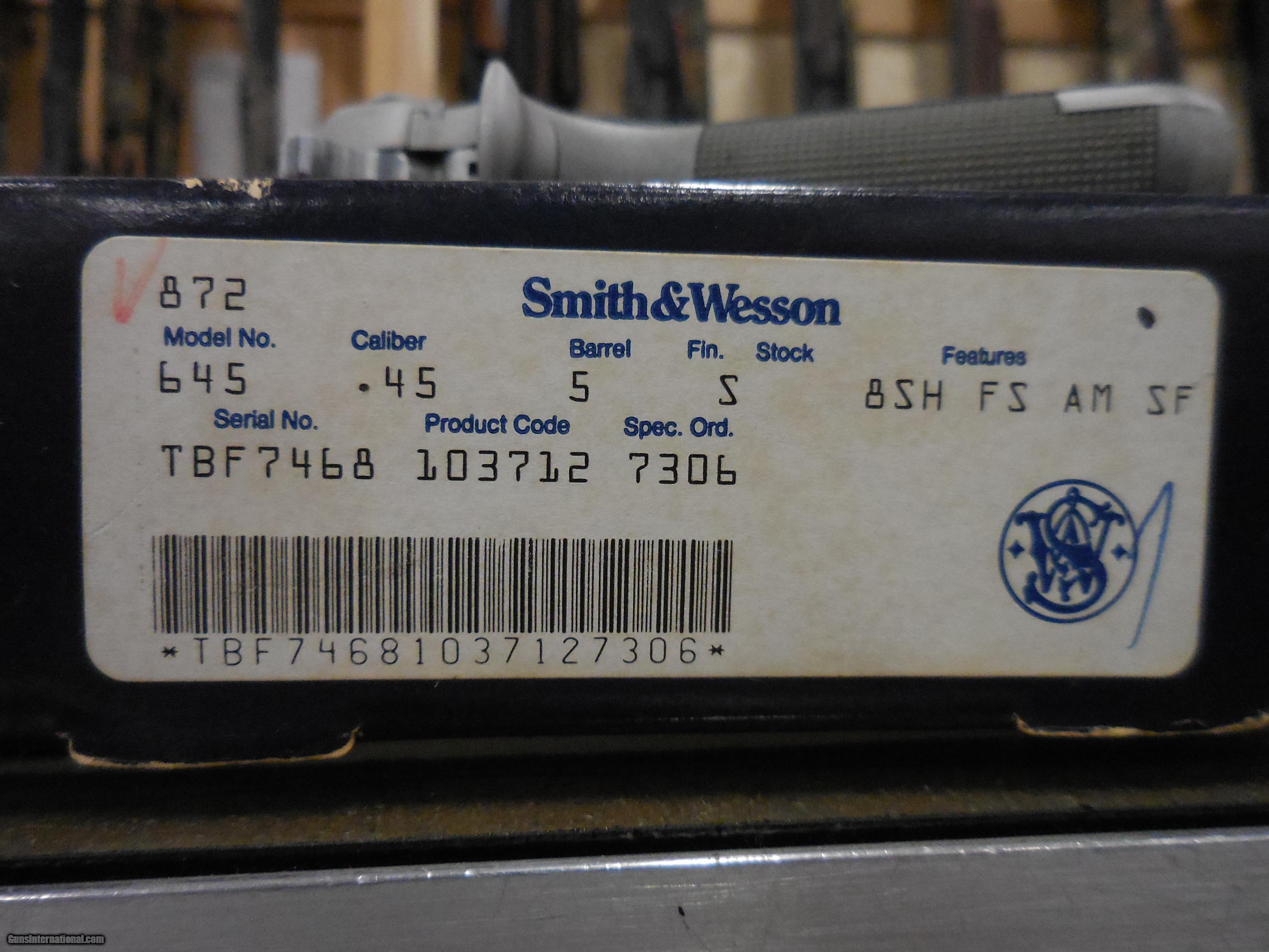 Description: HAVE A S&W MOD 645 STAINLESS 45ACP 5" BBL HAS ENGRAVED SLIDE OVERALL 98% ORIG FINISH IN ORIG BOX 2 MAGS & PAPERS CALL TO ORDER AT 401 738 1889 SOLD |