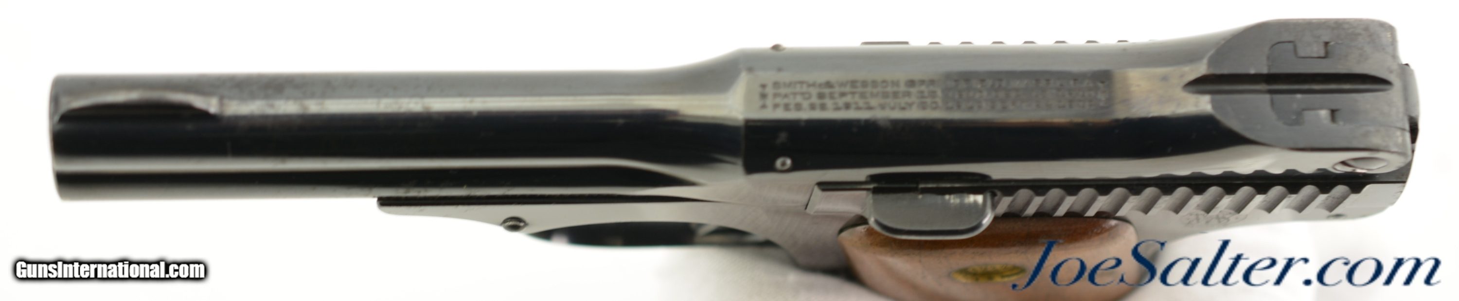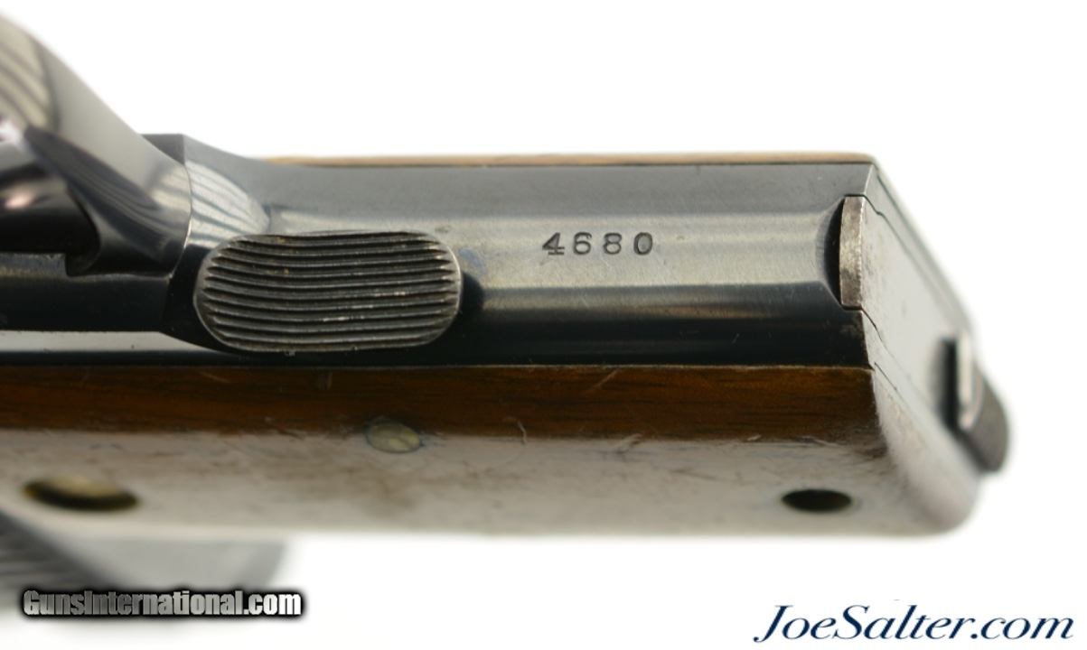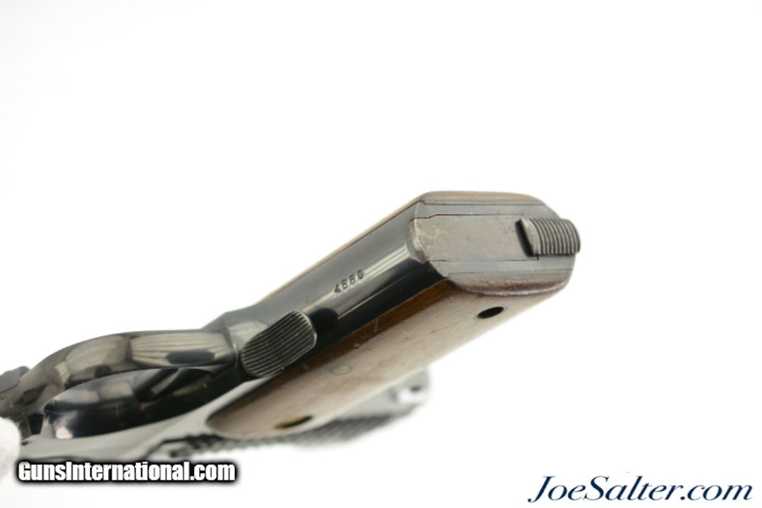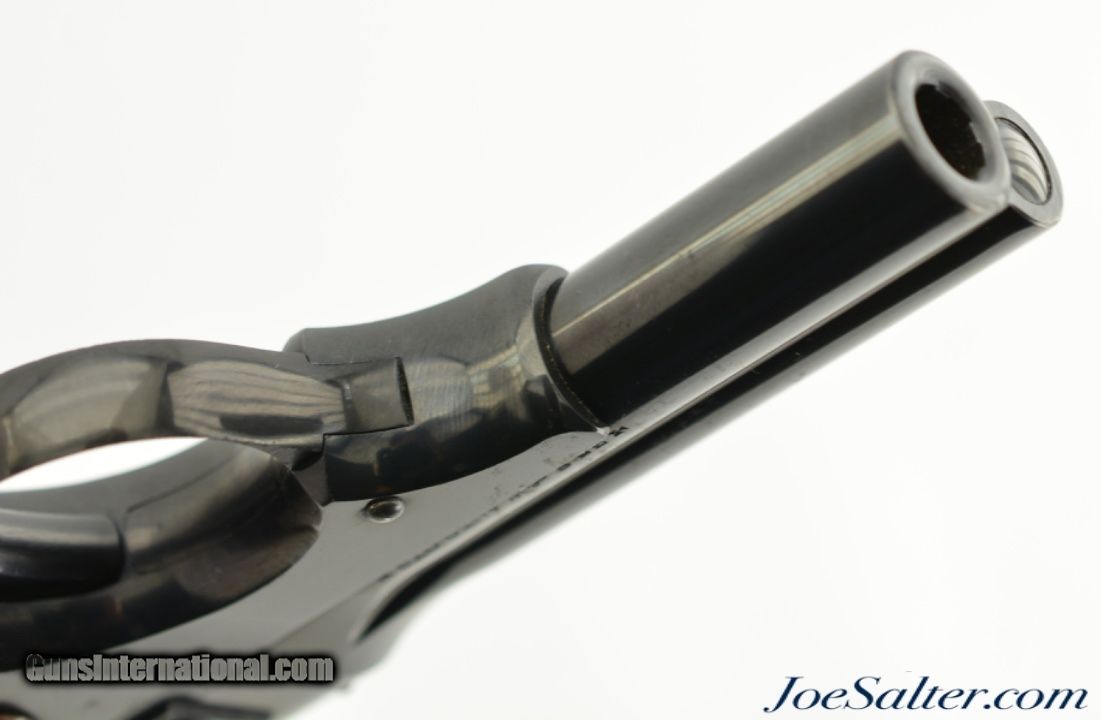 Description: Serial #4680, .35 S&W Auto, 3 1/2" barrel with an excellent, bright bore. This is a handsome pistol that retains about 95-97% of the original blued finish with some trace silvering along the high and projecting edges, as well as some scattered specks of freckling along the rear portion of the frame and slide. The smooth walnut grips have minor handling marks and surface blemishes in the original varnish finish, and a single magazine is included. This is a fine example of a S&W .35 Auto, and would make a great representative example for a collection. FFL or C&R SOLD Curio/Relic: Yes |