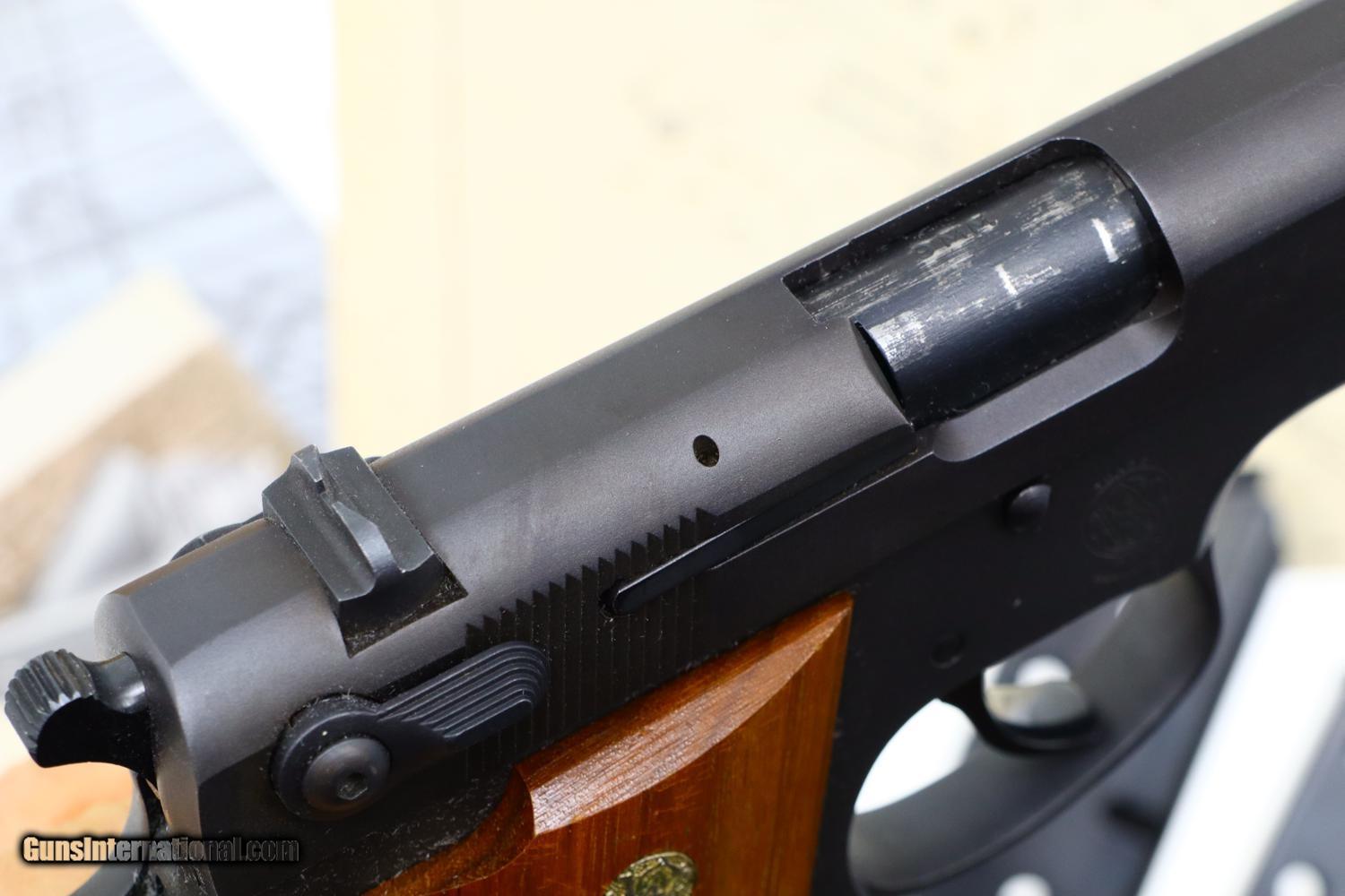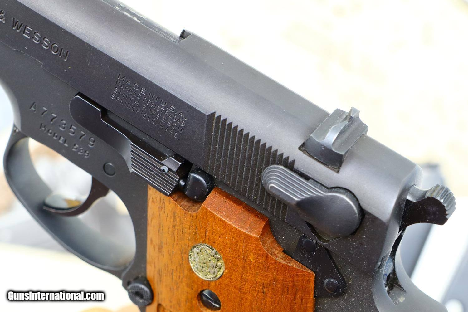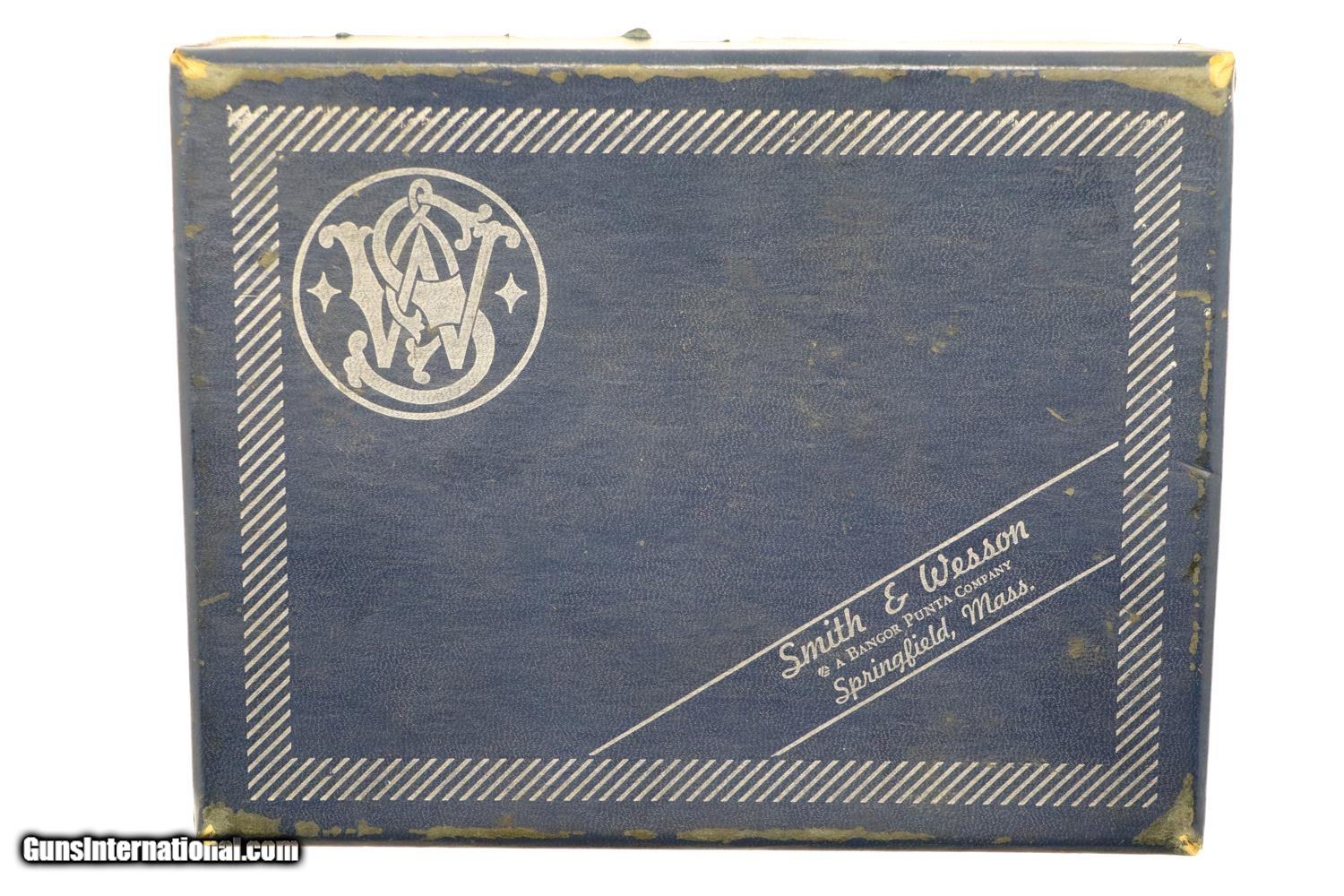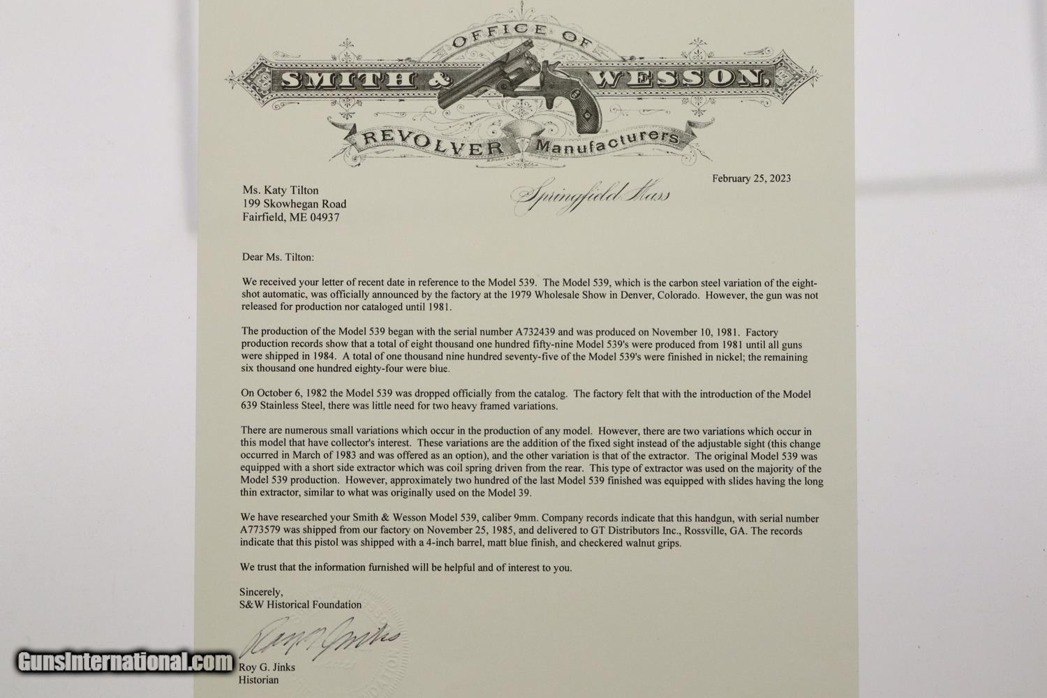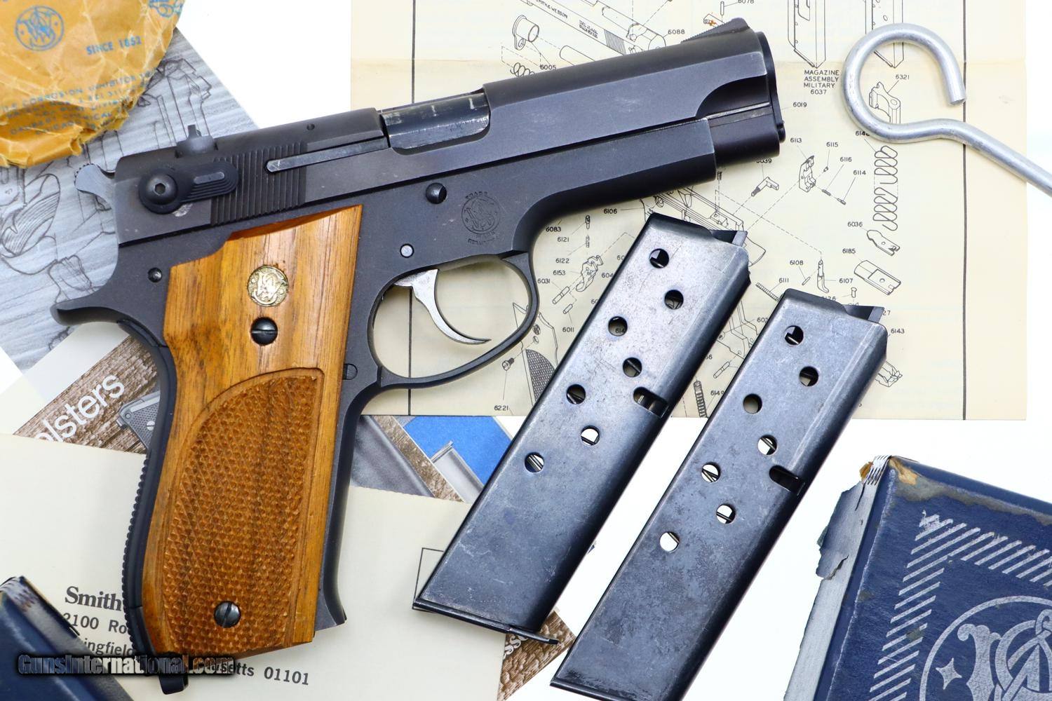 Description: Synopsis: Wonderful, near new, S&W Model 539, 1 of 200 guns to have a long thin extractor. A desirable matte finish version with a fixed rear sight, ensemble complete with spare mag, vintage box, literature, and factory letter! Description: This S&W 539 pistol, in 9mmP, with narrow extractor, fixed rear sight, and matte finish was manufactured in 1982 and shipped Dec. 3, 1985 to G.T. Distributors of Rossville, GA. per June 2007 factory letter as a special ordered pistol, 8159 units 1981-1984. The gun was a steel frame version of the M39 with an ambidextrous safety. They were made in a variety of finishes, one of the most desirable being this matte finish, and fitted with S&W logo walnut grips. Checkered back strap with lanyard loop. This example is unusual in having the long, thin extractor and the fairly scarce fixed rear sight. Complete with spare magazine, earlier vintage box and M39 manual/paperwork, and factory letter signed by Roy G. Jinks. According to Mr. Jinks, this is 1 of 200 guns that featured the long, thin extractor as documented in the accompanying factory letter! Condition: Crisp 99+% original matte finish with comparable condition grips. Mirror bore. Perfect manual mechanics. Scuffed box as pictured. A very tough S&W Model 539 to find! ~~Insured shipping fee of $65; most packages shipped using FedEx 2nd Day.~~ SOLD Manufacturer: S&W Serial Number: A773579 Caliber Info: 9mmP |