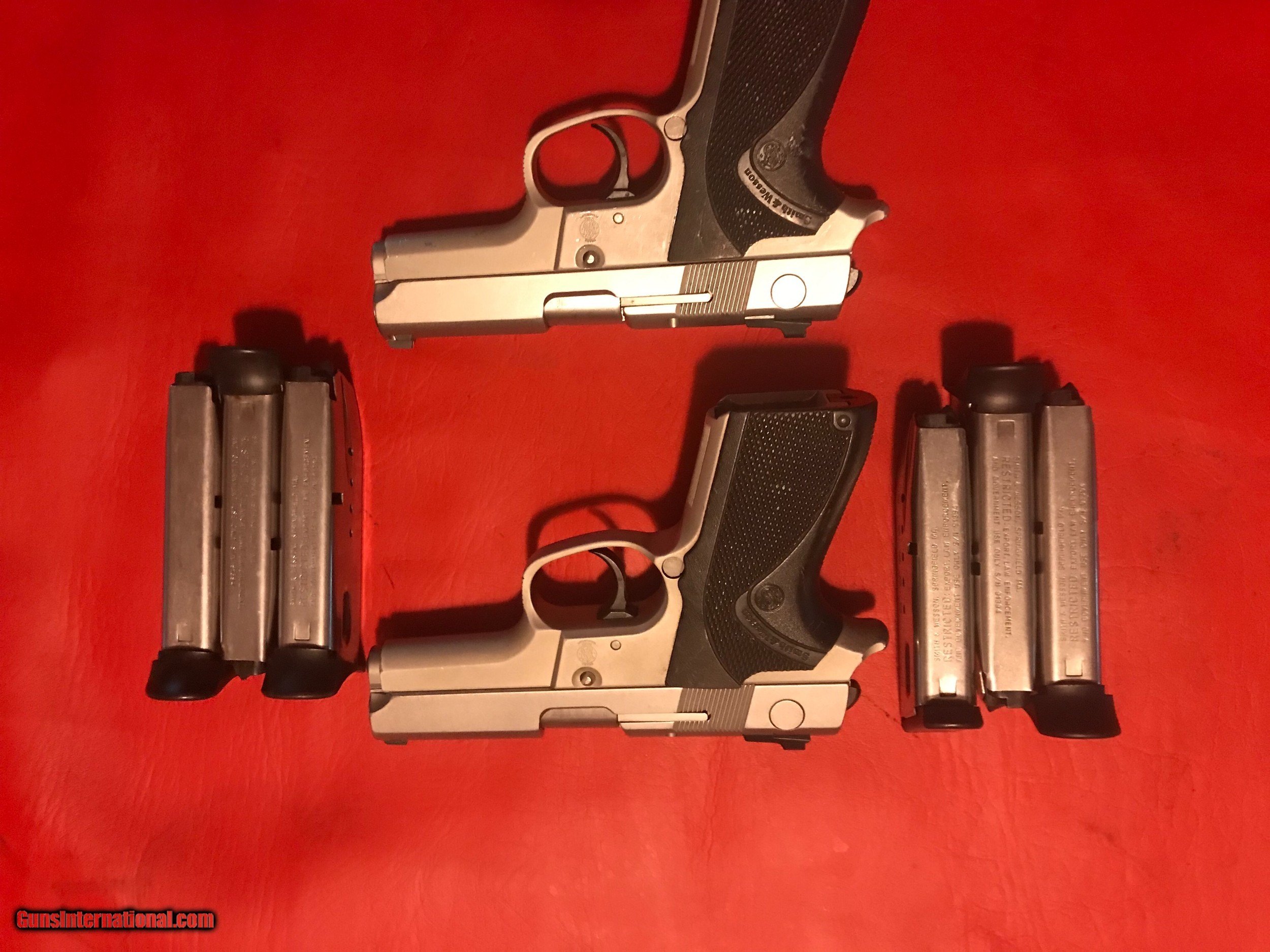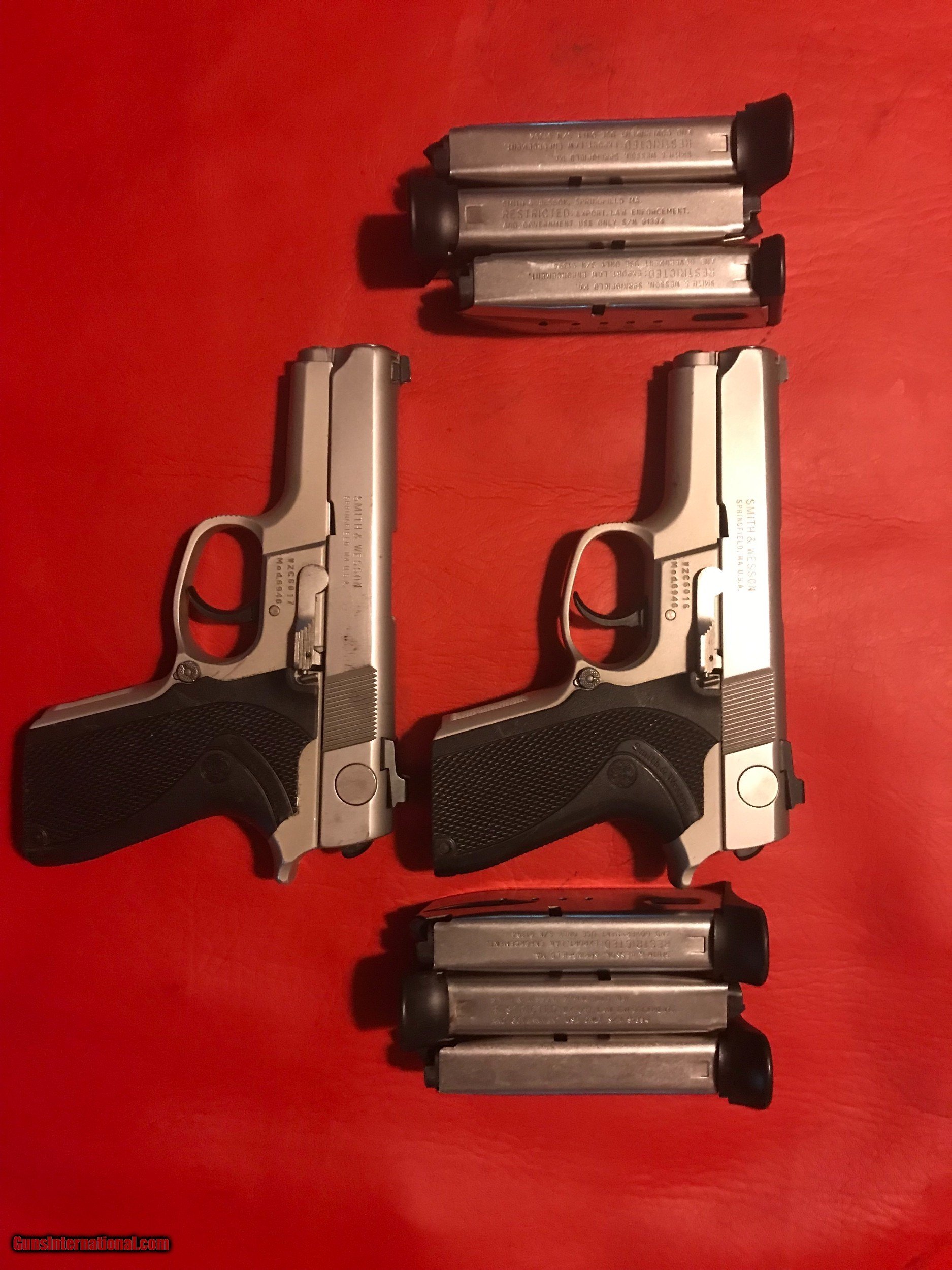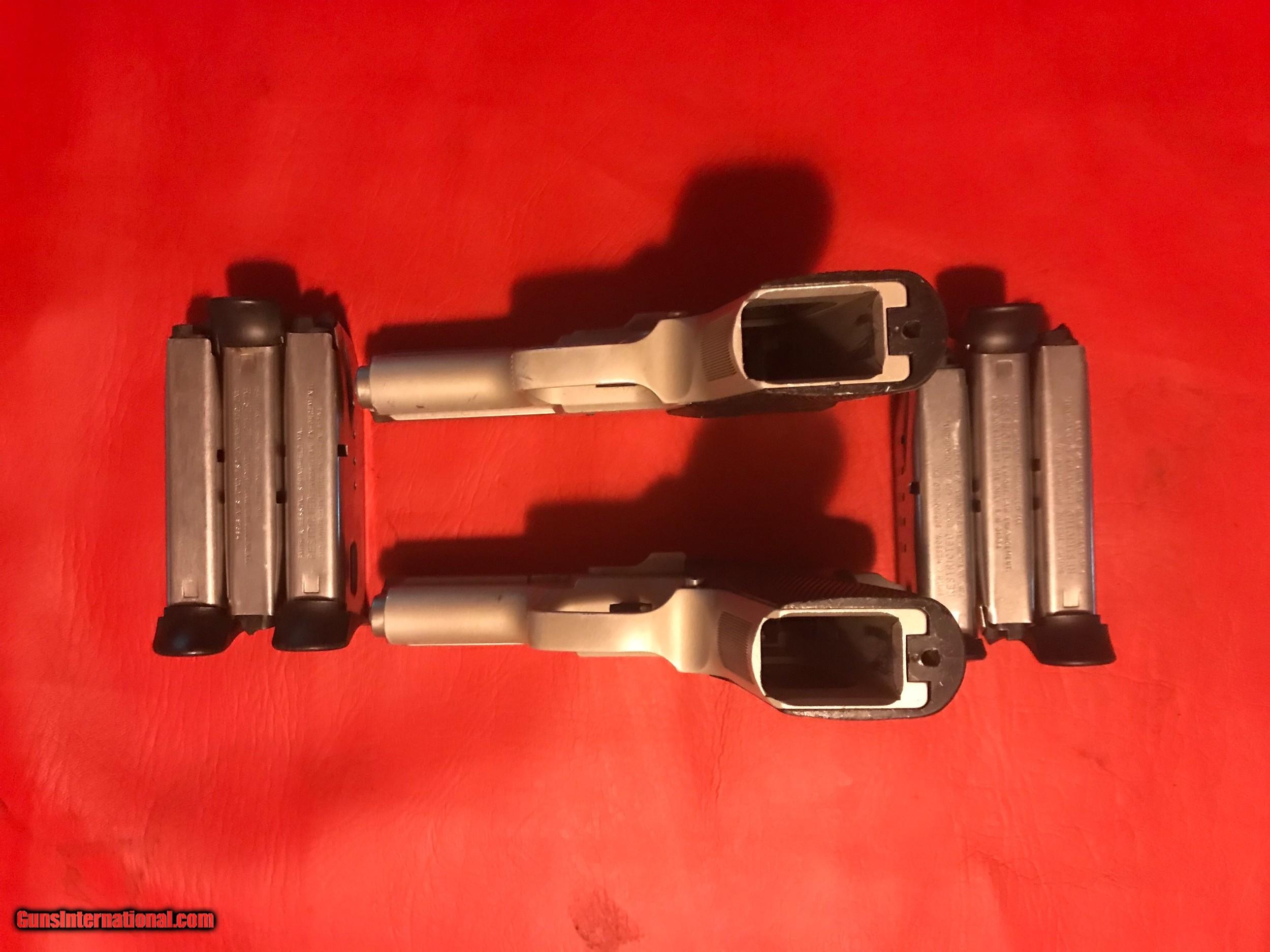 Description: Only 1 left! S&W Model 9646 with consecutive serial numbers. Up for sale are 2, so buy 1 or both! 9mm DAO, 13 round. Stainless steel slide, aluminum alloy. Receiver anodized. Each comes with 3 12round mags. Bore and grips and overall finish are excellent. Function is 100%. Shipping $35. Price is per gun. FFL REQUIRED. DO NOT BUY IF MAG CAPACITY IS AN ISSUE. SOLD |