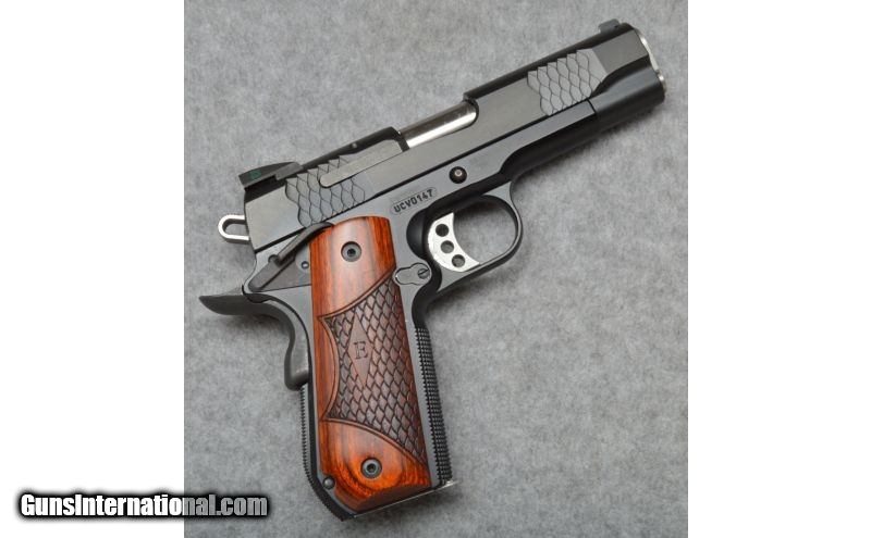 Description: This E-series bobtailed scandium frame 1911 would make an excellent shooter and carry pistol.. SOLD Caliber Info: .45 ACP Metal Condition: Excellent Wood Condition: Excellent Bore Condition: Excellent Barrels: 4 1/4 inch Triggers: Factory skeletonized trigger Stock: Factory wooden laminate E-series fishscale grips Weight: 1 pound 3 ounces Sights: 3 dot white outline night sights Extras: Comes with box and manual Item Location: Fort Mill, SC |