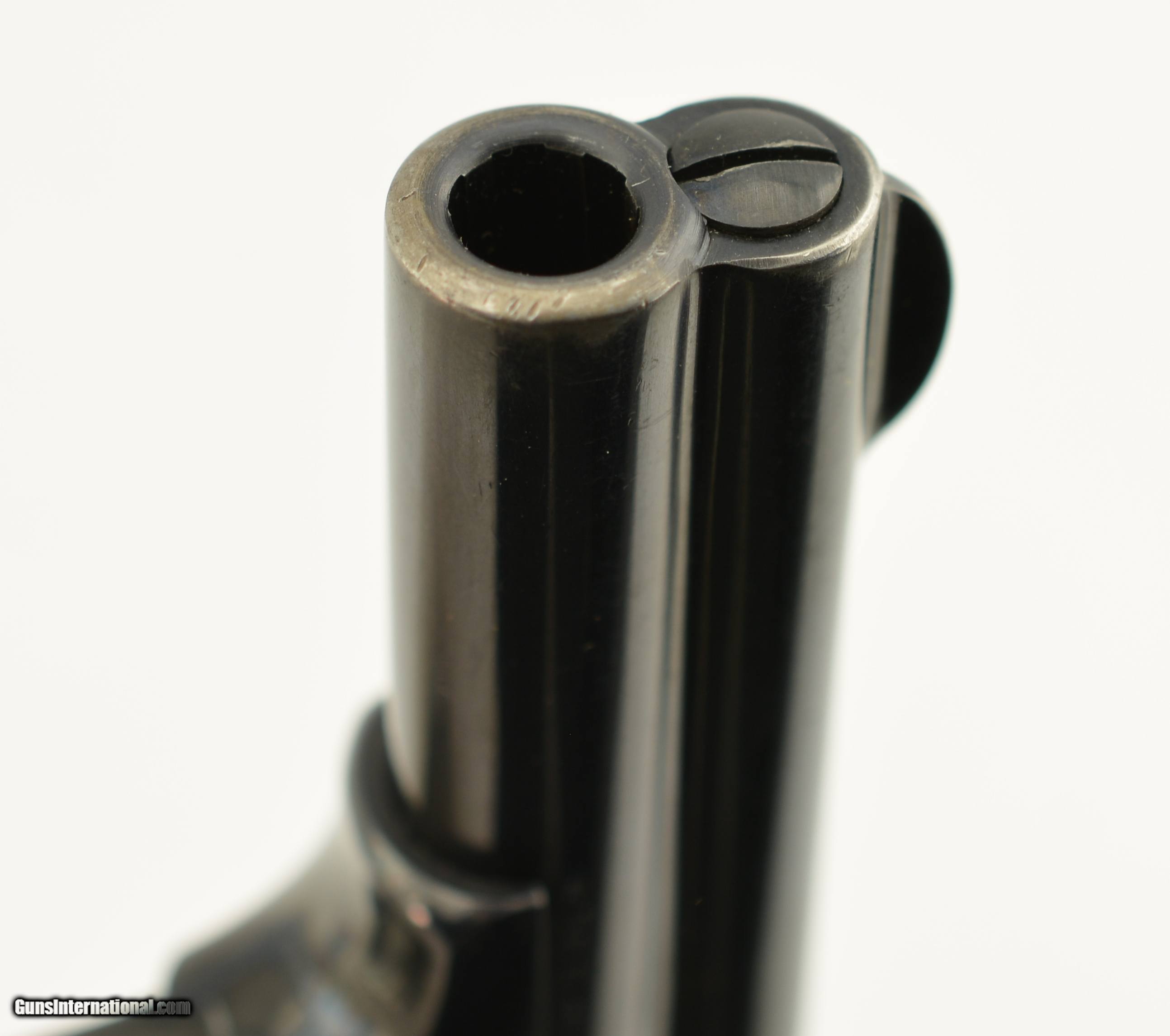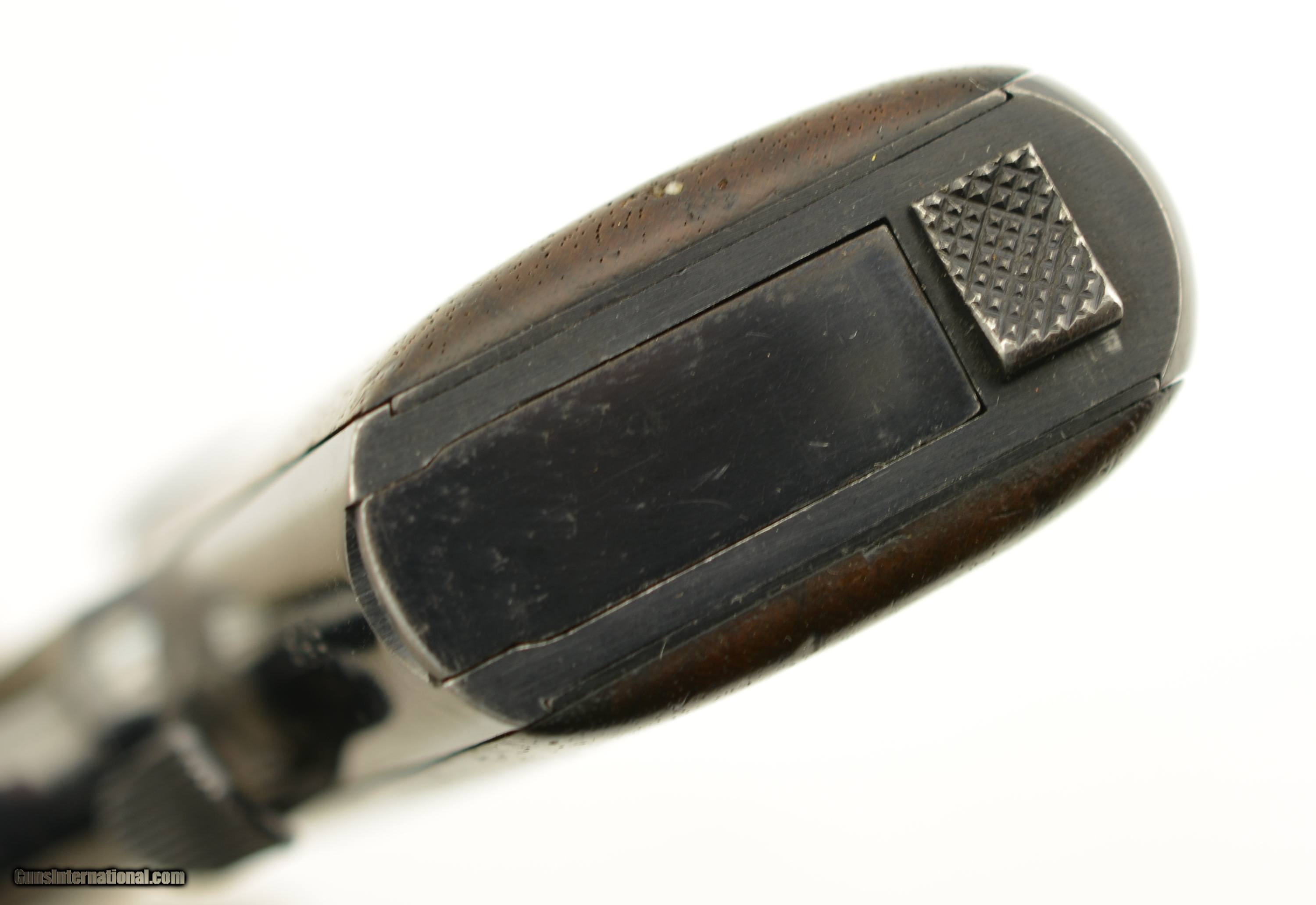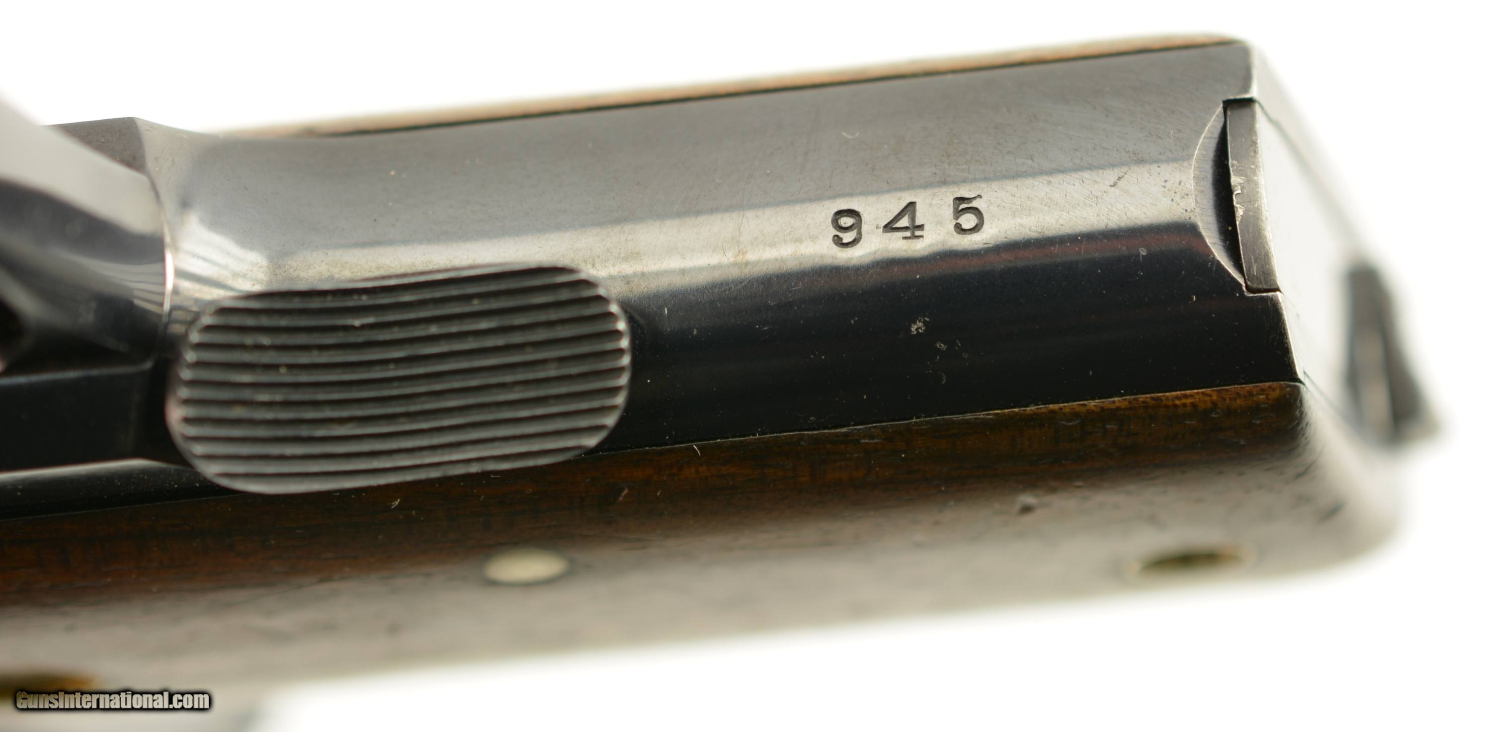 Description: Serial #945, .35 S&W Auto, 3 1/2" barrel with an excellent, bright bore. This first year of production pistol has retained nearly all of the original blue finish, with only some very mild silvering and freckling at the muzzle, and on the sides of the trigger. Some additional silvering is present on the edges of the early type, sideways magazine catch, and the walnut grips have some minor handling marks on either panel. A single original magazine is present. A 2017-dated S&W factory letter accompanies the pistol and lists a shipping date of August 7, 1913, to Peters Arms Co. of Cincinnati, OH. This was a firearms and sporting goods company formed in 1900 by O.E. Peters, president of Peters Cartridge Co. This is a rare, early type Model 1913, and would make a splendid addition to any collection. FFL or C&R SOLD Curio/Relic: Yes Manufacturer: S&W Model: 1913 Serial Number: 945 Caliber Info: .35 S&W Gauge Info: .35 S&W |