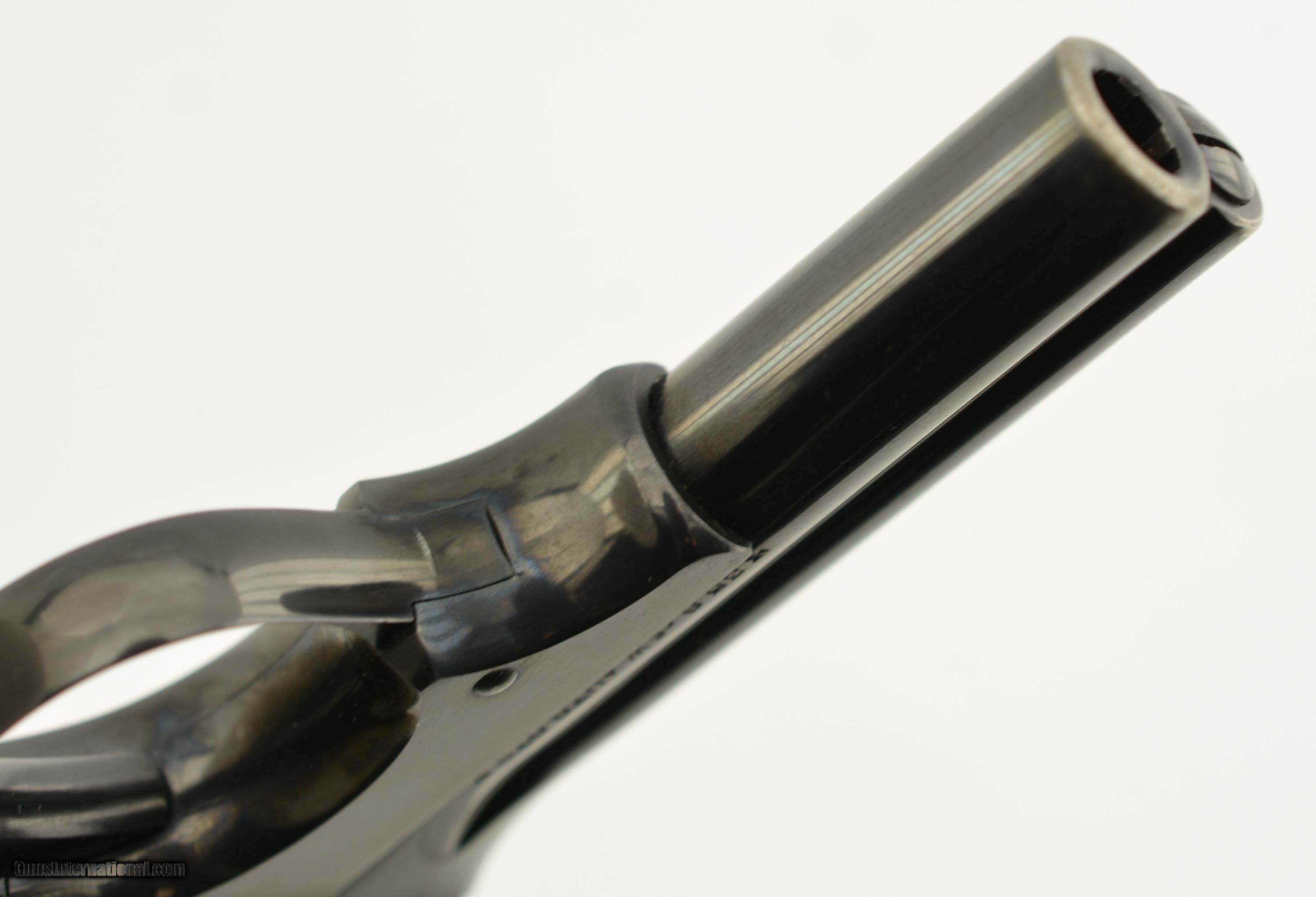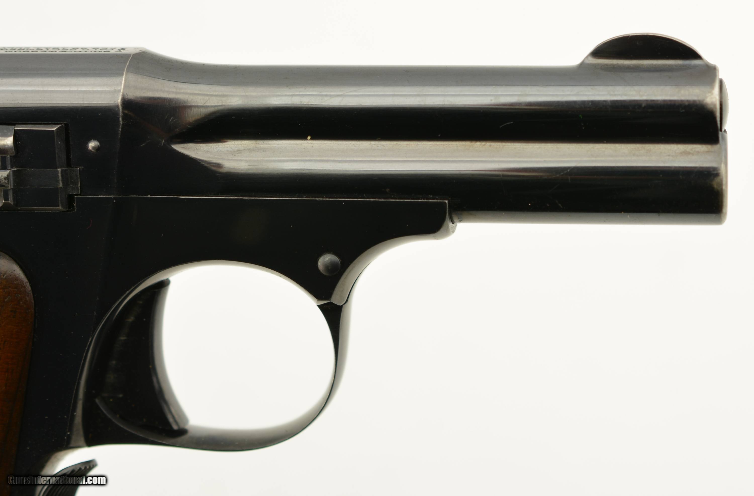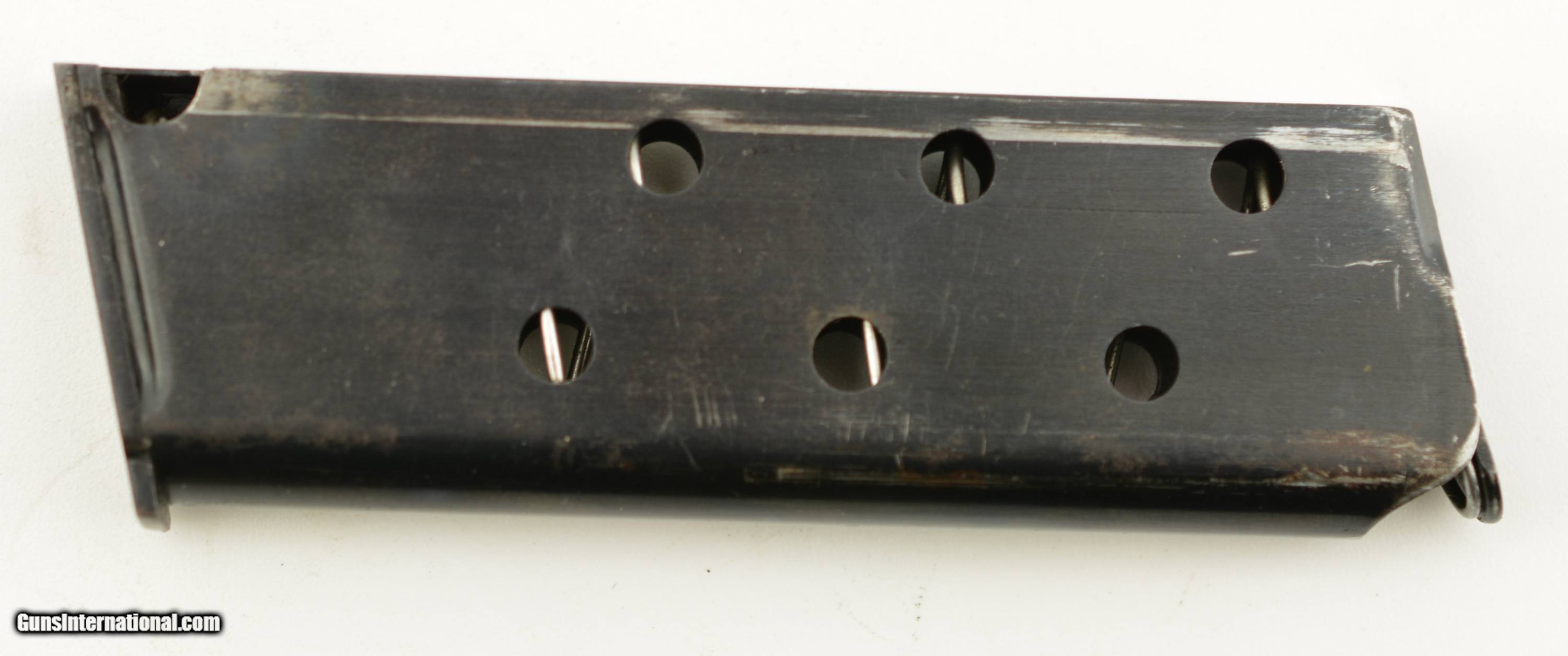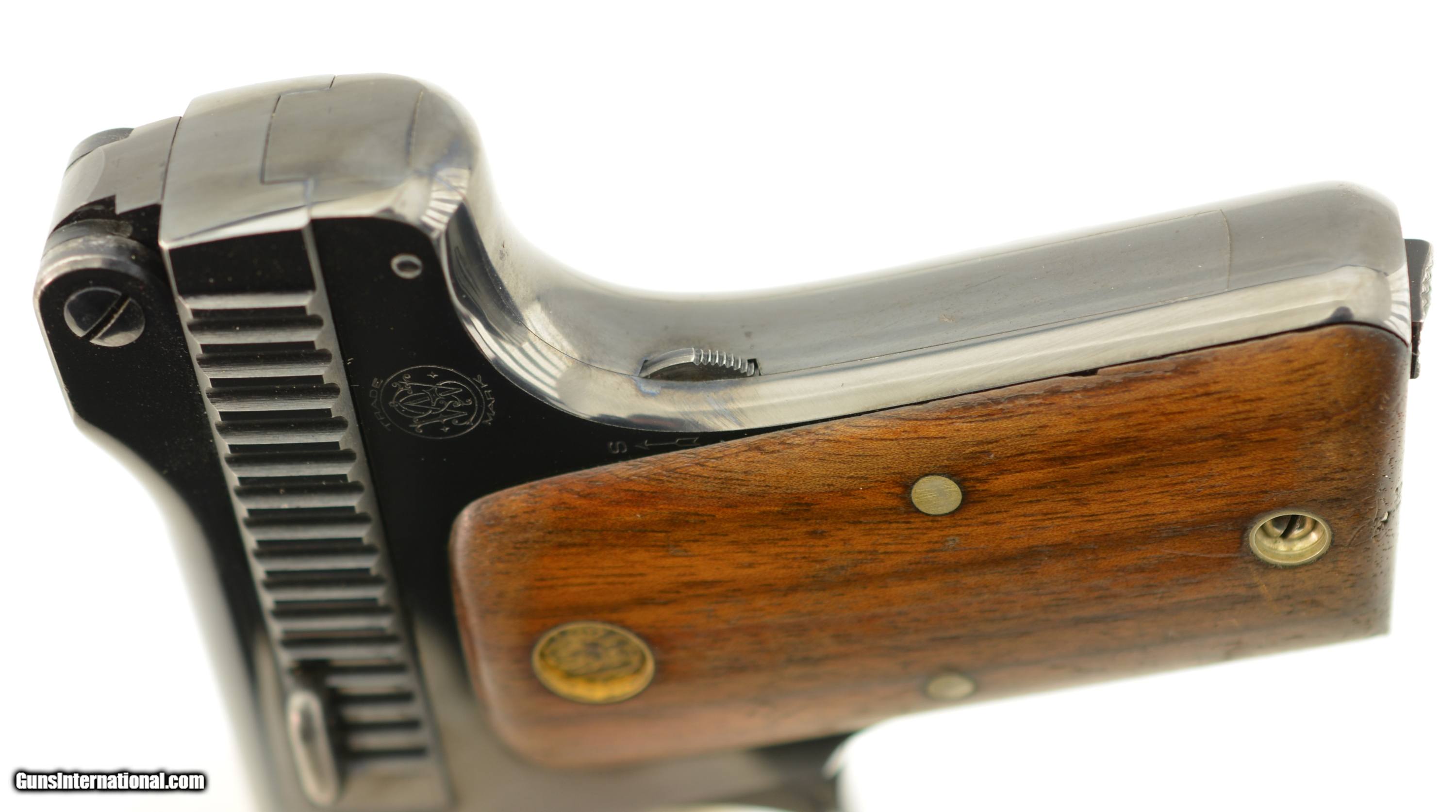 Description: Serial #945, .35 S&W Auto, 3 1/2" barrel with an excellent, bright bore. This first year of production pistol has retained nearly all of the original blue finish, with only some very mild silvering and freckling at the muzzle, and on the sides of the trigger. Some additional silvering is present on the edges of the early type, sideways magazine catch, and the walnut grips have some minor handling marks on either panel. A single original magazine is present. A 2017-dated S&W factory letter accompanies the pistol and lists a shipping date of August 7, 1913, to Peters Arms Co. of Cincinnati, OH. This was a firearms and sporting goods company formed in 1900 by O.E. Peters, president of Peters Cartridge Co. This is a rare, early type Model 1913, and would make a splendid addition to any collection. FFL or C&R SOLD Curio/Relic: Yes Manufacturer: S&W Model: 1913 Serial Number: 945 Caliber Info: .35 S&W Gauge Info: .35 S&W |