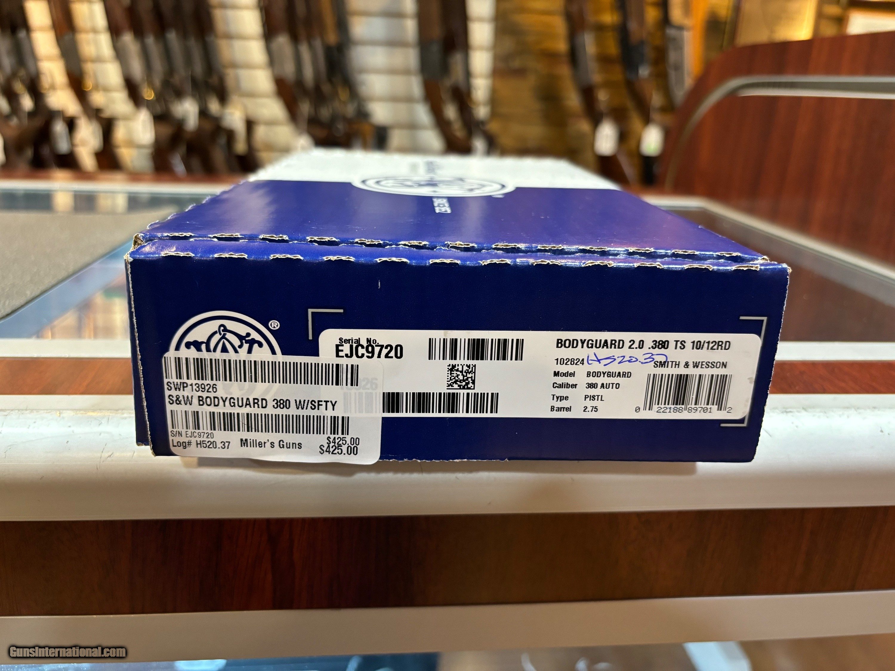 Description: Smith and Wesson Bodyguard 380 2.0 .380 acp MANUAL SAFETY version (1)10 round and (1)12 round magazine included SOLD Handgun Caliber: .380 ACP (9x17mm Browning Short) Manufacturer: Smith and Wesson Model: Bodyguard 380 2.0 Serial Number: EJC9720 Condition: NEW |