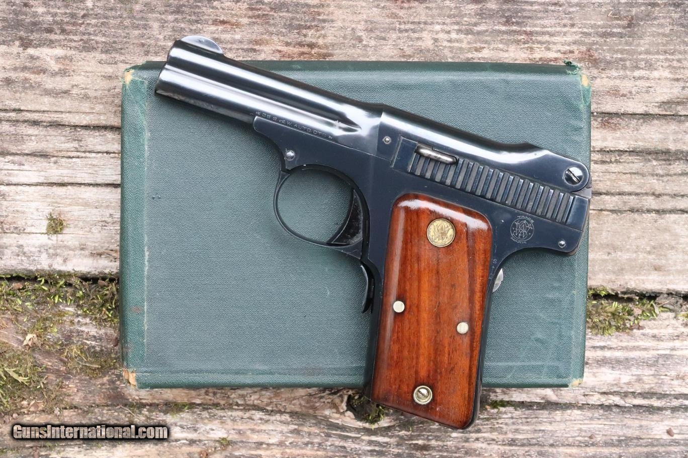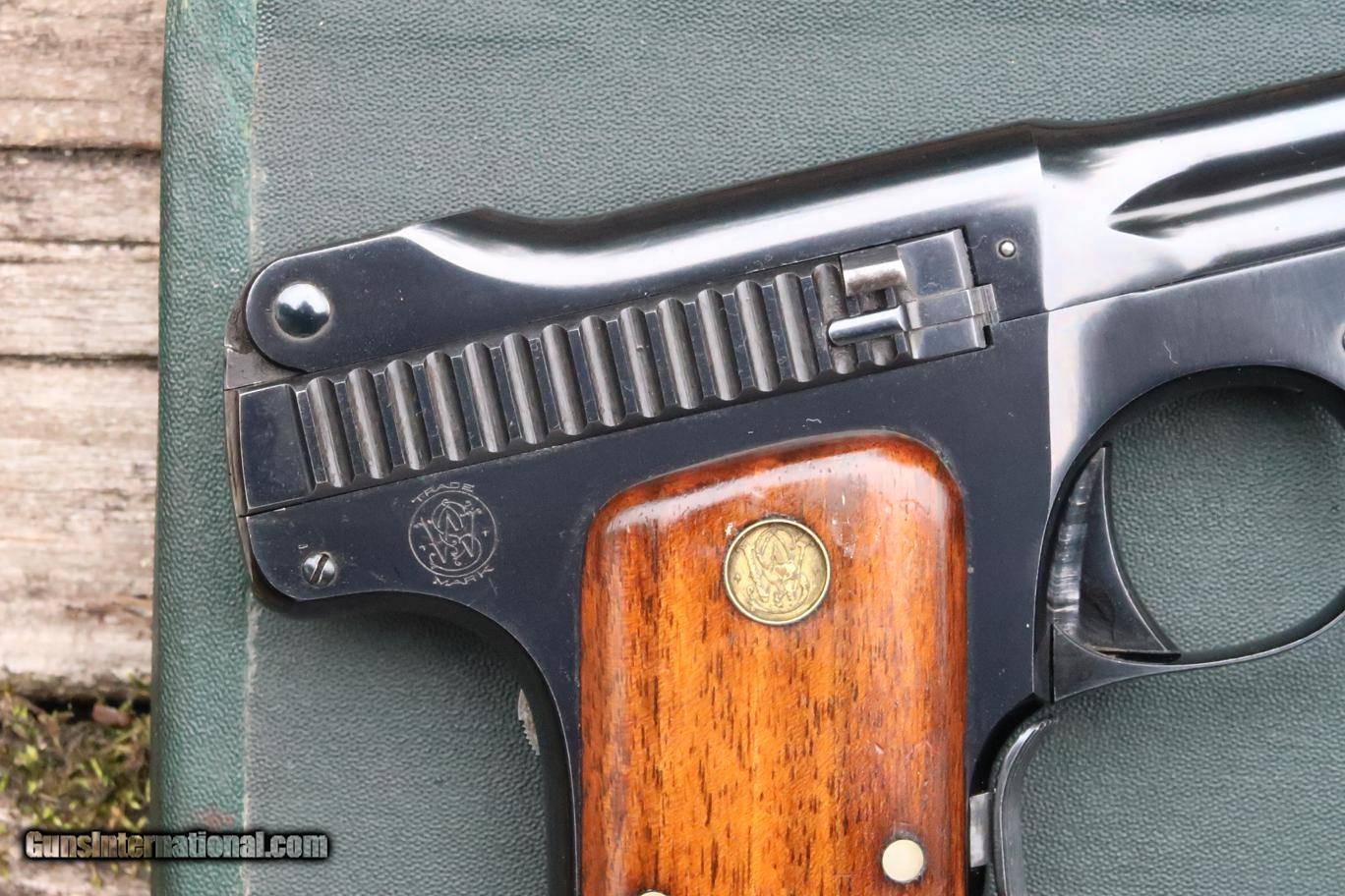 Description: Superb example of S&W’s first semi-automatic pistol, made from 1913-1921, total production about 8,350 pistols. Fixed half moon front sight and notch rear sight. There are two safeties, a revolving cam on the backstrap and a second variation grip safety on the front strap. The top strap is marked with the three line address/patent dates; the left side of the barrel is marked "35 S&W AUTO CTG.", the tang areas on each side of the frame are marked with the S&W Trademark logo, and the serial number is on the front strap. Smooth walnut grips, each panel secured with a single screw at base. Seven round detachable magazine. Complete with an original Smith & Wesson box. Synopsis: Excellent Scarce Smith & Wesson Model 1913 .35 Semi-Automatic Pistol with Box Condition: Excellent+, with over 99% bright polished original blue finish, having only a few tiny handling marks. Mirror bright bore. Perfect manual mechanics. Box is very good with storage and handling marks as well as a separated corner on the lid. A fantastic example of S&W’s first semi-automatic pistol. ~~Insured shipping fee of $65; most packages shipped using FedEx 2nd Day.~~ SOLD Curio/Relic: Yes Manufacturer: Smith & Wesson Serial Number: 312 Caliber Info: .35S&W |