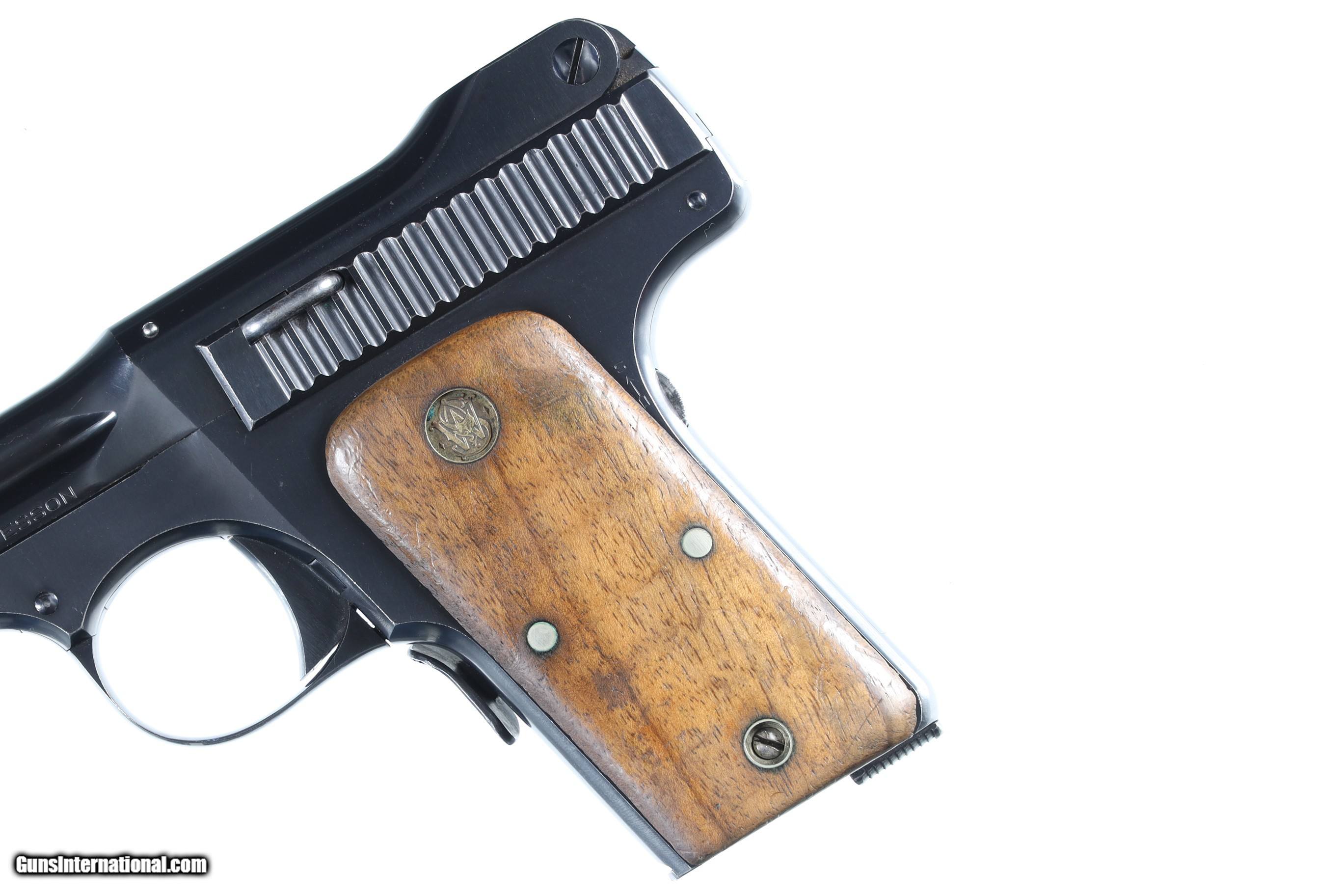 Description: Metal surfaces rate near excellent, handling marks to grips. Manufactured 1913-1921. • Free Shipping, No Credit Card Fees. • Lay-a-way available for this firearm. • 1/3 Down, a 1/3 in 30 Days, 1/3 in 60 Days. SOLD Curio/Relic: Yes Manufacturer: Smith & Wesson Model: 1913 Serial Number: 7892 Barrel Length: 3 1/2 |