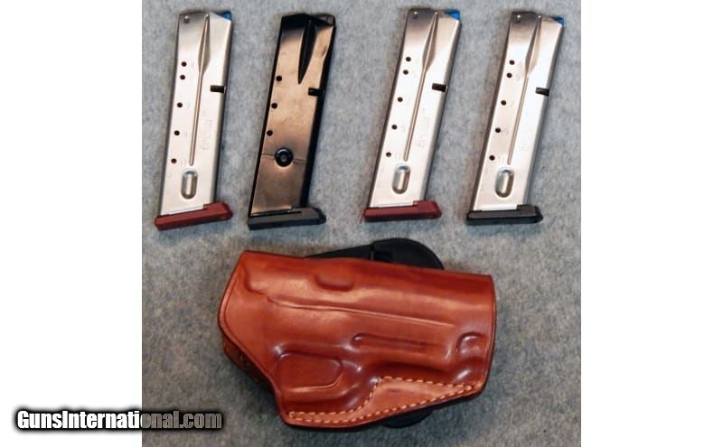 Description: Smith & Wesson ~ 4006 ~ Chambered in .40 S&W. Is a double action hammer fire semiautomatic pistol. Features 4" stainless steel barrel paired with iron sights. Firearm has an ambidextrous slide mounted slide safety, and has a stainless steel finish complimented with black rubber grips. Comes with leather holster, a single 10 + 1 capacity n=magazine, and four 11 + 1 capacity magazines. .40 S&W SOLD Chambers: .40 S&W. Metal Condition: Good condition. Bore Condition: Good condition. Triggers: 8 pounds. Weight: 2.5 pounds Sights: Iron sight. Item Location: Acworth, GA |