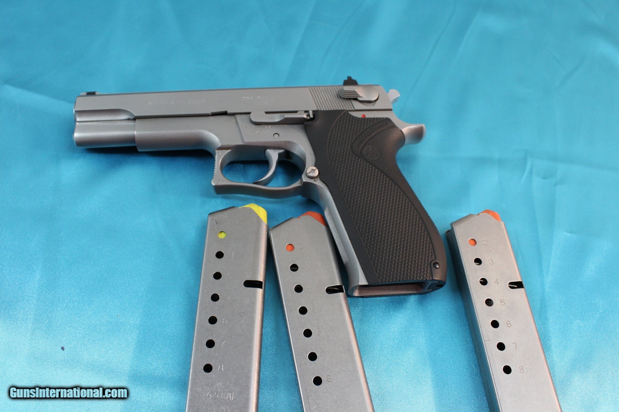 Description: Guns Listing ID: 1400930 The Smith & Wesson Model 4506 is a third-generation semi-automatic pistol from Smith & Wesson‚‚s 4500 series of handguns. The 4506 is chambered for the .45 ACP cartridge and, with the purchase of special springs, the stronger .45 Super. It is constructed almost entirely from stainless steel and is thus extremely resistant to harsh weather conditions. The 4506 is a traditional double-action/single-action pistol. The first shot is fired in double-action mode. Each subsequent shot is fired in single-action mode. It features one-piece Xenoy wrap-around grips with either a curved or straight back strap. The 4506 was produced from 1988 to 1999. Like most 3rd generation Smith & Wesson semi automatic pistols, the 4506 features a combination safety lever and decocker mounted on the slide, a plunger type firing pin safety, a magazine disconnect and a pin mounted, pivoting spring actuated external extractor SOLD Manufacturer: SMITH & WESSON Model: 4506 Caliber Info: .45 ACP Condition: Used - Non-Certified Barrels: 5 BARREL Finish: STAINLESS |