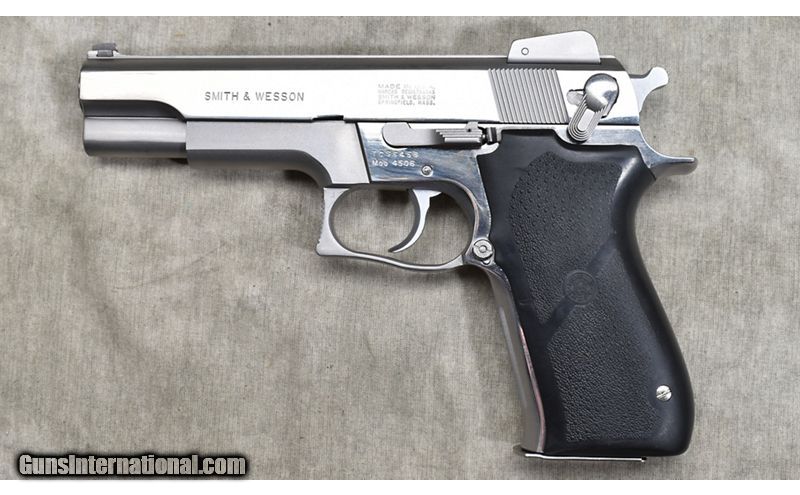 Description: The Model 4506 features a bright stainless slide and matte stainless steel frame, a wide trigger inside an oversize guard, single/double action and has a combination ambidextrous safety and decocker. .45 ACP SOLD Chambers: 8-round detachable magazine Metal Condition: Excellent. There a few fine scratches Wood Condition: Excellent. Bore Condition: Shiny and bright with good rifling. Barrels: 5-inch Triggers: Factory single and double action trigger. Butt Pad: Two sets of hard black plastic and one set of soft black rubber. Weight: 40 oz Sights: Post and guarded notch "iron" sights. Item Location: Rogers |