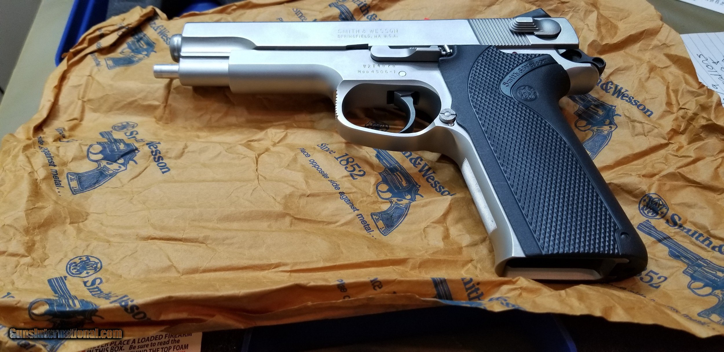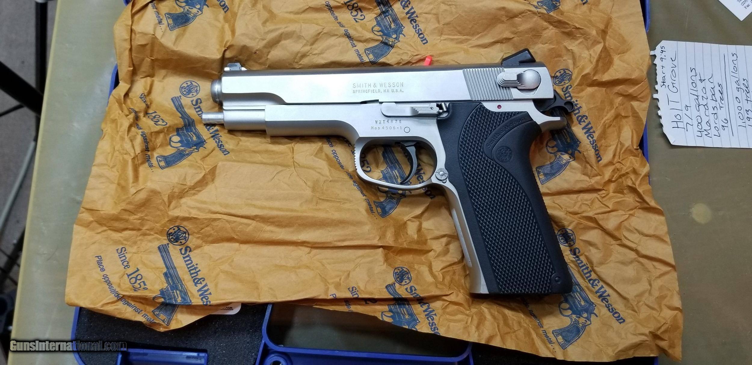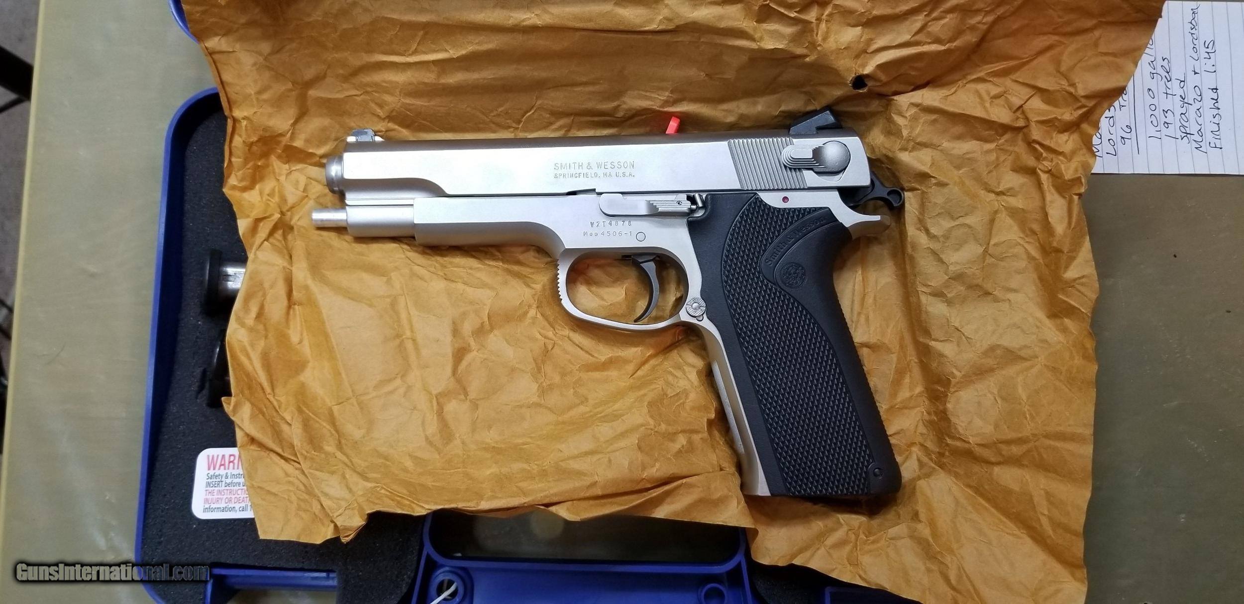Description: S&W 4506 WITH BOX WITH PAPERS AND TWO FACTORY MAGAZINES 45.00 INSURED SHIPPING WITH TRACKING NUMBERS SOLD Handgun Caliber: .45 ACP (.45 Auto) Manufacturer: SMITH& WESSON Model: 4506 Barrel Length: 5 Condition: EXCELENT Metal Condition: EXCELENT |